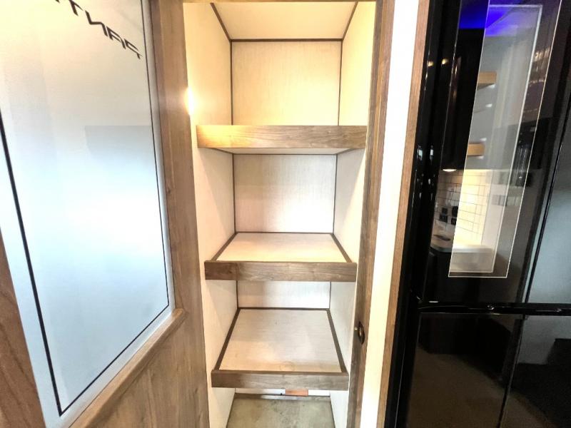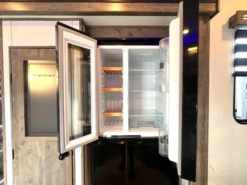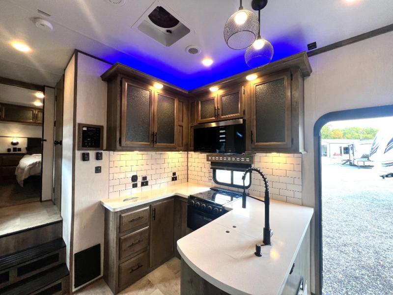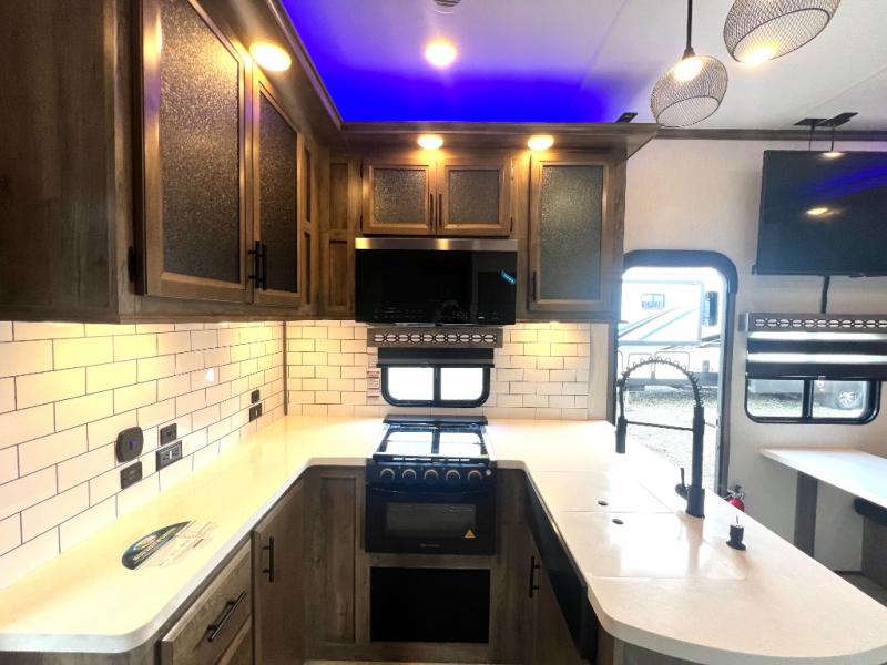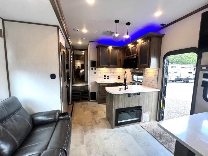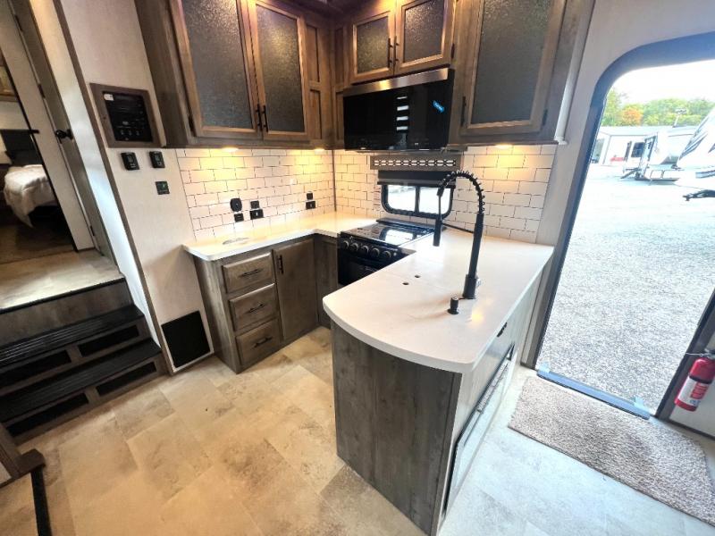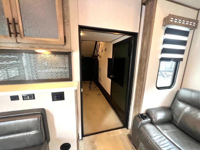 The whole gang can join in on the fun with this fifth wheel toy hauler! Everyone will have a comfortable place to sleep between the king bed in the front private bedroom, the raised queen bed above the flip-up sofas with table in between, and the loft, plus you can even use the sofa in the living area. The large kitchen pantry is big enough to hold your favorite snacks and the dinette with bench is another place to enjoy your meals comfortably. A few other conveniences you will appreciate include dual entry doors, a dual entry bathroom, two 15' power awnings, and 14' 6" of cargo space!