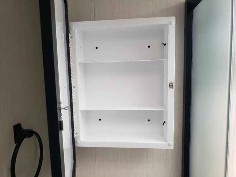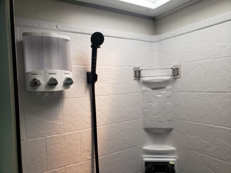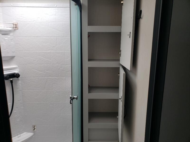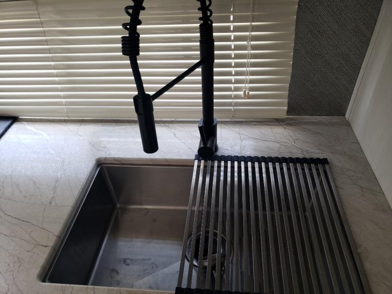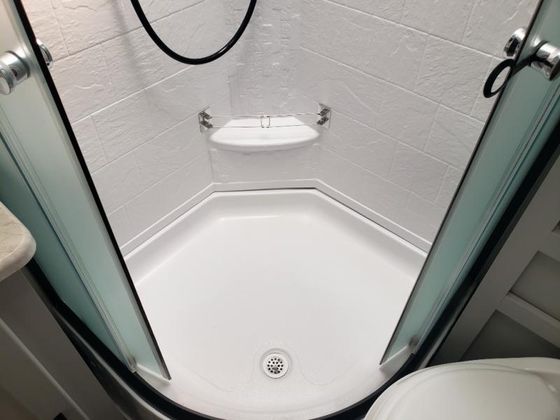 Step inside and you’re greeted with a bright, modern interior featuring panoramic windows, a spacious rear bath, and an open living area that maximizes every inch. The residential-inspired kitchen includes solid-surface countertops, premium cabinetry, a large stainless-steel sink, and plenty of storage for extended trips. The full bathroom offers a generous shower, ample counter space, and room to move around comfortably, making it one of the standout features of this floorplan.