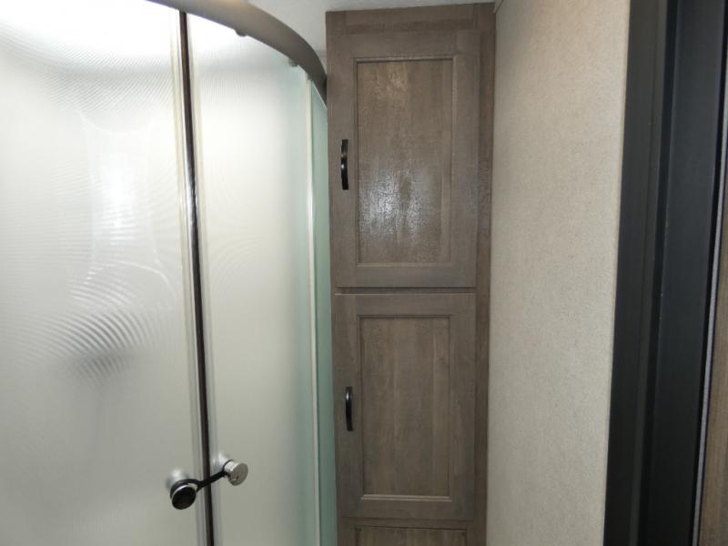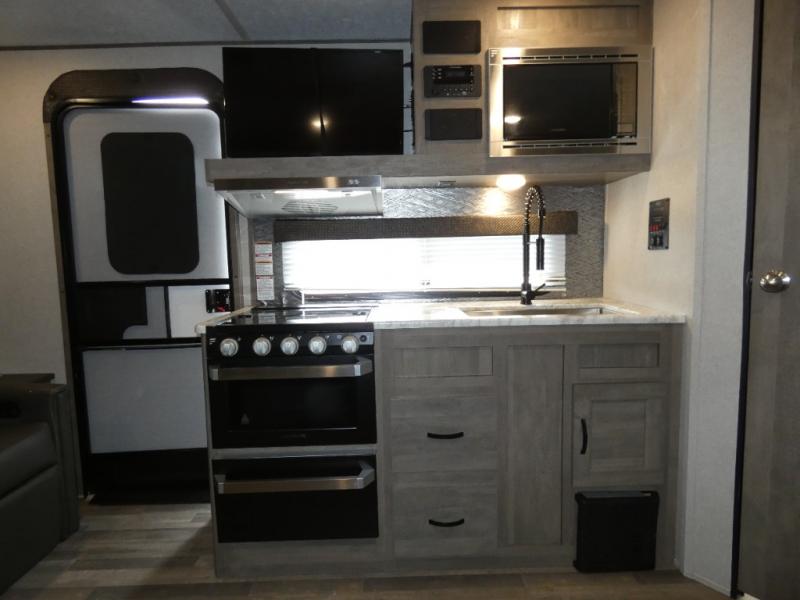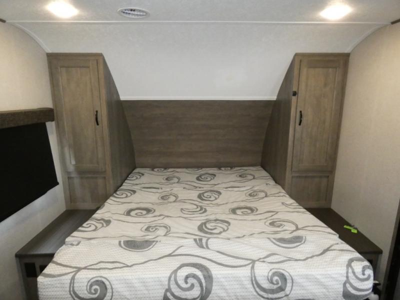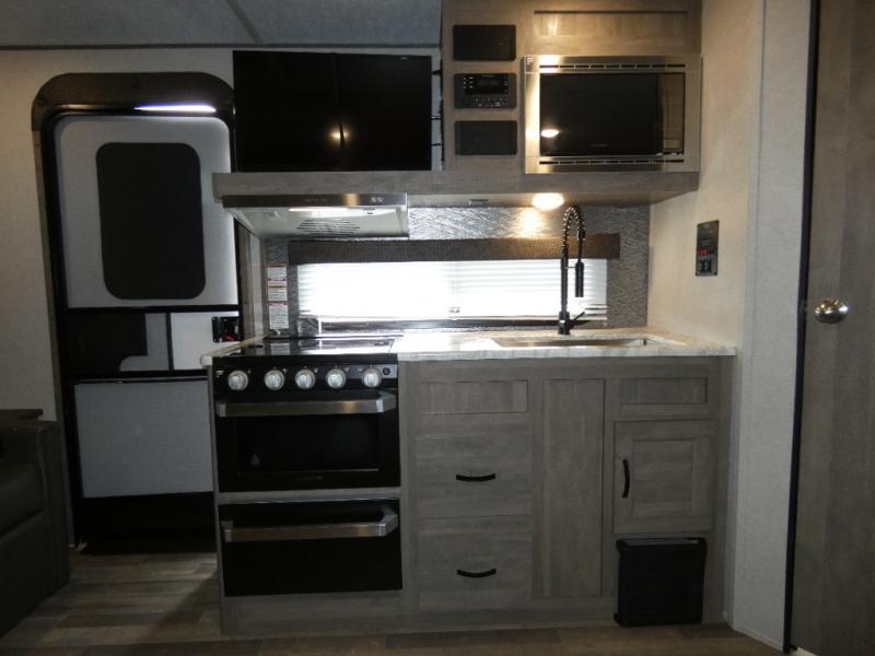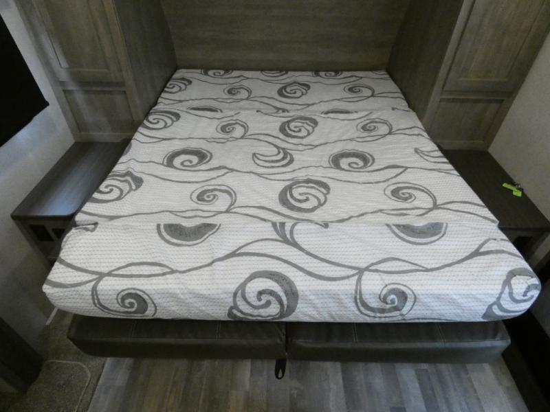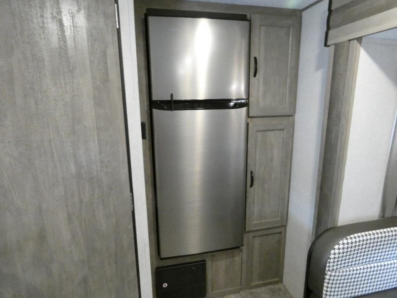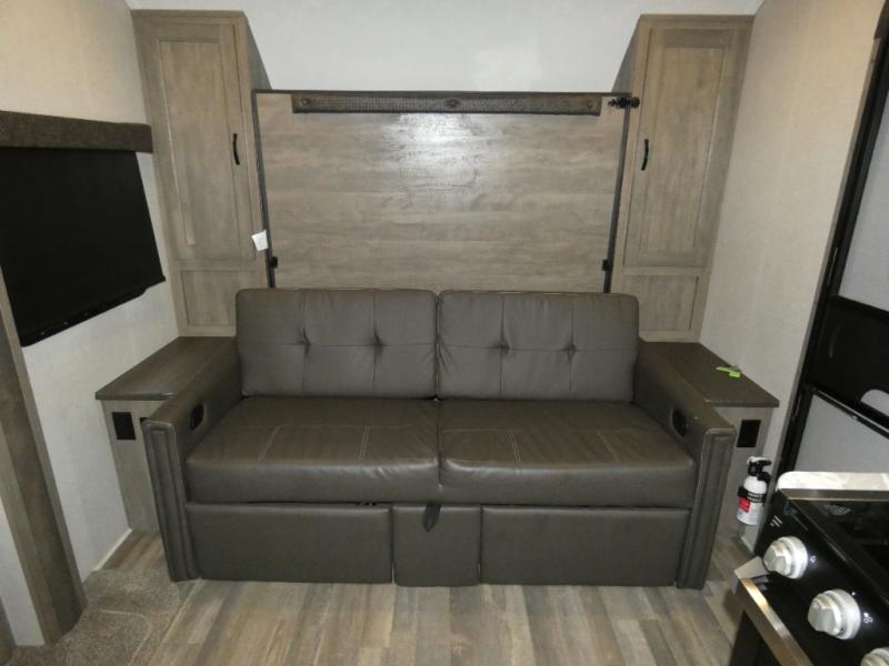 Versatility and comfort go hand-in-hand with this travel trailer thanks to the space saving Murphy bed. Enjoy the jackknife sofa during the day, and the comfortable bed at night. There are dual wardrobes on either side of the bed, plus dual nightstands that are USB and CPAP machine ready. Whip up your best meals on the three burner cooktop, or use the stainless steel 17" oven. This model also includes an upgraded 10.7 cu. ft. residential refrigerator and solid surface kitchen countertops for a more sleek look. You are sure to appreciate the full bath that includes a radius shower and a tall linen closet for bathroom necessities and clean towels!