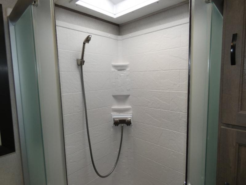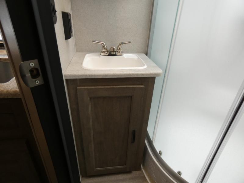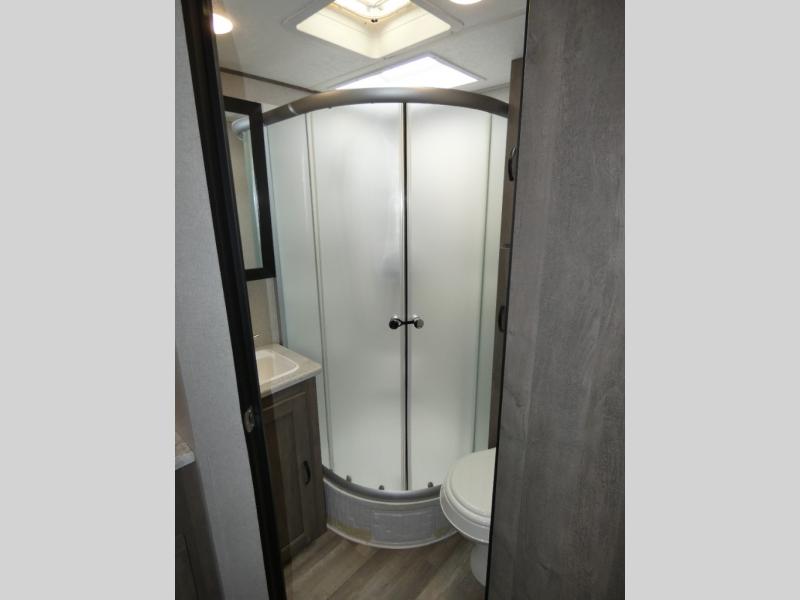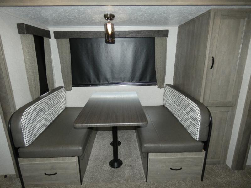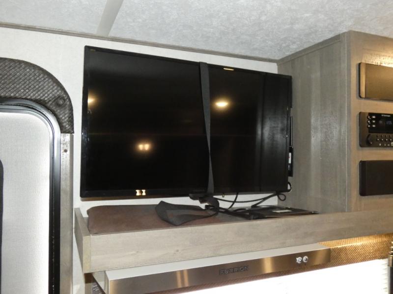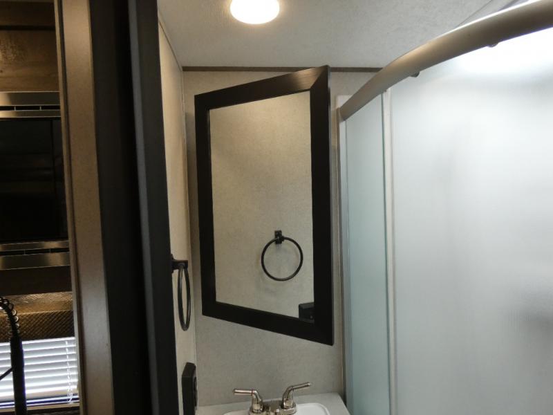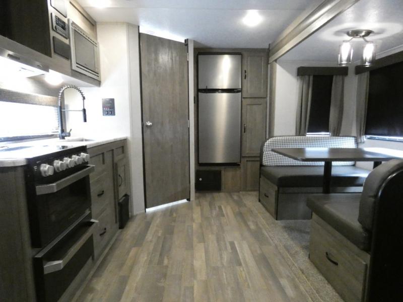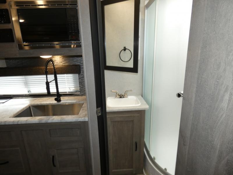 Versatility and comfort go hand-in-hand with this travel trailer thanks to the space saving Murphy bed. Enjoy the jackknife sofa during the day, and the comfortable bed at night. There are dual wardrobes on either side of the bed, plus dual nightstands that are USB and CPAP machine ready. Whip up your best meals on the three burner cooktop, or use the stainless steel 17" oven. This model also includes an upgraded 10.7 cu. ft. residential refrigerator and solid surface kitchen countertops for a more sleek look. You are sure to appreciate the full bath that includes a radius shower and a tall linen closet for bathroom necessities and clean towels!