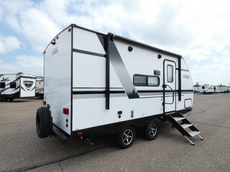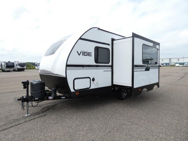 Each Vibe travel trailer by Forest River includes Hyper Lyte construction and a durable laminated "Aluma Frame" for years of use. The heated and enclosed underbelly allows you to extend your camping season, and the LED-lit exterior speakers will keep the party going as you grill outdoors and visit with family. Inside, you'll find LED lights to keep everything bright and open, a Bluetooth stereo, roller shades for your privacy, and many more amenities per region. These models also include cable and satellite prep and a digital TV antenna with a booster so you can stay connected to the outside world if you choose. Make the easy choice and choose a Vibe travel trailer today!