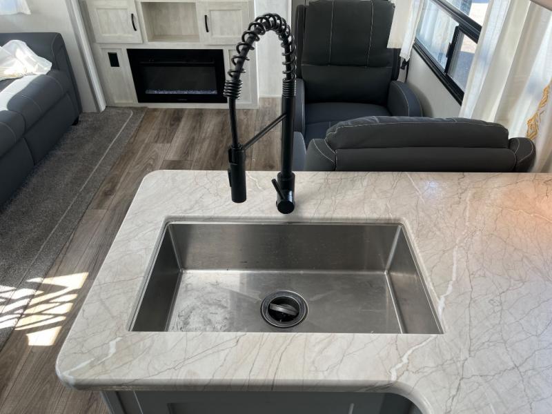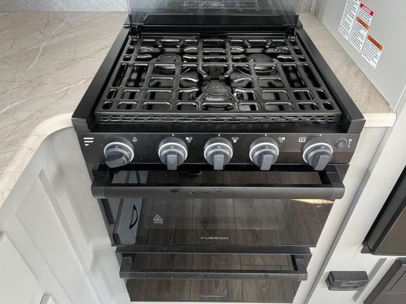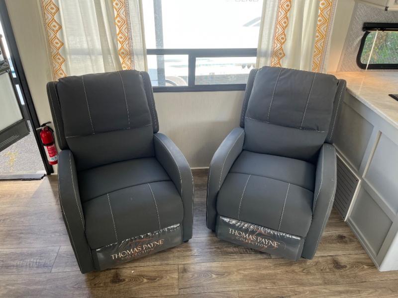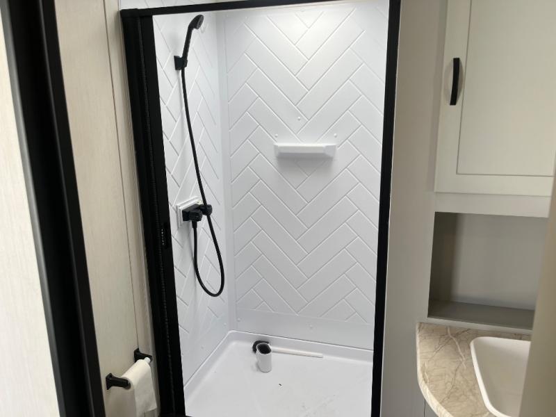 Escape to the Great Outdoors in this Vibe travel trailer. Once you arrive at your campsite, set up the 18' electric awning with LED lights, then grab the fishing poles from the large pass-through storage. You may want to make a quick lunch on the universal outside kitchen before heading out. If the weather isn't cooperating, you can cook on the three burner cooktop or in stainless steel 17' oven, and there is even a residential refrigerator to hold all your ingredients. The spacious full bath includes a 36" x 30" walk-in shower to clean up every day, and there is a linen closet to store clean towels and necessities.