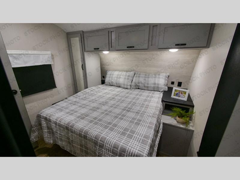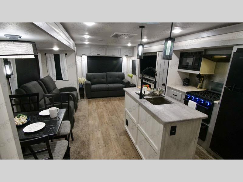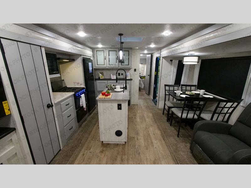 This travel trailer allows you to enjoy the Great Outdoors without having to give up your creature comforts. The dual opposing slides provide the chef space to work around the kitchen island, and there is plenty of seating space for your guests on the dual recliners, the sleeper sofa, and the booth dinette. The fireplace and LCD TV will be perfect for those rainy days, and there is even a living area skylight to let natural light in. This model also includes Sure-Step entry steps, a large pass-through storage, plus two power awnings with LED lights so you can spend more time outdoors with friends and family!
