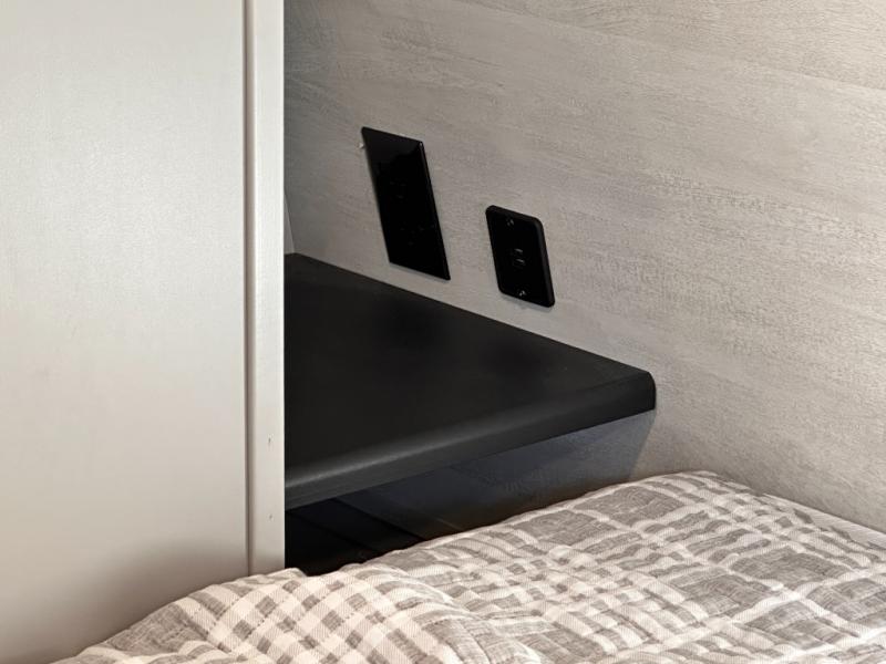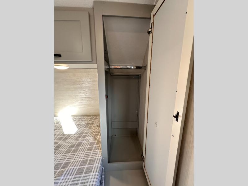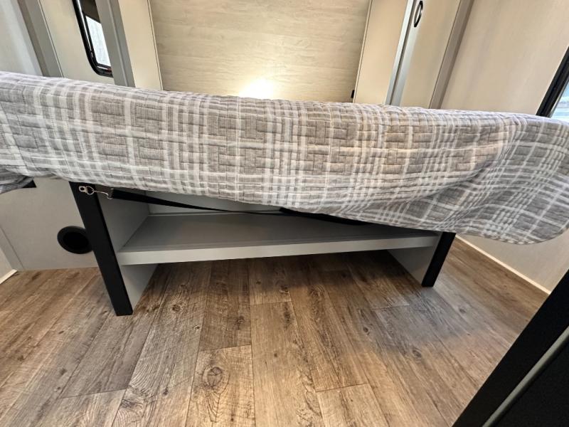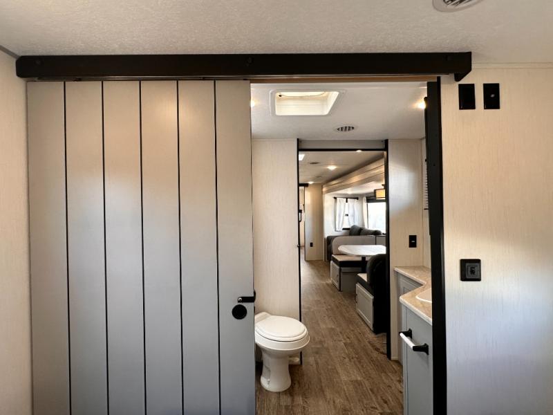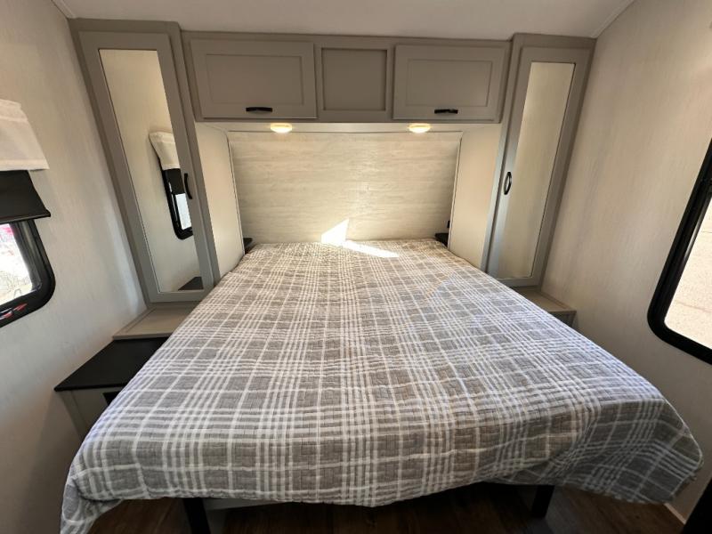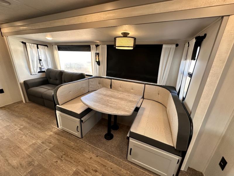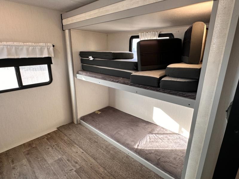 The kids will love having their own space when camping in this bunkhouse model! There is a slide out here with bunk beds, plus a third bunk above cabinet space to store clothes. You will find an exterior baggage door under the bunkhouse that includes two refrigerators, a TV, a spray port, plus storage. Now that's convenient! Head to the main living area where you can play a game around the U-shaped dinette or relax on the sleeper sofa in front of the 50" TV. You and your spouse will love the walk-through bath that will create a front master bedroom. The queen bed will provide a great night's rest, and there are dual wardrobes for his and her things.