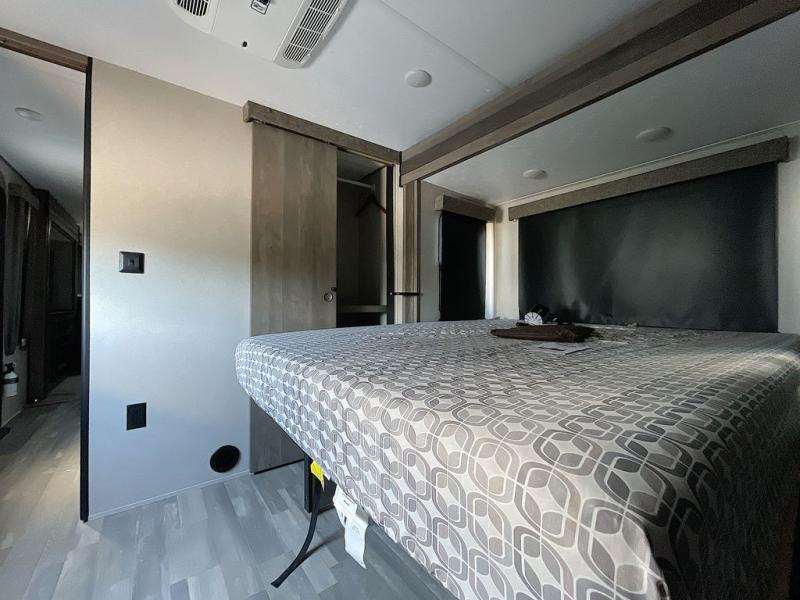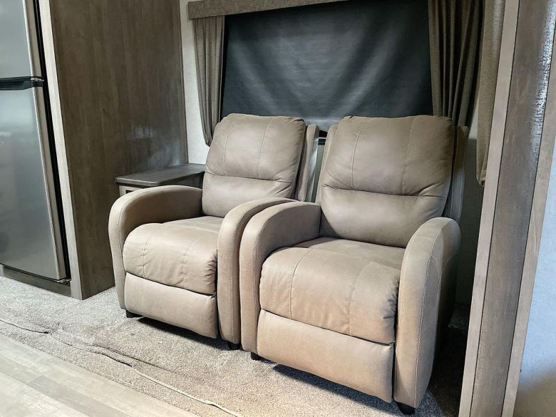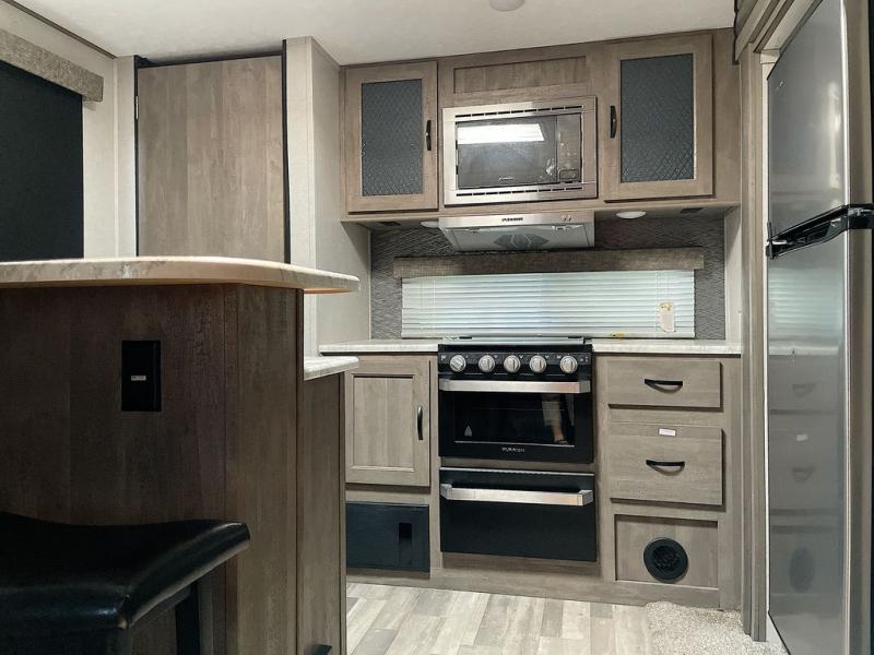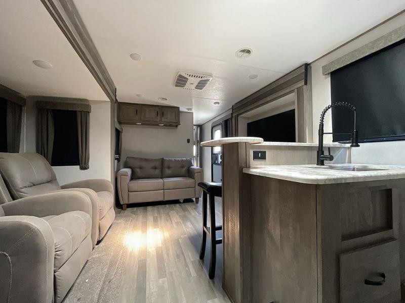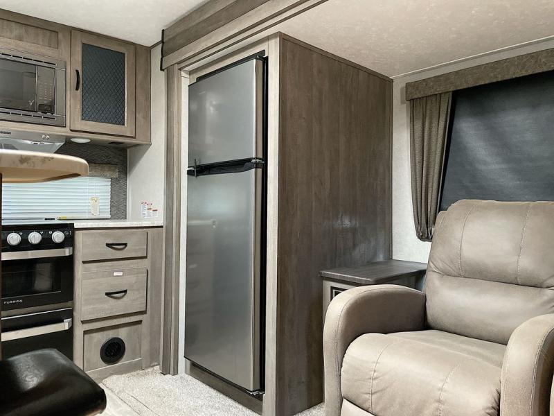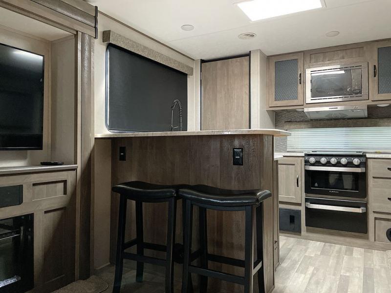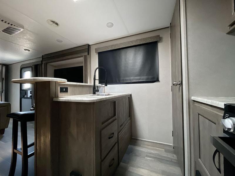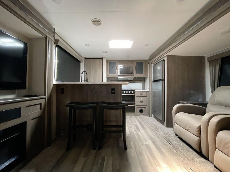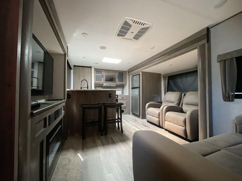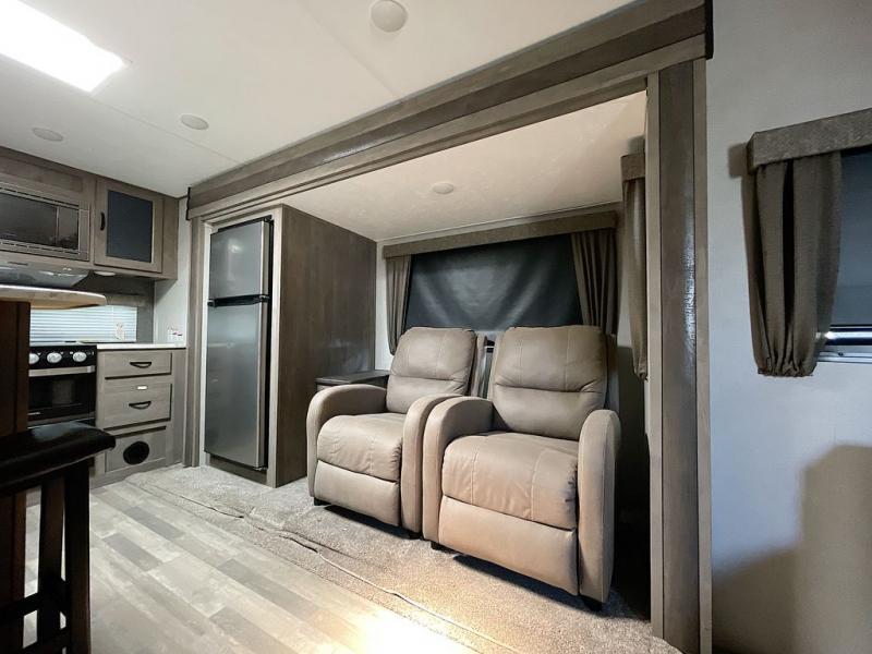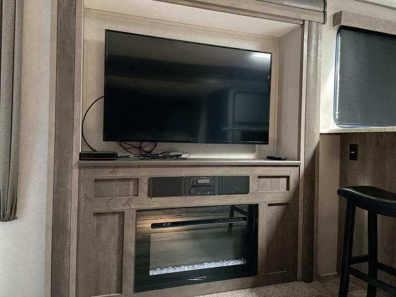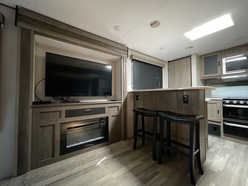 There is no going back to your tent-camping days after touring this travel trailer. The rear kitchen is any chef's dream with its walk-in pantry, residential refrigerator, plus a bar with stools where the kids can enjoy coloring. You will find comfortable seating space on the dual chairs and tri-fold sofa, and the fireplace and 50" TV with storage will feel just like home. The full bath will allow everyone space to clean up each day, and the front private bedroom will be your own oasis away from it all. Here, you will enjoy a slide out queen bed, a dresser where you can add a TV if you choose, plus a front walk-in closet so you can bring along all your favorite outfits!