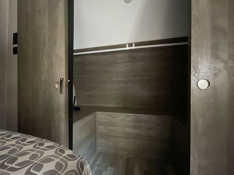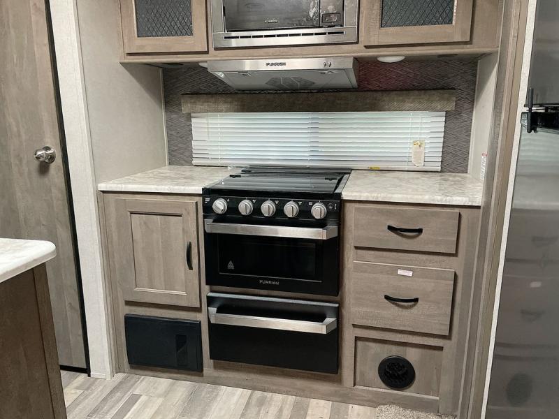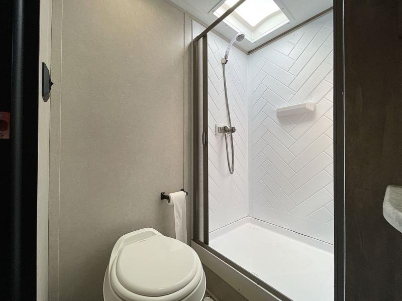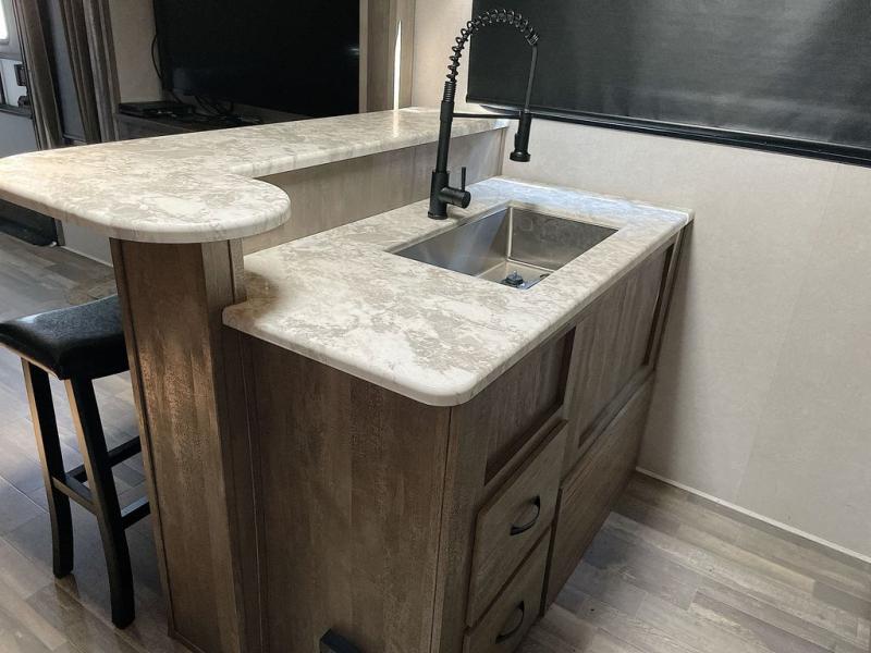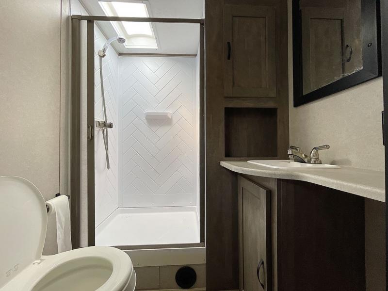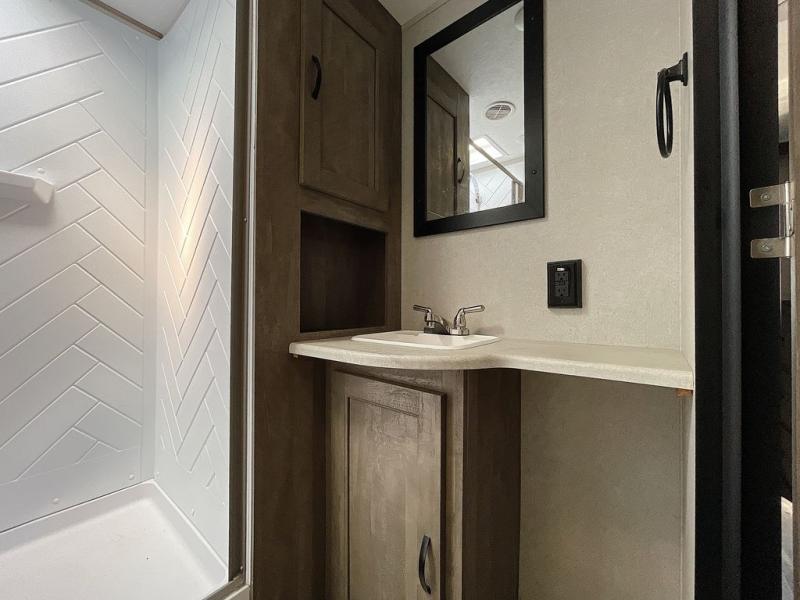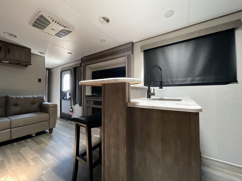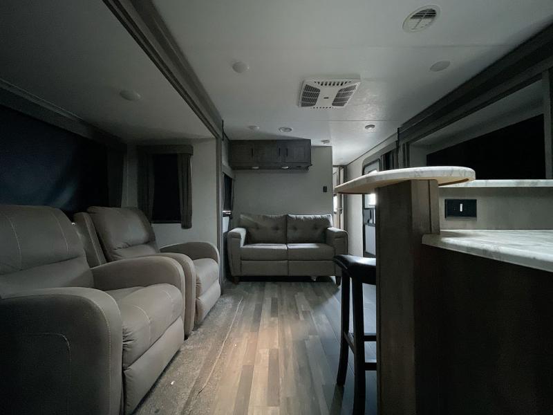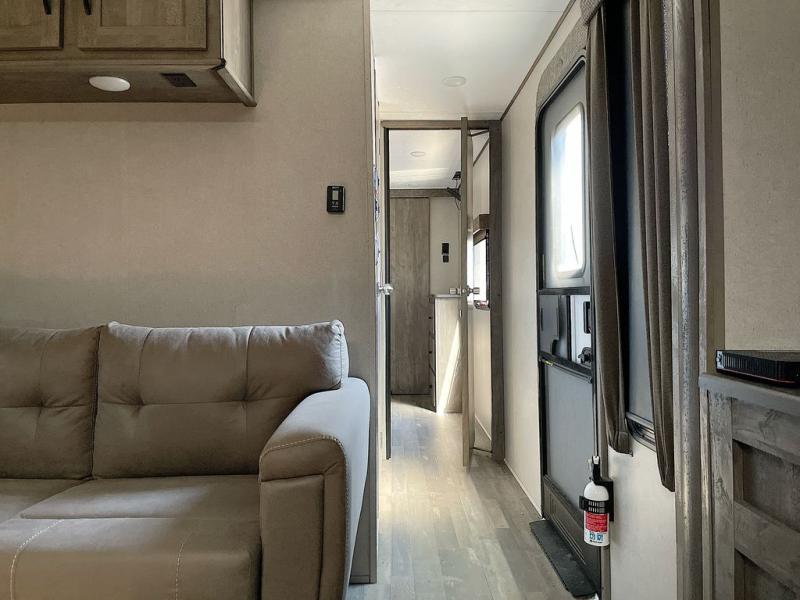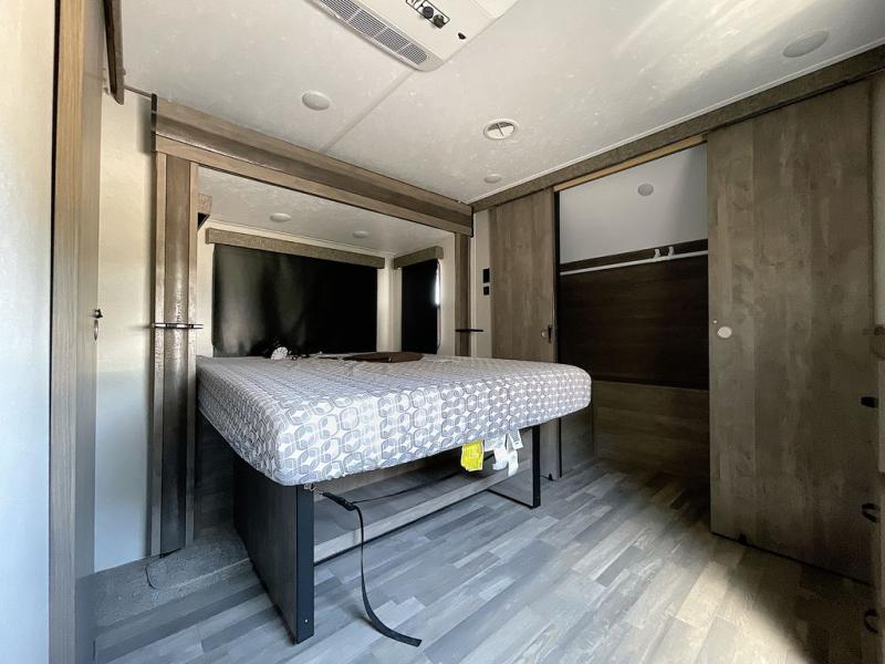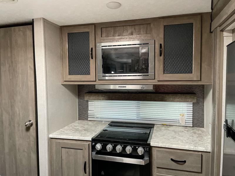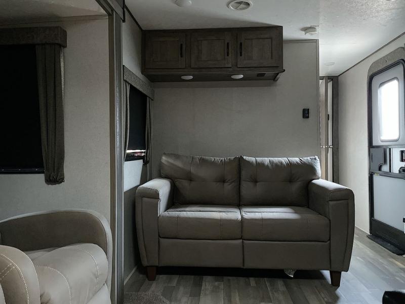 There is no going back to your tent-camping days after touring this travel trailer. The rear kitchen is any chef's dream with its walk-in pantry, residential refrigerator, plus a bar with stools where the kids can enjoy coloring. You will find comfortable seating space on the dual chairs and tri-fold sofa, and the fireplace and 50" TV with storage will feel just like home. The full bath will allow everyone space to clean up each day, and the front private bedroom will be your own oasis away from it all. Here, you will enjoy a slide out queen bed, a dresser where you can add a TV if you choose, plus a front walk-in closet so you can bring along all your favorite outfits!