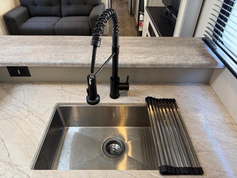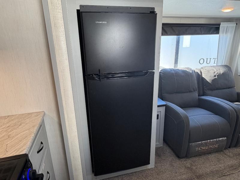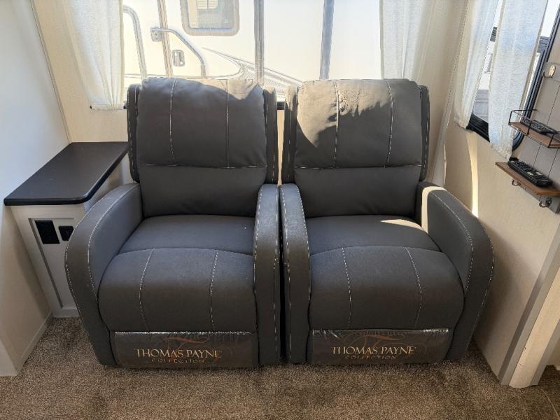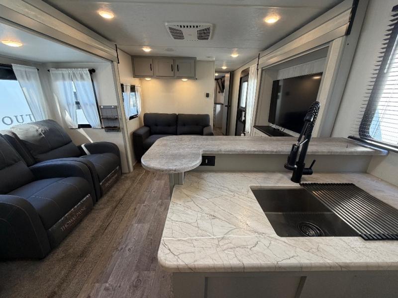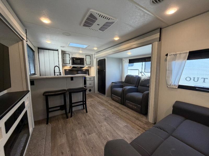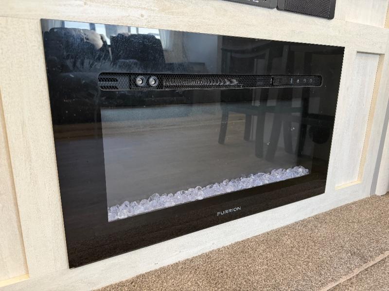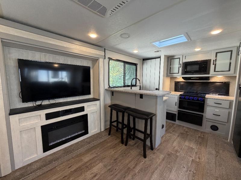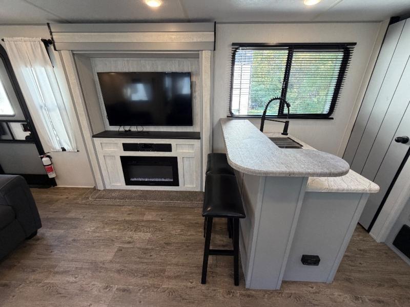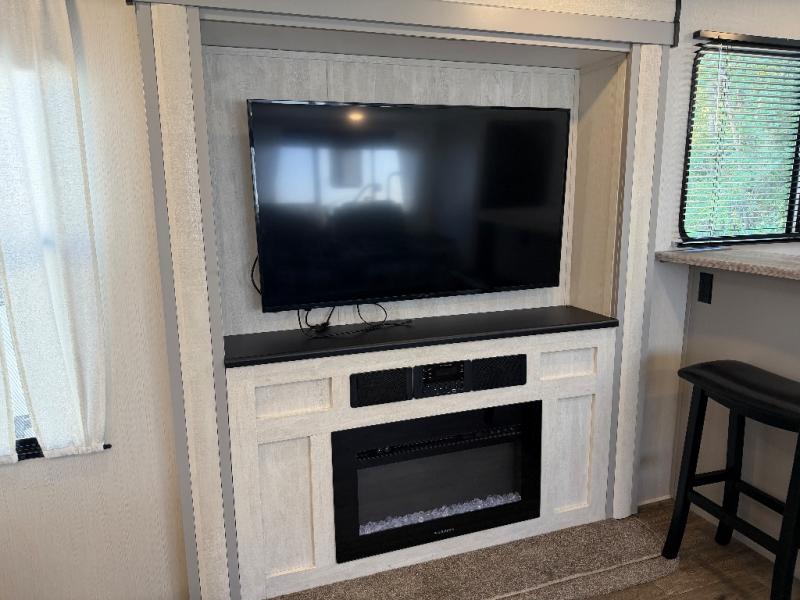 The 31ML Vibe travel trailer features a tri-fold sofa and dual chairs in the main living area, perfect for relaxing or entertaining. Enjoy the warmth of the fireplace while watching the 50" TV with plenty of storage nearby for media and essentials. The 14' electric awning creates a shaded outdoor retreat for dining or lounging.
