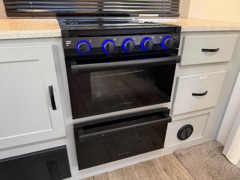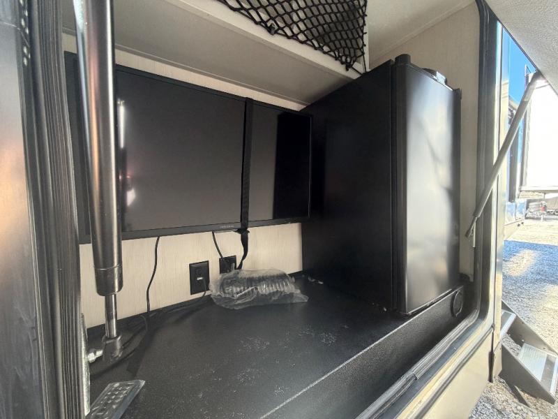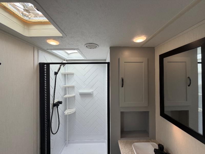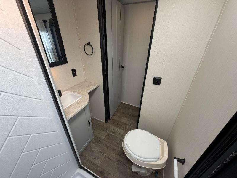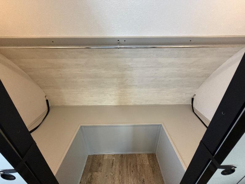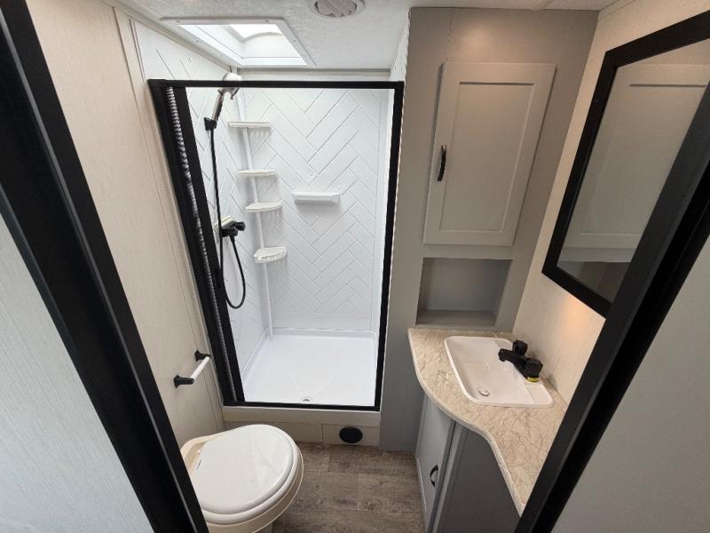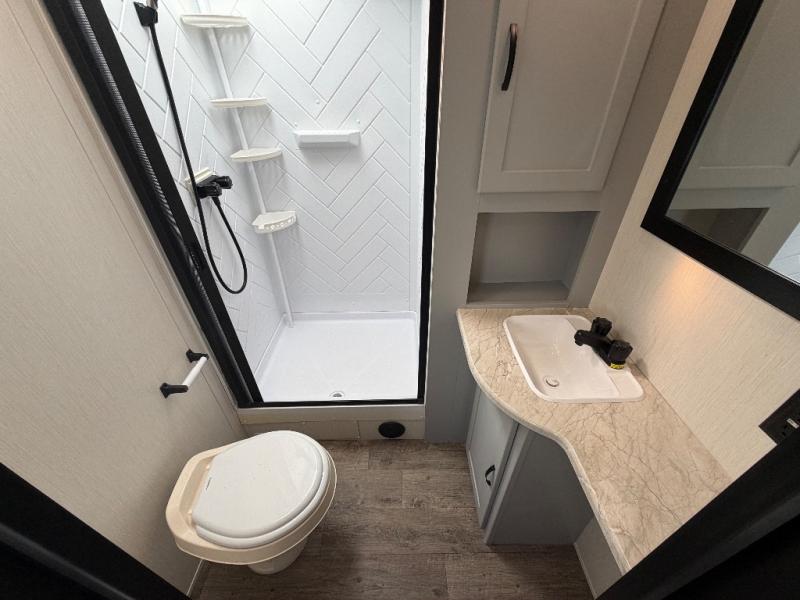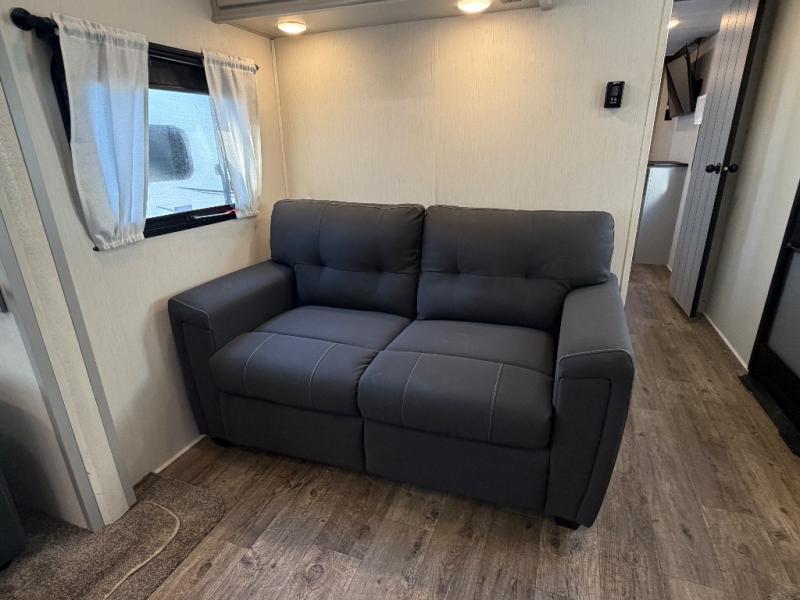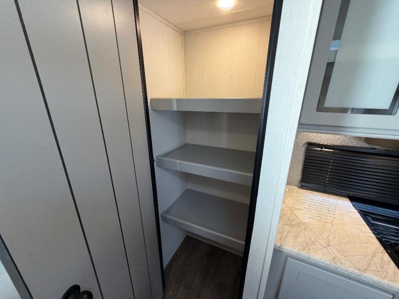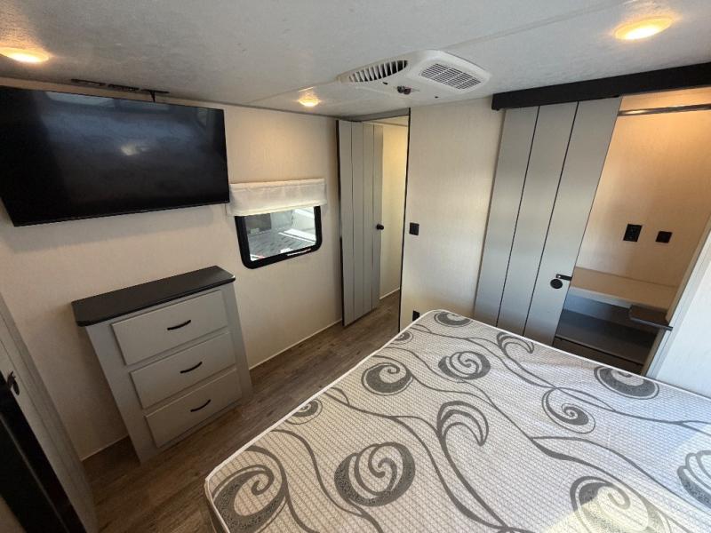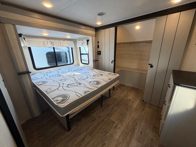 The front private bedroom offers a slide-out queen bed, dresser with optional TV setup, and a walk-in closet for ample storage. A full bathroom ensures everyone can clean up comfortably each day, keeping the trailer convenient for families or guests.