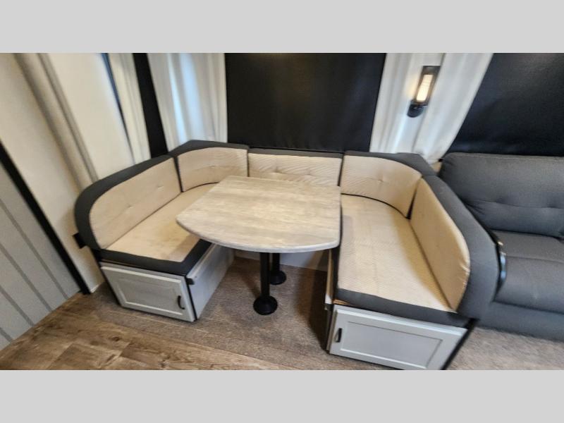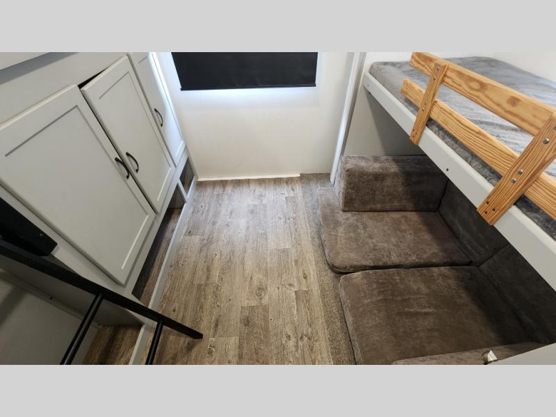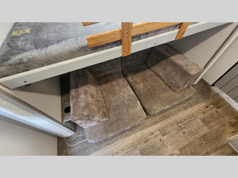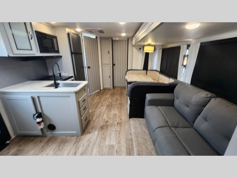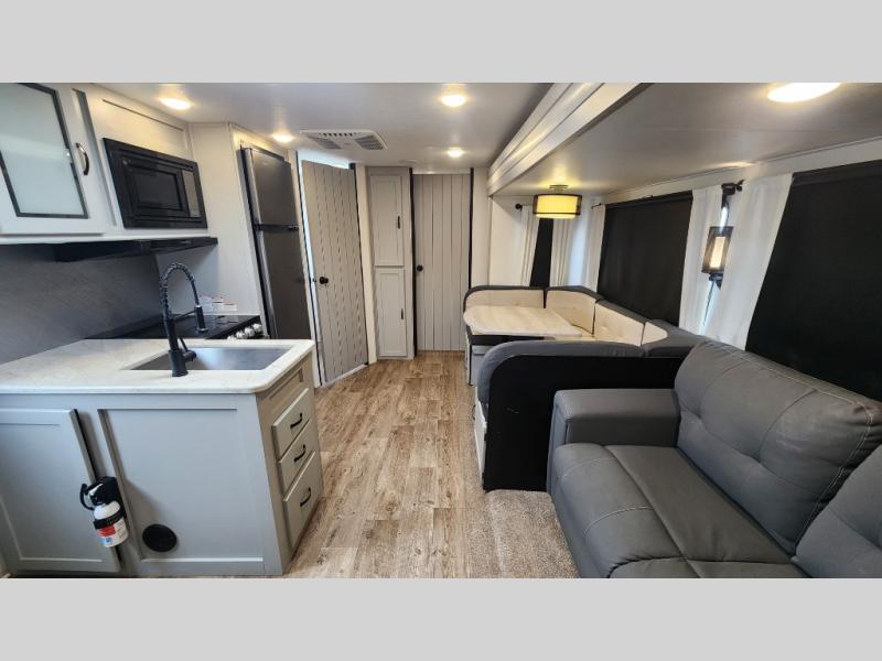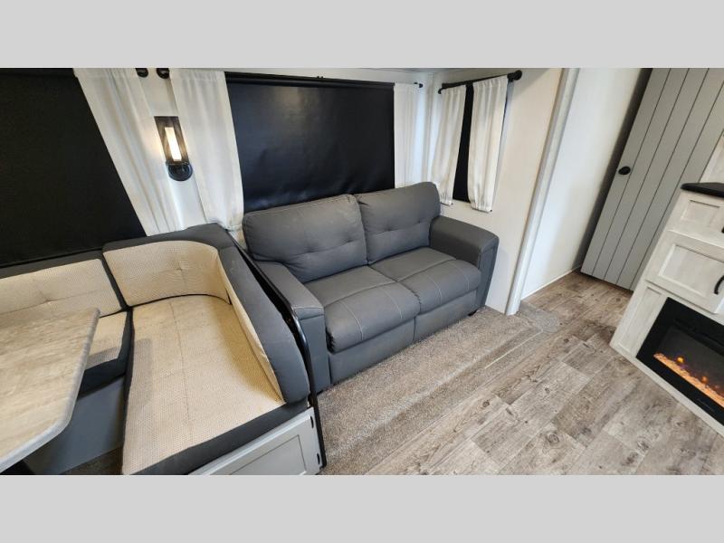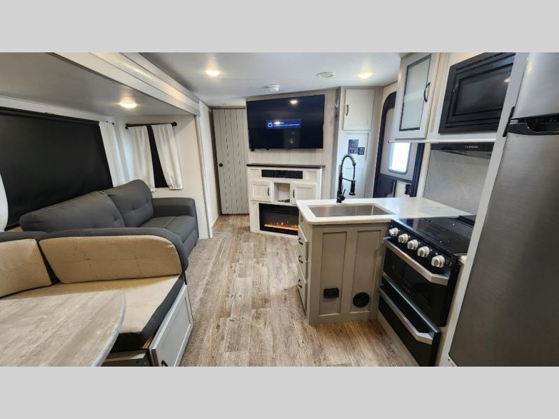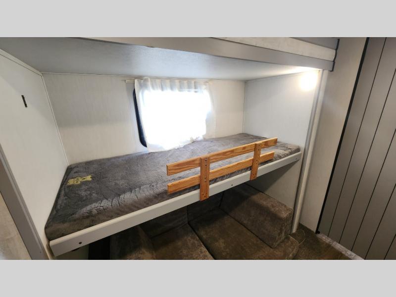 How does a private bunkhouse for the kids sound, and a front private bedroom for you and your spouse? You will enjoy all that and more in this travel trailer that can sleep up to ten people each night. The large slide out in the main living area will open up this space so the chef of your group can cook on the three burner cooktop, and the living room skylight will let natural light. There is an entertainment center here and a fireplace for a more at-home feel, and don't forget about the two pantries to store snacks galore. This model also features a bath and a half which will really come in handy when camping with a larger group!
