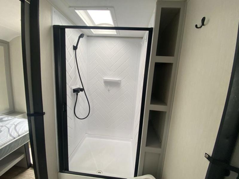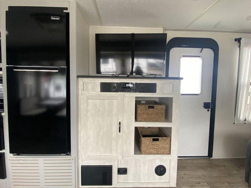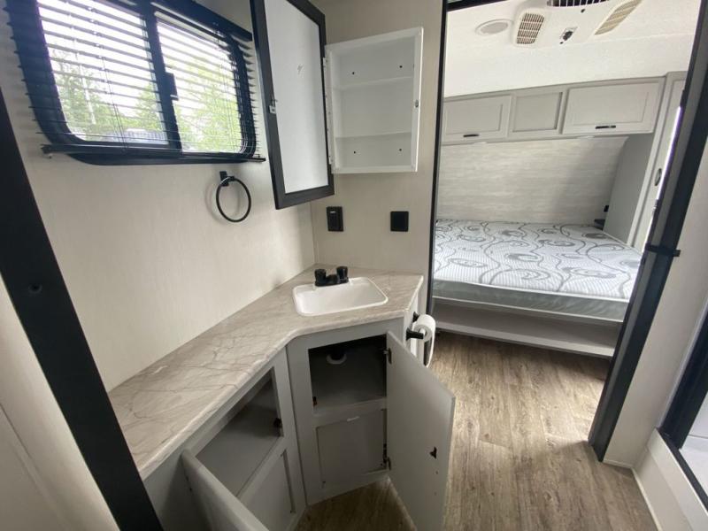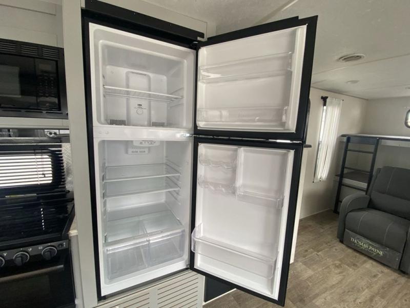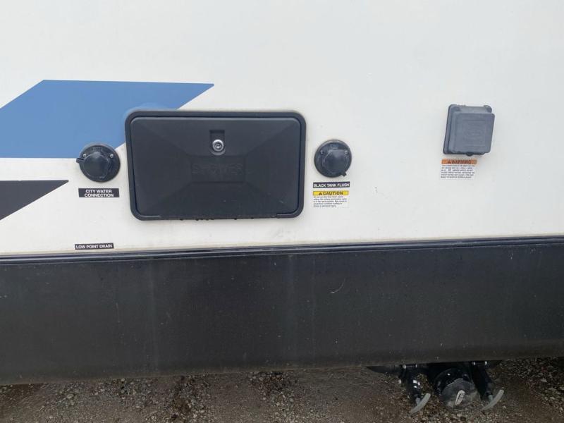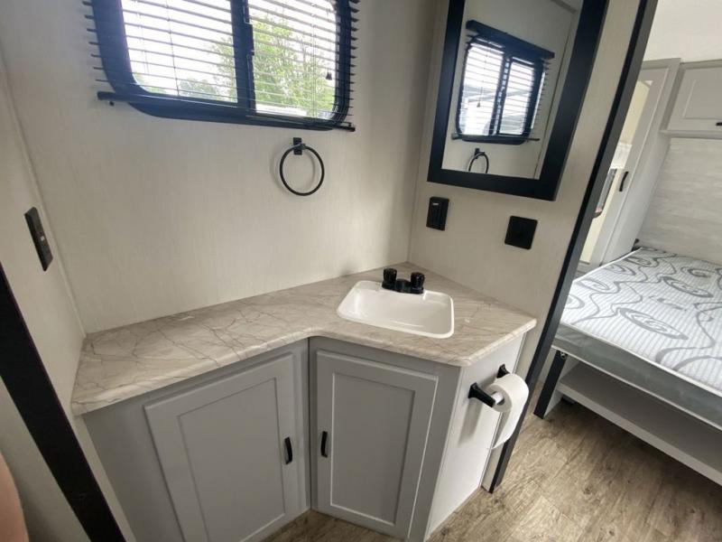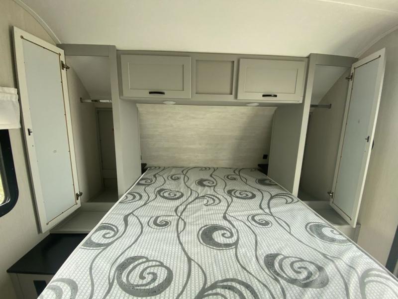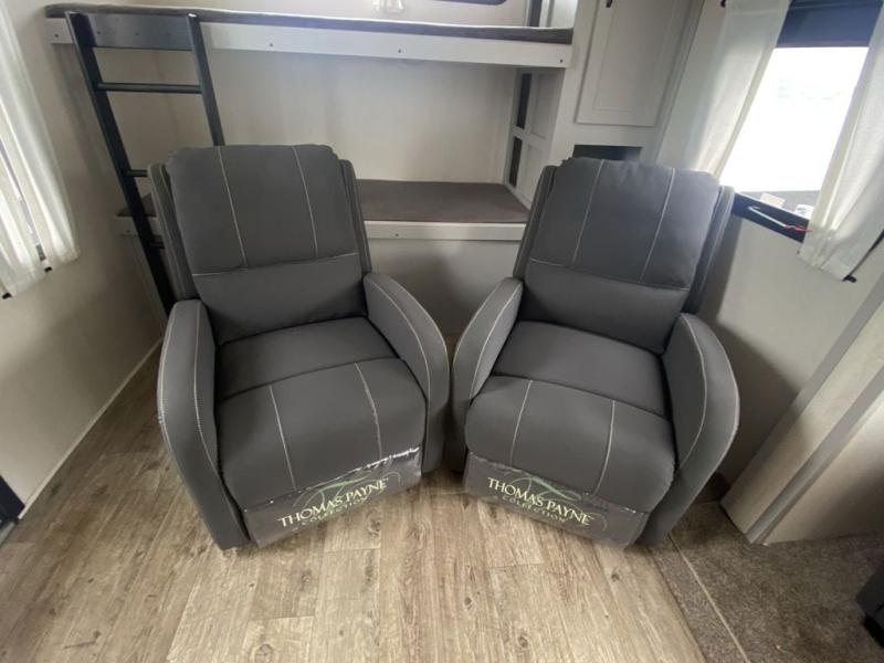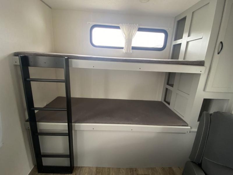 Head to the lake in this travel trailer made for your family of five. You and your spouse will enjoy the queen bed in the front private bedroom, plus dual wardrobes and your own exterior entry door. The walk-through bath includes sliding pocket doors to save space, and you will appreciate a spacious shower to clean up in each day. After a day outdoor, relax on the dual chairs and tri-fold sofa, or play a game at the booth dinette. The kids will love the rear bunks that include a top bunk safety railing for little ones. There is even a ladder to make it more fun and a cabinet to store clothes and extra blankets. And don't forget about the universal outside kitchen with a spray port, and the outside TV prep will allow you to bring along a TV for movie night outdoors!