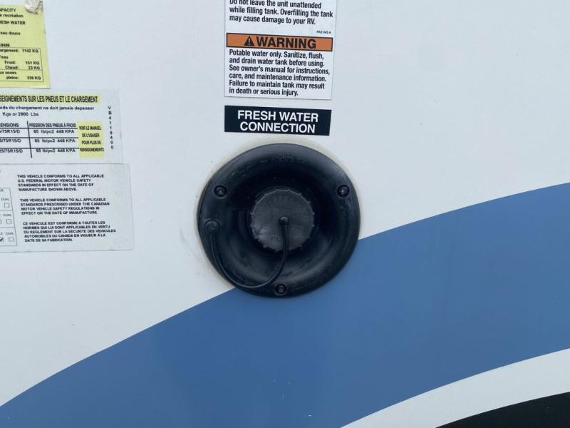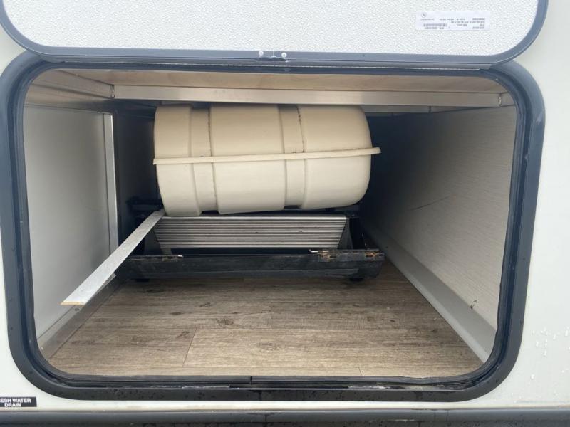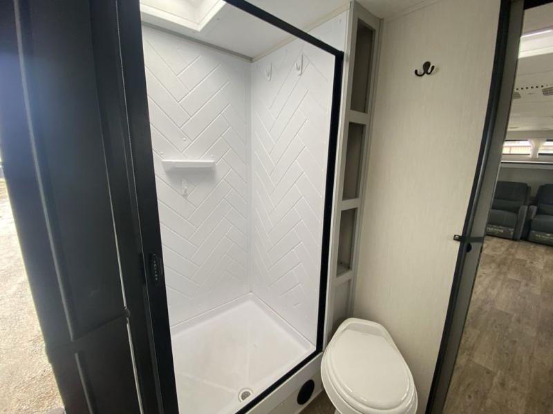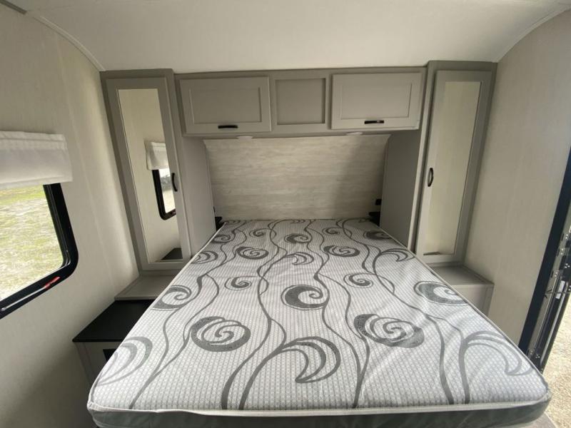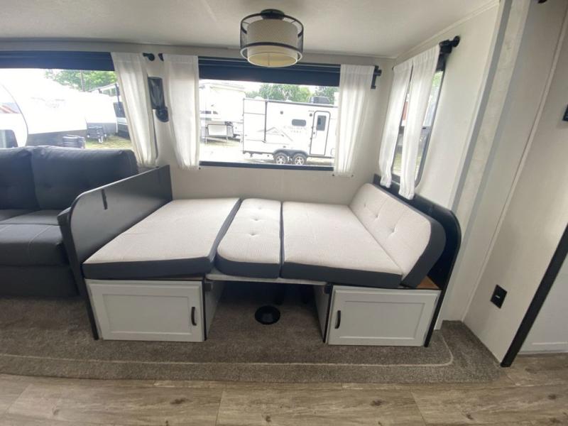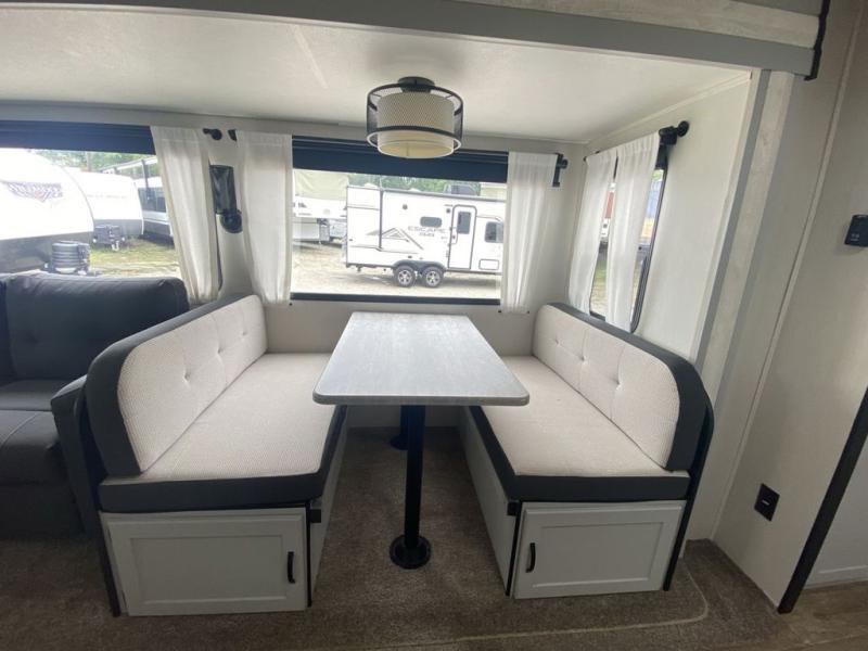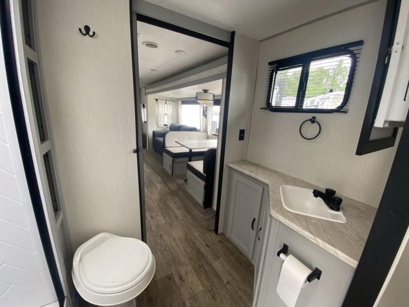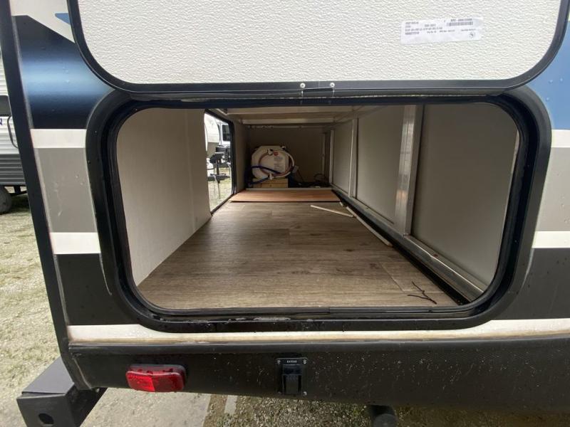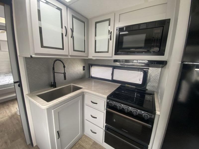 Head to the lake in this travel trailer made for your family of five. You and your spouse will enjoy the queen bed in the front private bedroom, plus dual wardrobes and your own exterior entry door. The walk-through bath includes sliding pocket doors to save space, and you will appreciate a spacious shower to clean up in each day. After a day outdoor, relax on the dual chairs and tri-fold sofa, or play a game at the booth dinette. The kids will love the rear bunks that include a top bunk safety railing for little ones. There is even a ladder to make it more fun and a cabinet to store clothes and extra blankets. And don't forget about the universal outside kitchen with a spray port, and the outside TV prep will allow you to bring along a TV for movie night outdoors!
