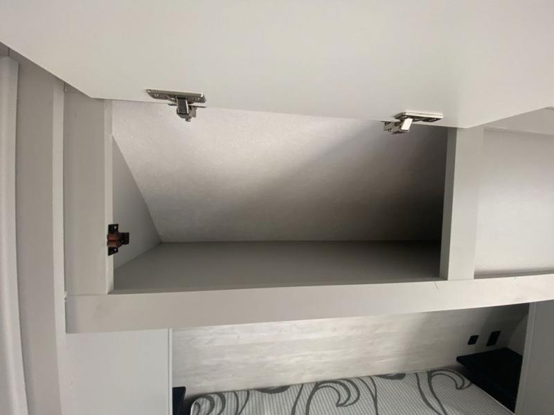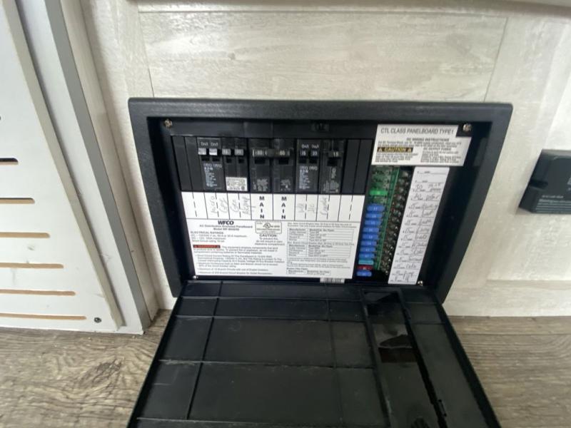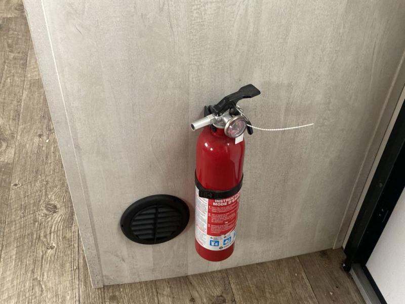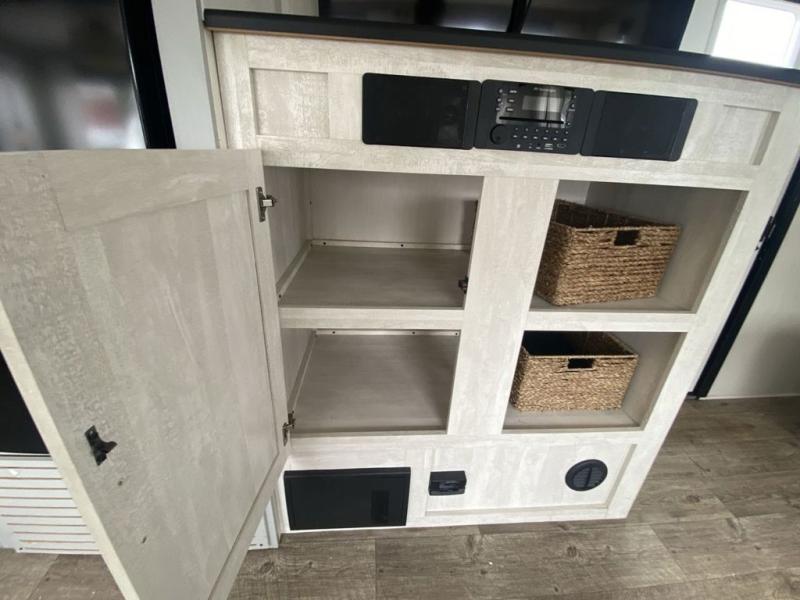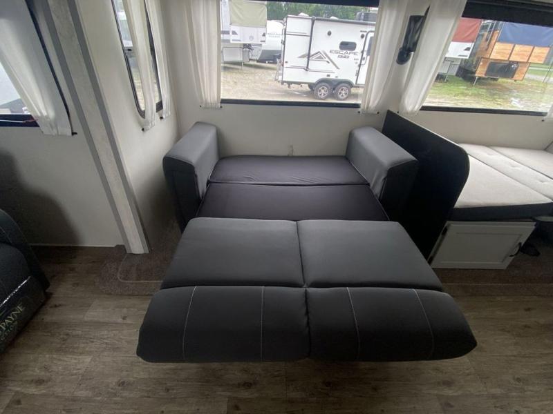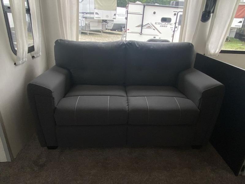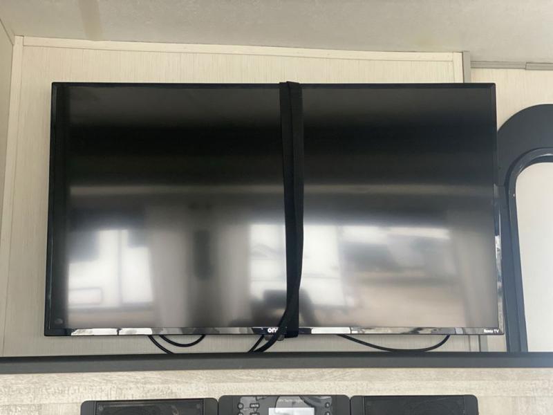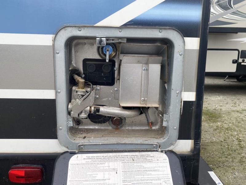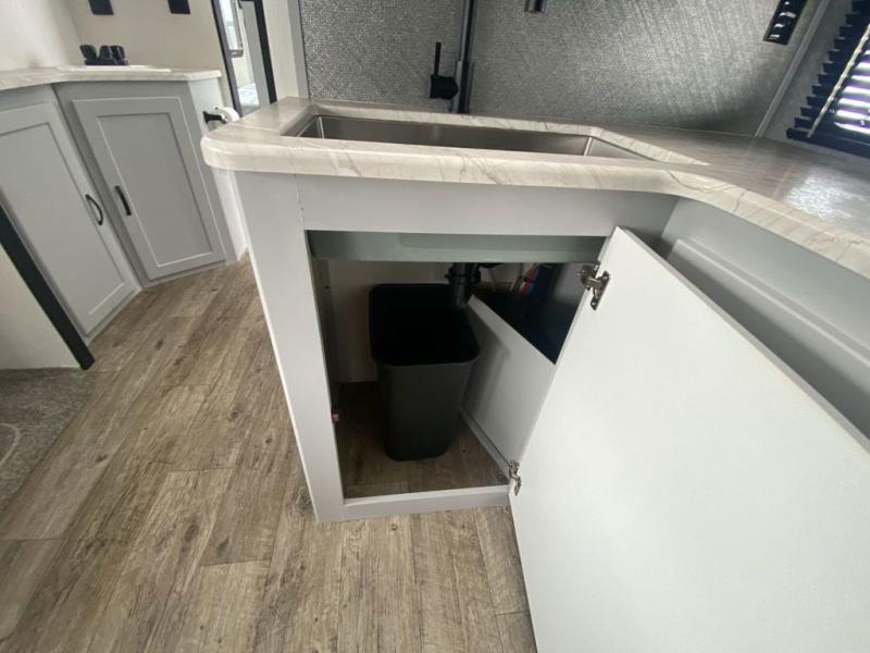 Head to the lake in this travel trailer made for your family of five. You and your spouse will enjoy the queen bed in the front private bedroom, plus dual wardrobes and your own exterior entry door. The walk-through bath includes sliding pocket doors to save space, and you will appreciate a spacious shower to clean up in each day. After a day outdoor, relax on the dual chairs and tri-fold sofa, or play a game at the booth dinette. The kids will love the rear bunks that include a top bunk safety railing for little ones. There is even a ladder to make it more fun and a cabinet to store clothes and extra blankets. And don't forget about the universal outside kitchen with a spray port, and the outside TV prep will allow you to bring along a TV for movie night outdoors!