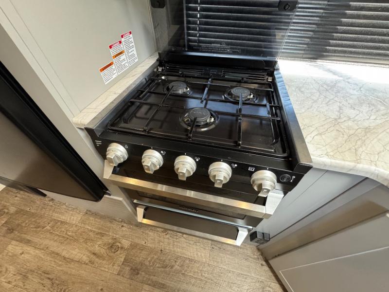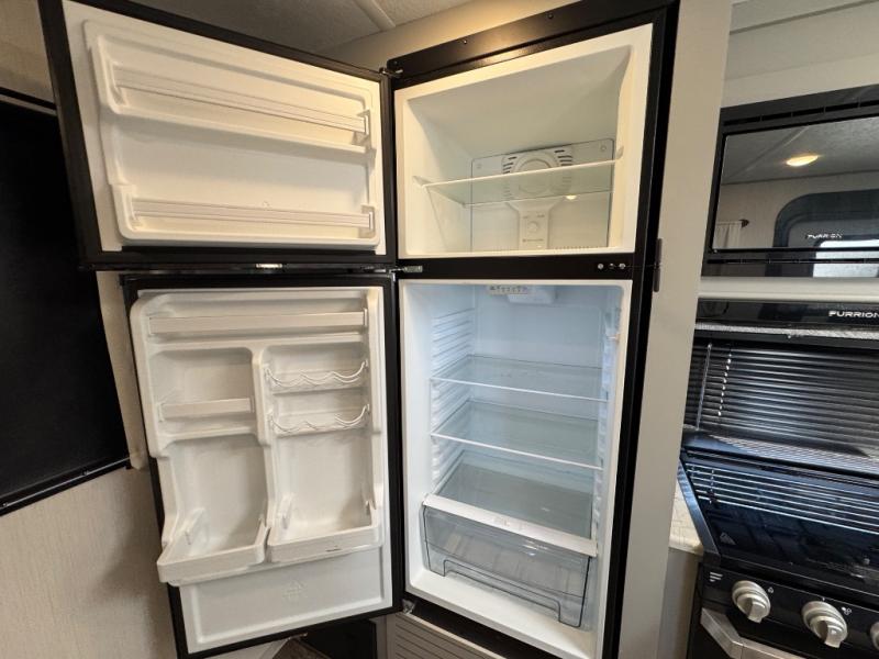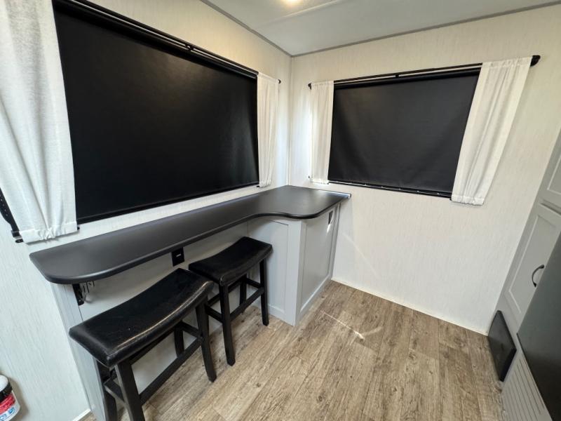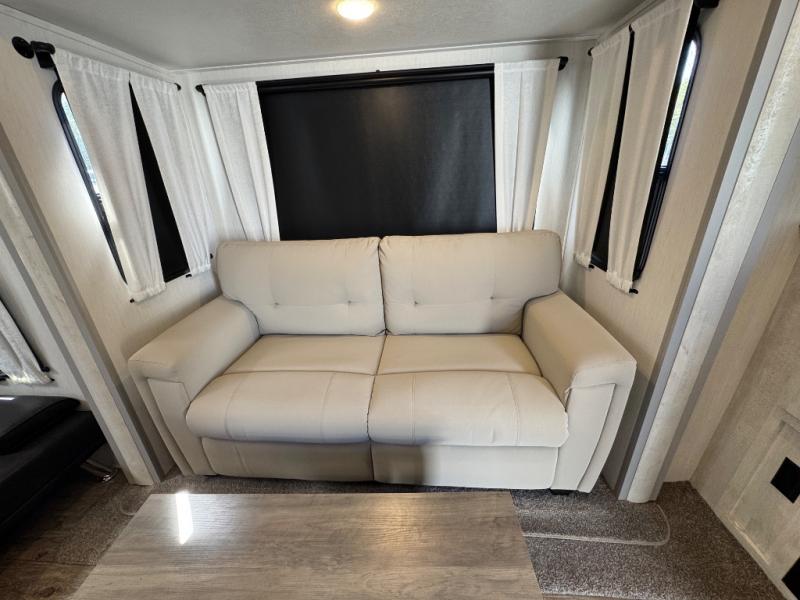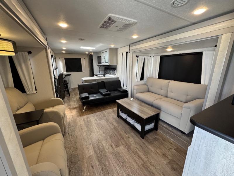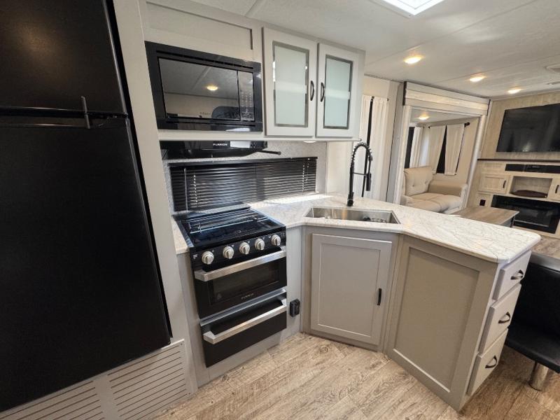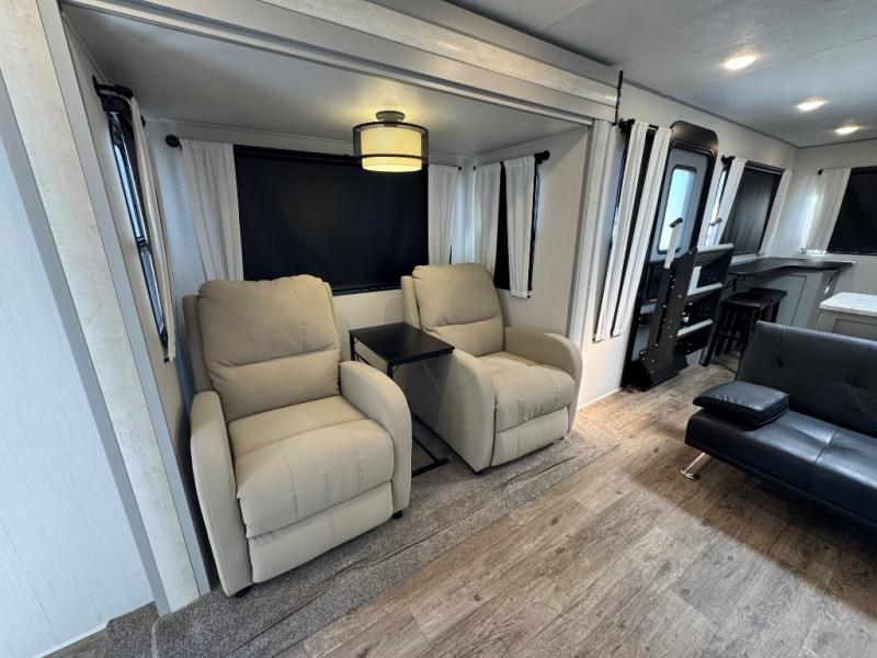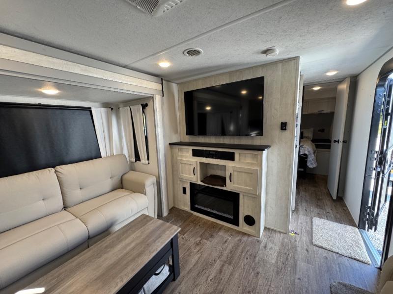 If you like your rooms separated, this trailer has you covered! From the rear kitchen with a window to enjoy the scenery, and a buffet to serve meals from to having dual entry for easy access to both ends of the trailer, this model is perfect! The separate living area provides dual opposing slides with oversized panoramic windows, a sleeper sofa and a booth dinette, plus two recliners are near by. You can enjoy the fireplace as well. The full bathroom offers a walk-in shower and everything you need to stay clean and refreshed for what's next on the agenda. And the front bedroom gives you a queen bed to quickly fall asleep. And don't forget about the exterior pass through storage, the outside kitchen and the two awnings.