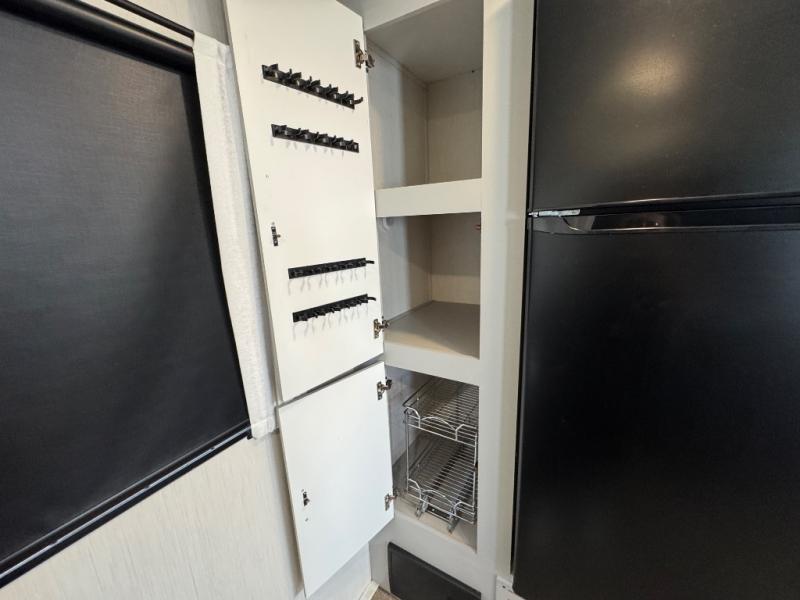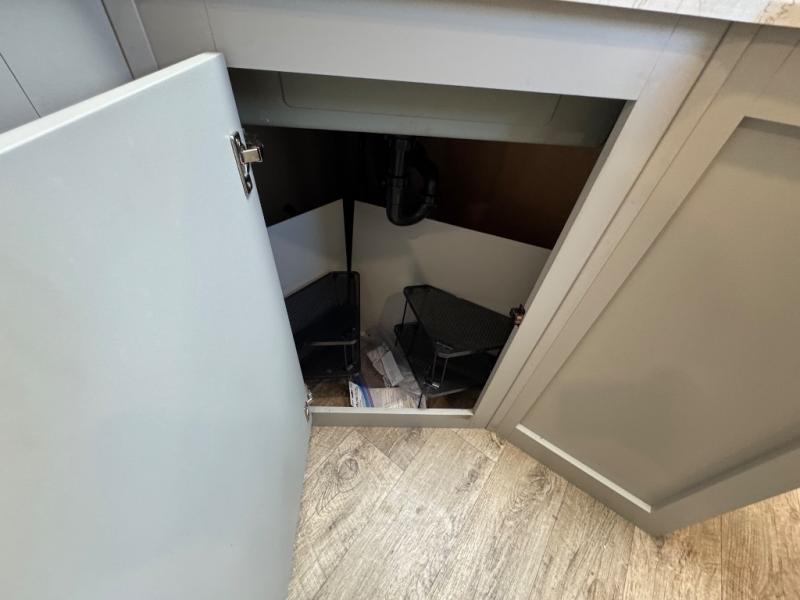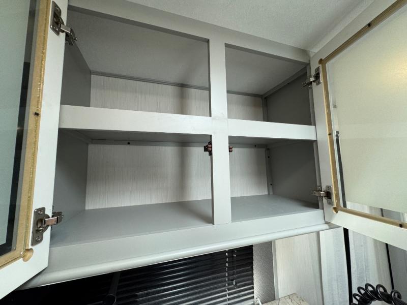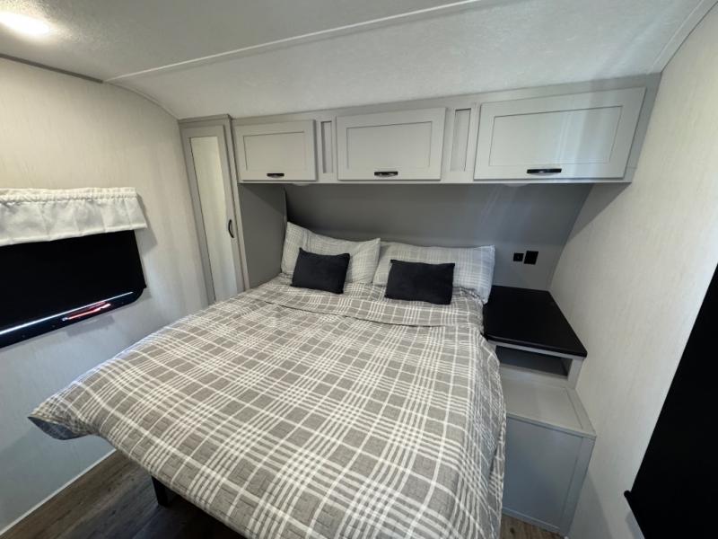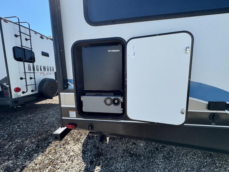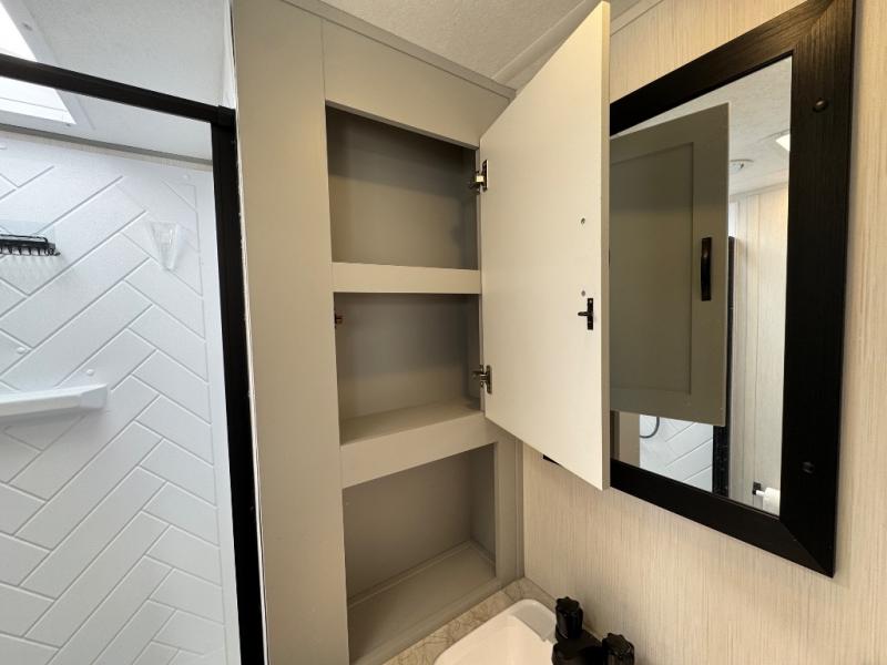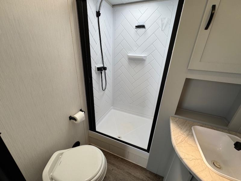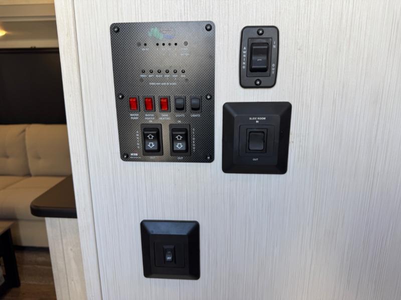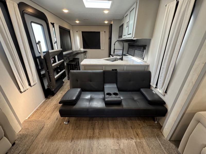 If you like your rooms separated, this trailer has you covered! From the rear kitchen with a window to enjoy the scenery, and a buffet to serve meals from to having dual entry for easy access to both ends of the trailer, this model is perfect! The separate living area provides dual opposing slides with oversized panoramic windows, a sleeper sofa and a booth dinette, plus two recliners are near by. You can enjoy the fireplace as well. The full bathroom offers a walk-in shower and everything you need to stay clean and refreshed for what's next on the agenda. And the front bedroom gives you a queen bed to quickly fall asleep. And don't forget about the exterior pass through storage, the outside kitchen and the two awnings.