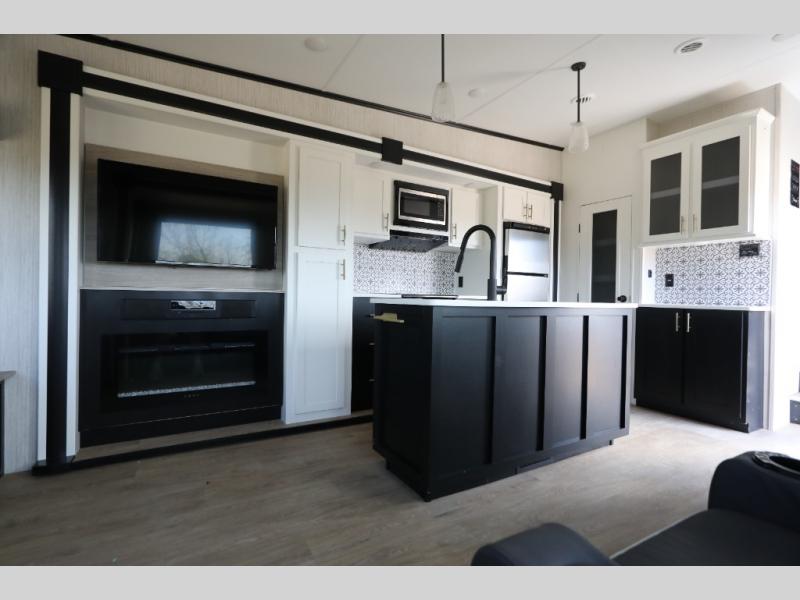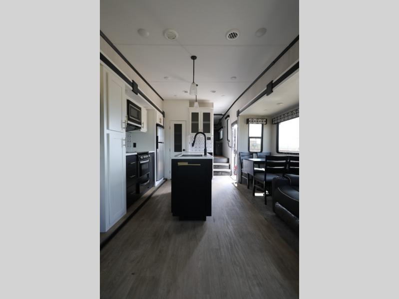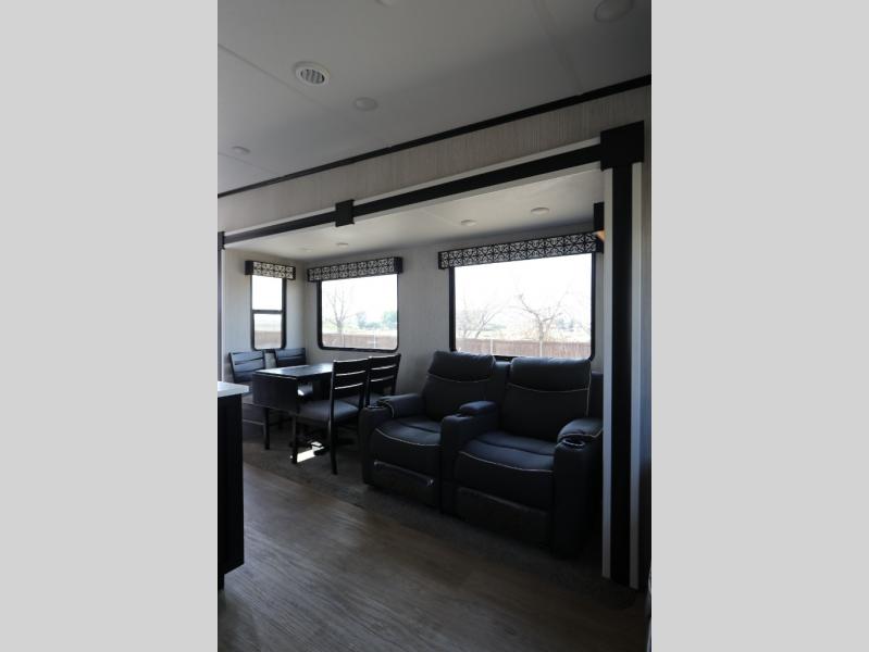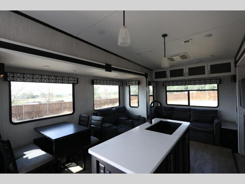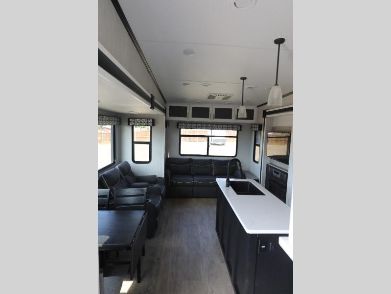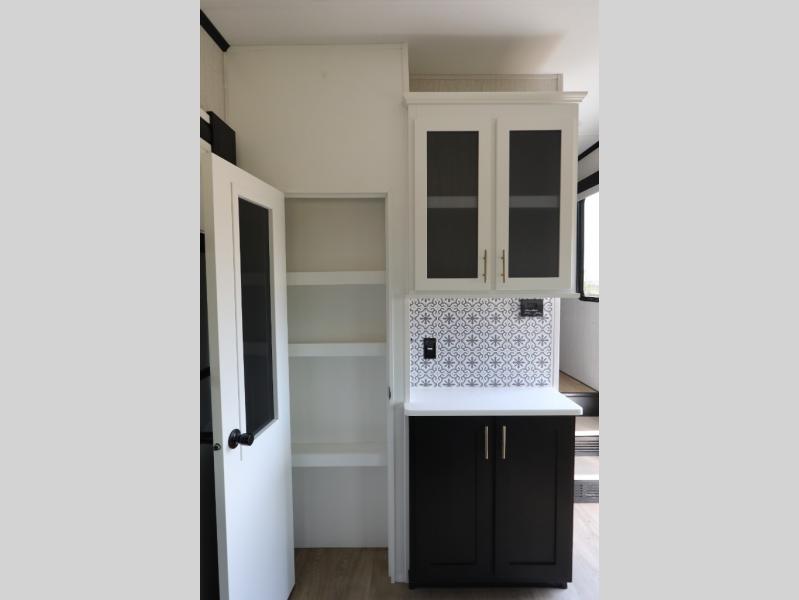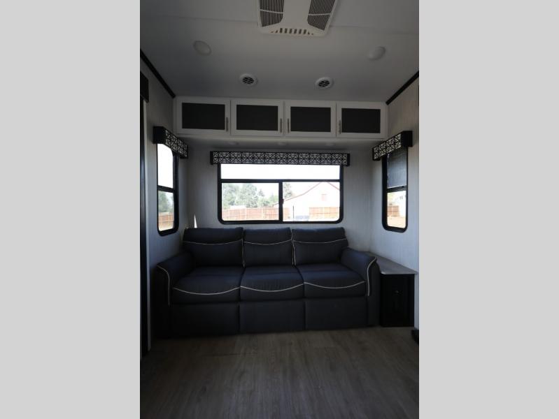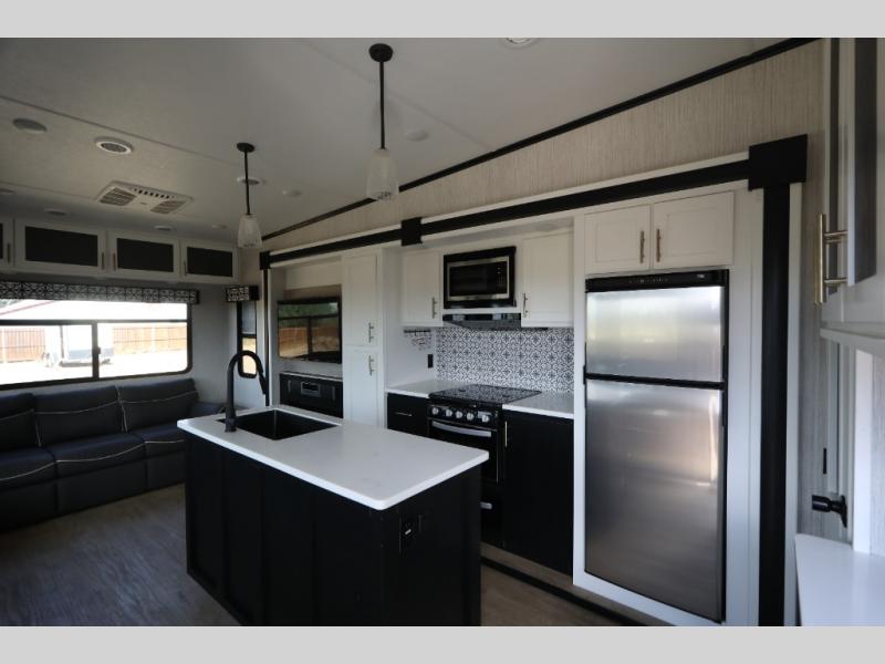 Experience the camping lifestyle in complete comfort with this fifth wheel in tow! Once you step foot inside you will be met with a spacious living space, residential features, and comfortable furniture arrangements. There are many convenient features such as a walk-in pantry, a large kitchen island, pus tons of overhead space for your dishes and kitchen knickknacks. After a day outdoors, head to the rear living area to relax on the 80" hide-a-bed sofa or the 60" theater seating. When it's time to call it a night, the front private bedroom will be your own oasis away from it all. Here, you'll find a slide out king bed, plus a large wardrobe that includes convenient shoe storage and a space to add an optional washer and dryer!