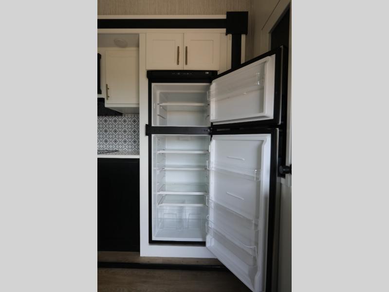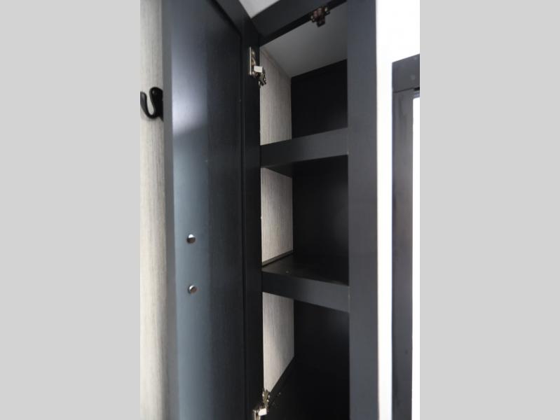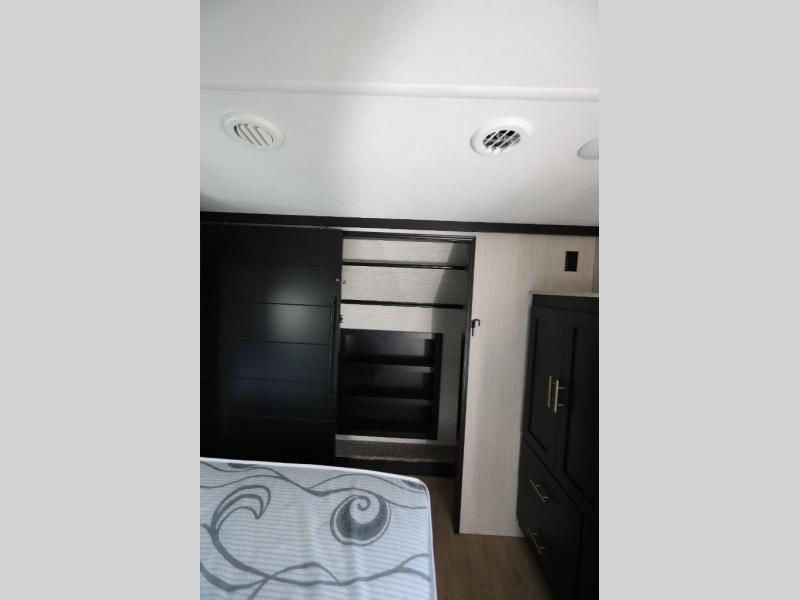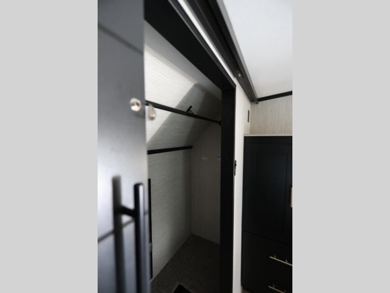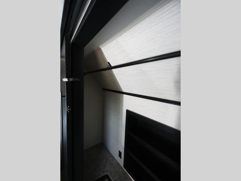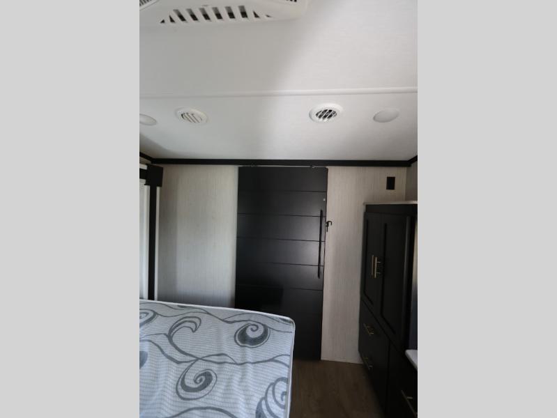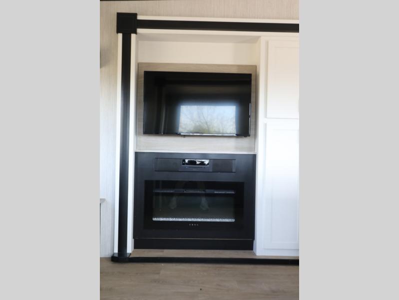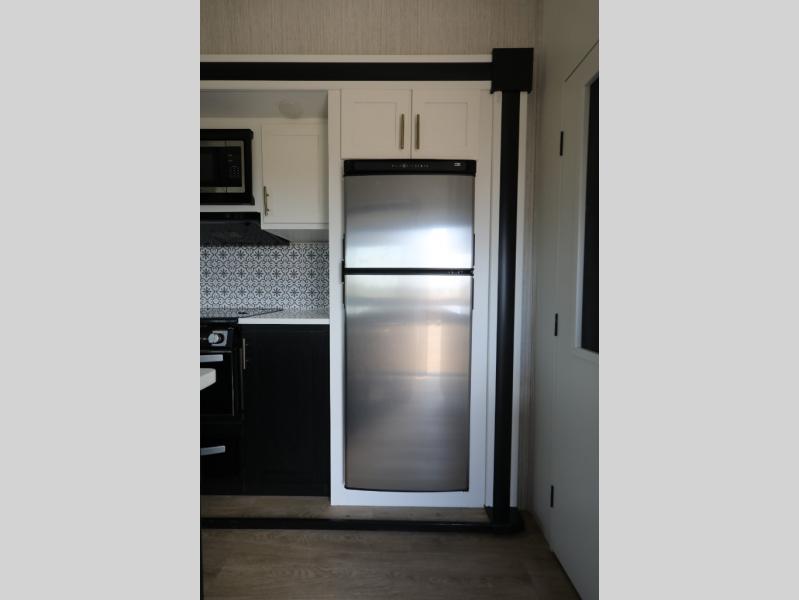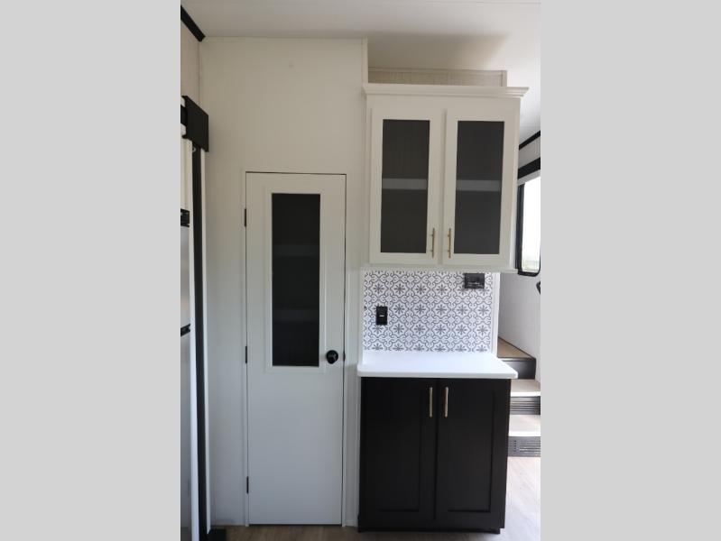 Experience the camping lifestyle in complete comfort with this fifth wheel in tow! Once you step foot inside you will be met with a spacious living space, residential features, and comfortable furniture arrangements. There are many convenient features such as a walk-in pantry, a large kitchen island, pus tons of overhead space for your dishes and kitchen knickknacks. After a day outdoors, head to the rear living area to relax on the 80" hide-a-bed sofa or the 60" theater seating. When it's time to call it a night, the front private bedroom will be your own oasis away from it all. Here, you'll find a slide out king bed, plus a large wardrobe that includes convenient shoe storage and a space to add an optional washer and dryer!