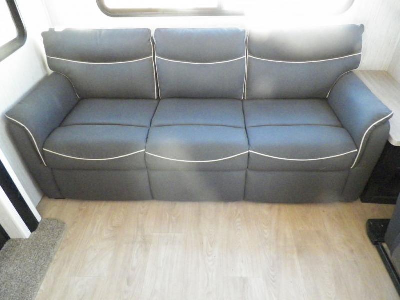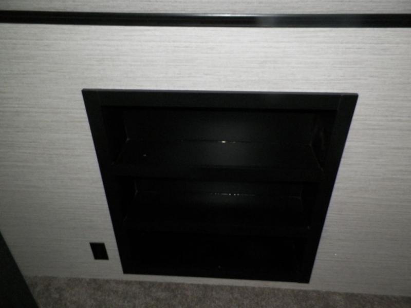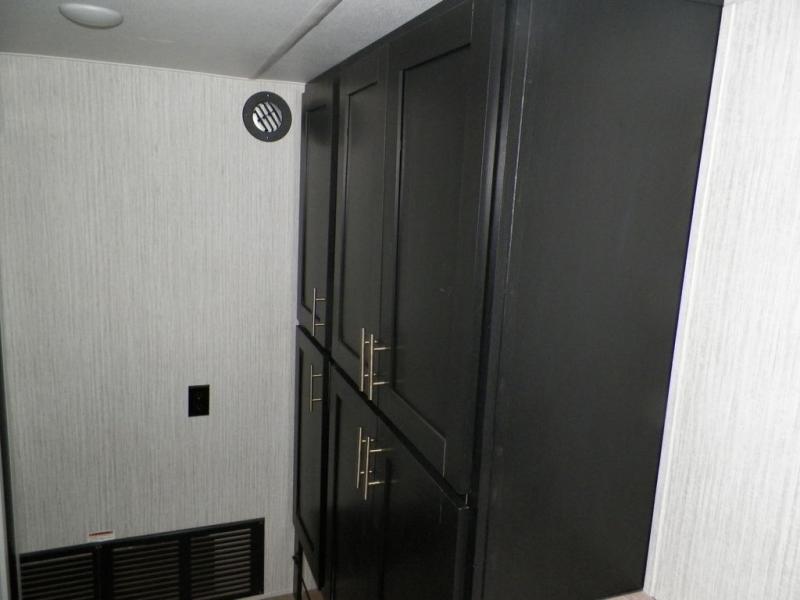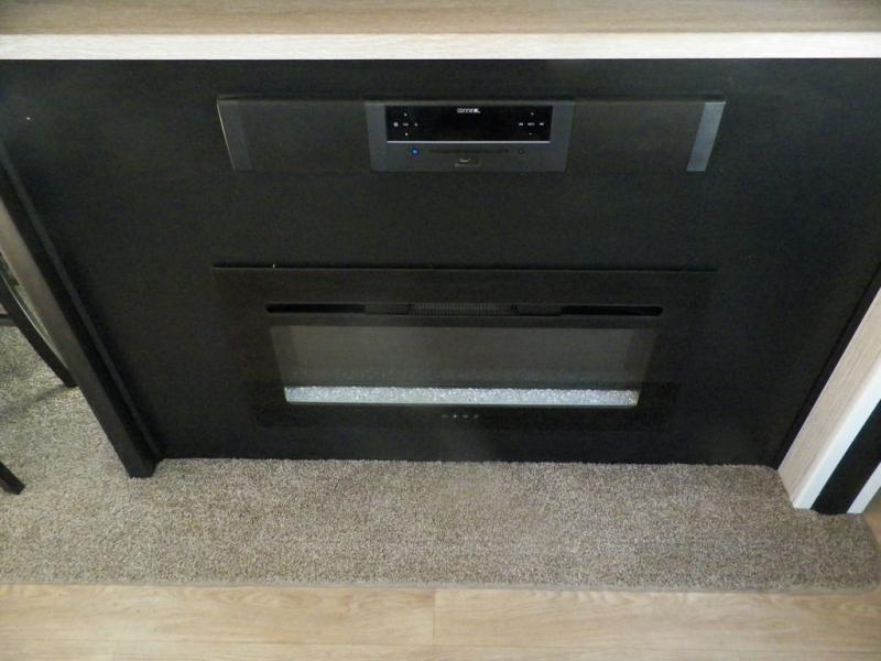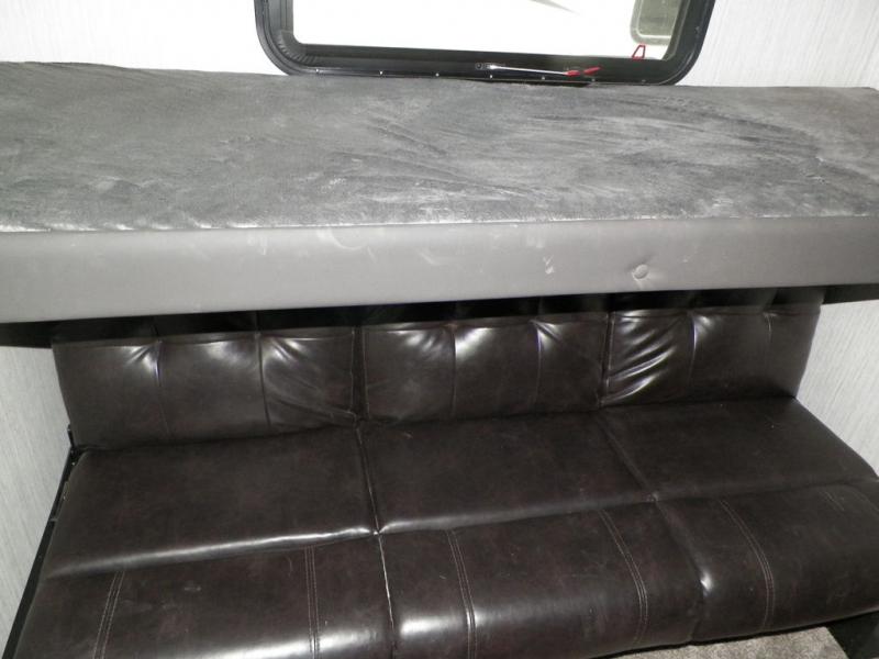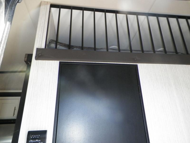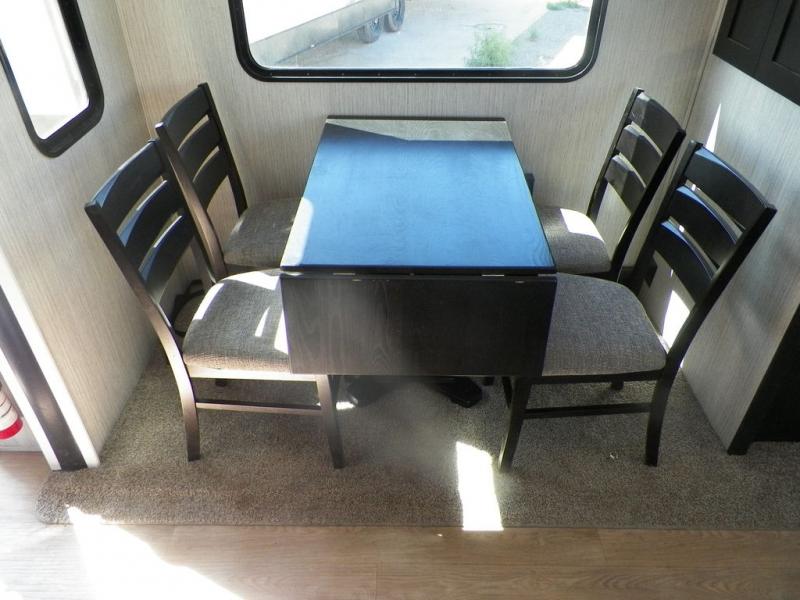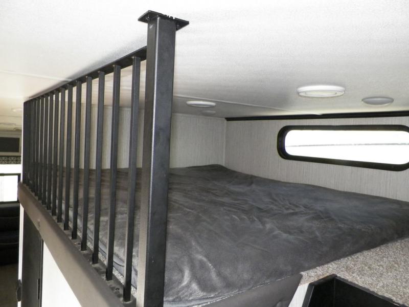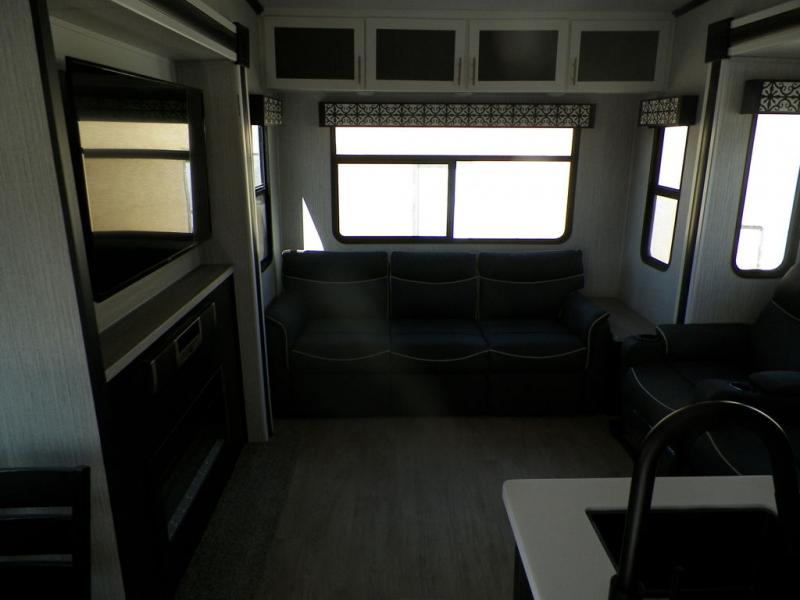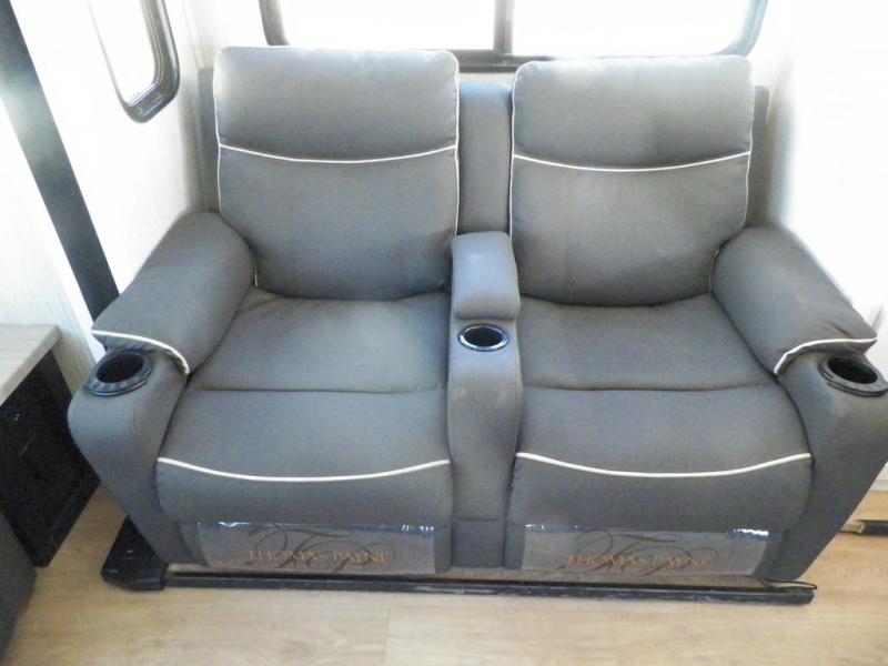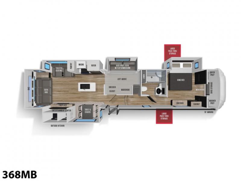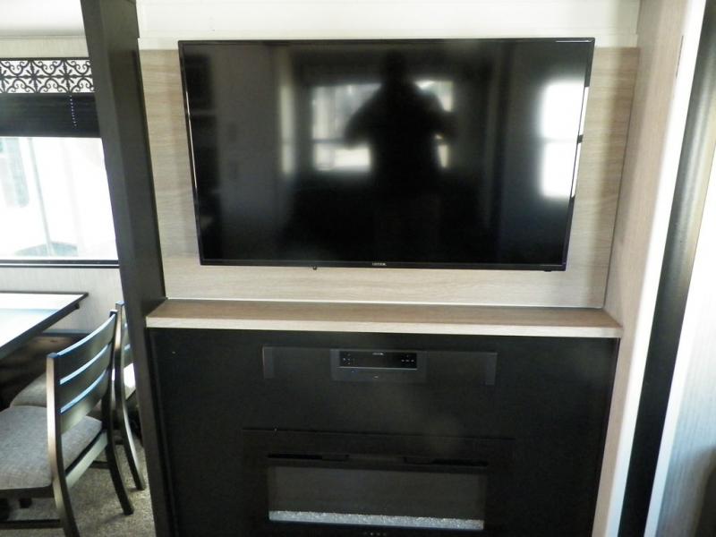 You won't believe all the amenities that have been included in this fifth wheel for your comfort. The rear living area features dual opposing slides to enjoy more interior space, and your crew can get comfortable on the theater seating and hide-a-bed sofa. There is a cozy fireplace and an LED TV within the entertainment center. The kids may want to play a board game at the free-standing table with chairs while the chef of the family prepares a meal in the spacious kitchen that includes a kitchen island and a large pantry. This model also features an outside kitchen so you can cook eggs and bacon as the sun is coming up! Your guests will love the middle bunkhouse with a jack knife sofa and a flip-down bunk, plus there is a loft above for the grandkids! You and your spouse will have the front private bedroom all to yourselves with a slide out king bed, a dresser, plus a large wardrobe with shoe storage and a place to add an optional washer and dryer! You man never want to go home after spending time in this fifth wheel!