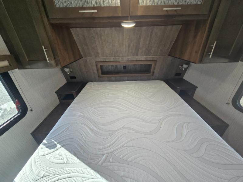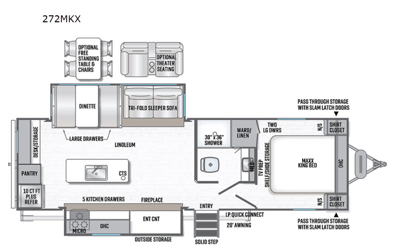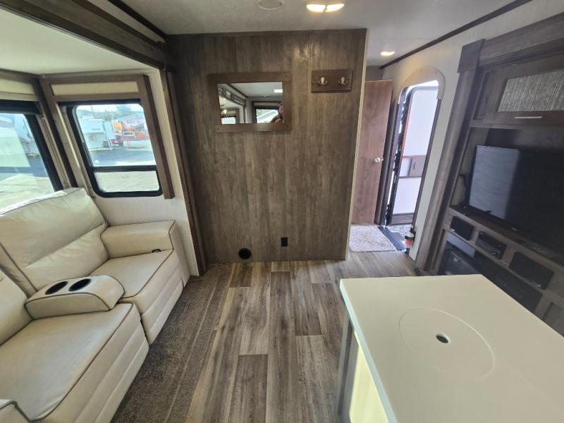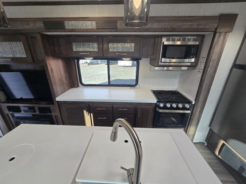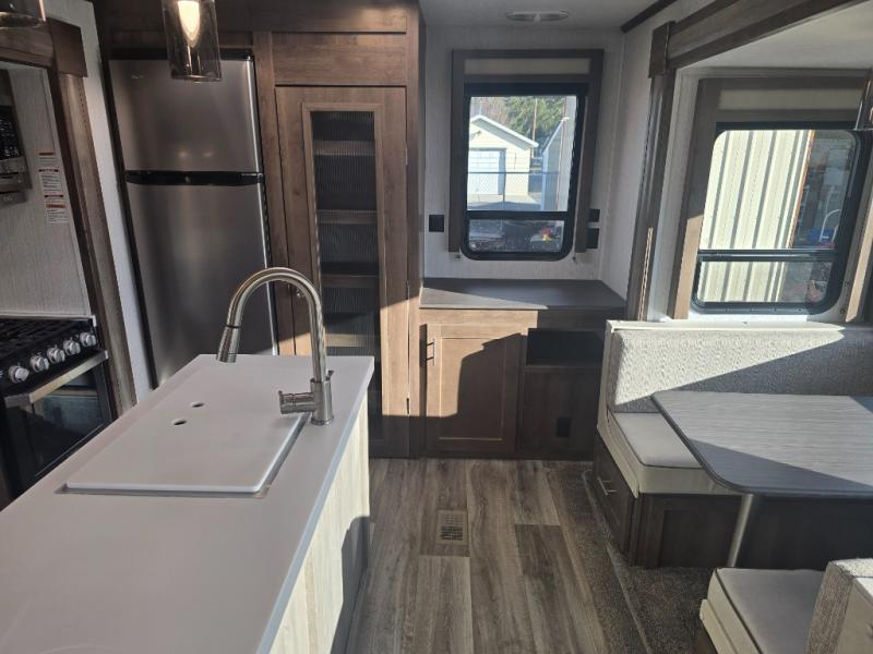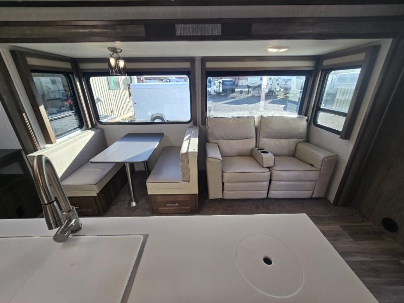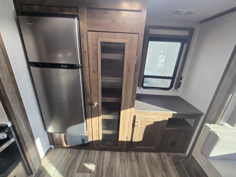 You can easily get some work done in this travel trailer with the rear desk and also stay fueled the whole time you work thanks to the pantry and 10 plus cu. ft. refrigerator being conveniently located right next to it! The booth dinette and tri-fold sofa slide out helps add more interior space, as well as comfortable places to eat your meals at and relax. The central trash system begins at the kitchen island for your convenience and leads straight to one of the outside storage areas to make trash removal even easier. The full bathroom comes with everything you could possibly need and then some, like the skylight above the 36" x 30" shower, the built in wood medicine cabinet, and the linen/wardrobe closet!