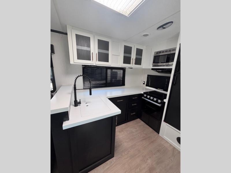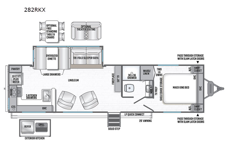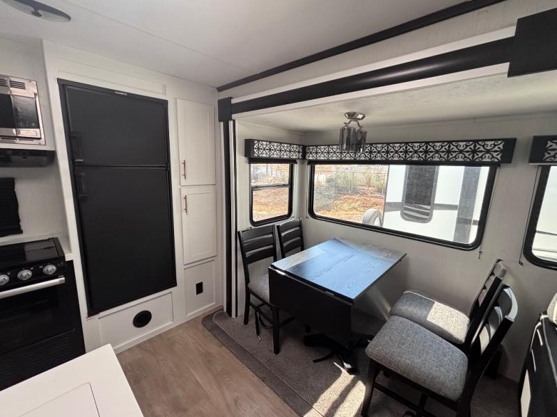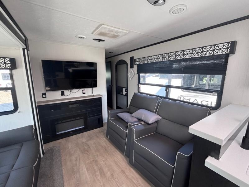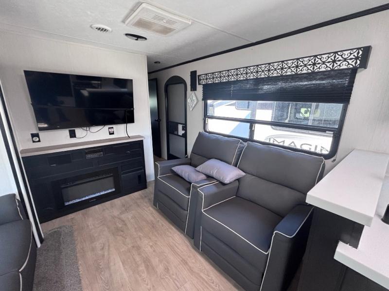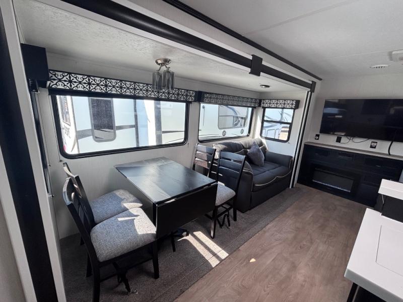Pack your bags and head to your favorite state park in this travel trailer! The chef of the family will love their options to cook in the rear kitchen indoors, or use the outside kitchen that includes a refrigerator and a grill. Your crew can relax on the lounge chairs, the tri-fold sofa, or at the oversized dinette. This travel trailer also includes a fireplace with a 50" TV so you can enjoy a nice cozy evening watching your favorite movies, and the panoramic windows will let in tons of natural light during the daytime!