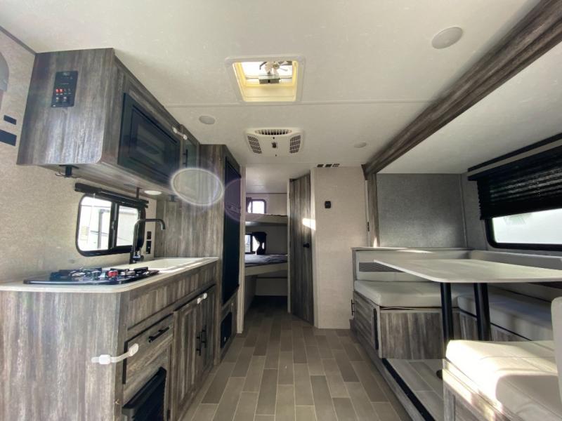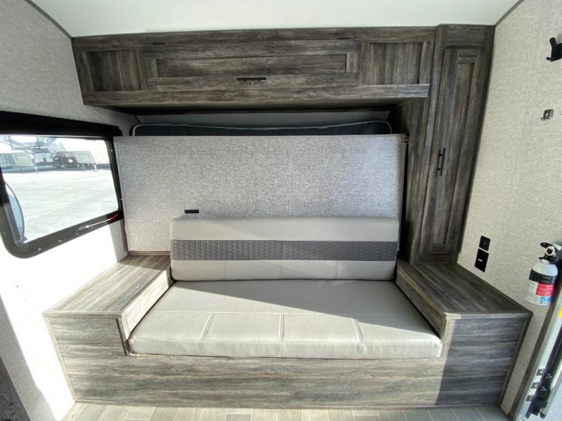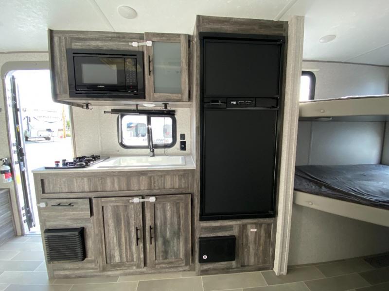 Let all of your adventures be wild with this Wildwood FSX travel trailer! The U-shaped dinette rests upon a single slide so that it can move out of the way and allow you to cook freely in the kitchen. You'll appreciate having an additional lounge spot on the sofa when the Murphy bed is folded away during the day, and for fun meal prep in the great outdoors, simply walk outside to the outdoor kitchen where you can grill up some chicken and veggies for dinner. You can also travel confidently knowing that everyone will have a comfortable place to sleep because of the double-size bunks that have been included.