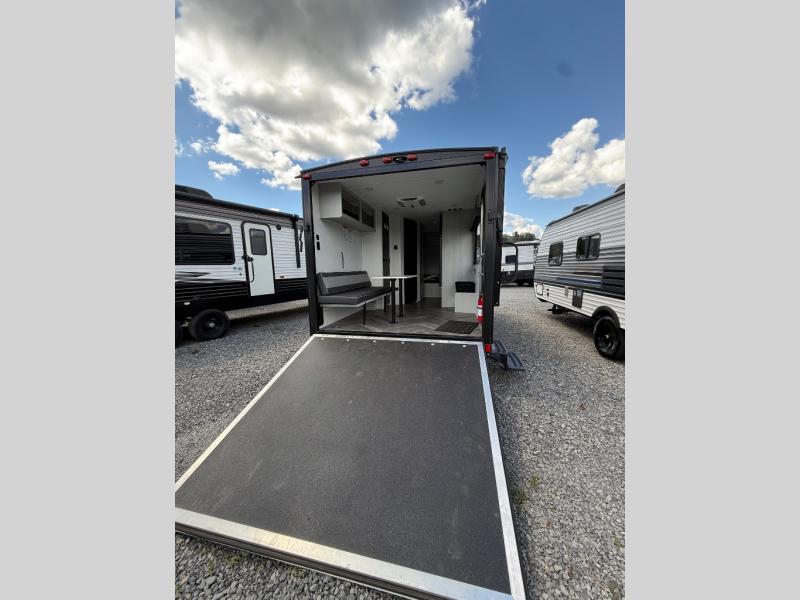 When you need a camper with a little extra room for your gear, this Wildwood FSX toy hauler will easily fill the need. The rear 82" x 75" ramp door will make loading and unloading any of your big toys easy. Even if you don't own big toys, this is still a great option for those that want to transport bicycles, kayaks, or fishing gear to your favorite weekend gathering spot. The 30" x 72" sleeper sofa is great for relaxing when inside, and you will appreciate the kitchen area and shower to keep fueled and refreshed. The 12' electric awning with LED lights is a plus for providing a shaded exterior living space to enjoy during the daytime too, and you even have an additional place to keep gear stored with the exterior pass-through storage.