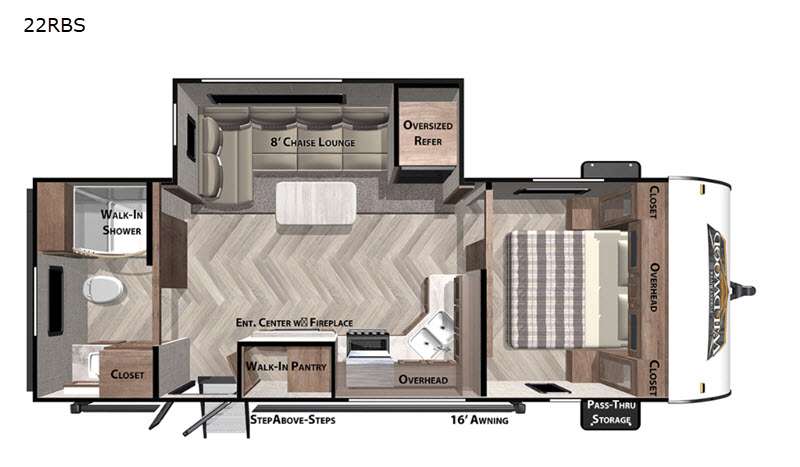 As you escape to the beautiful countryside or embark across the country to visit family, you'll find that the modern amenities found in this Wildwood travel trailer will deliver the ultimate enjoyment all along the way! Relax on the 8' chaise lounge that includes a table in front so that you can enjoy your morning coffee. When you are ready to face the day ahead, you can grab a towel from the linen closet in the rear bathroom and rinse off in the walk-in shower before heading out for a day full of adventure. This model also includes a walk-in pantry for all the goodies!