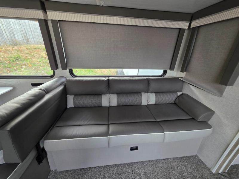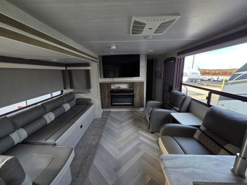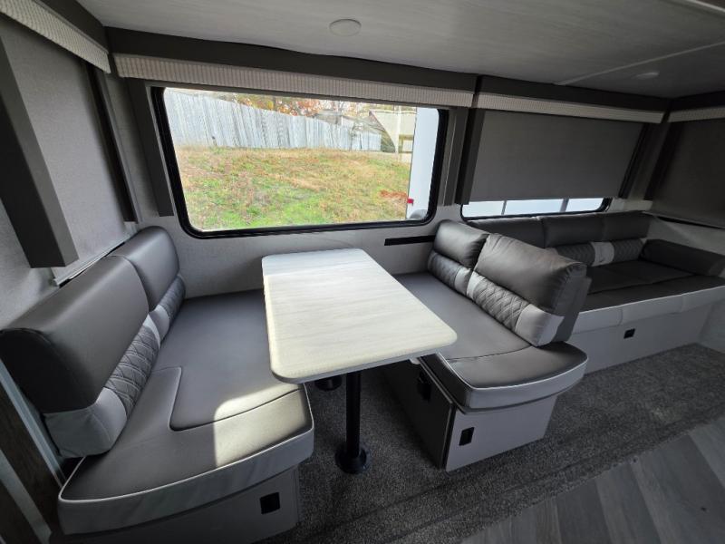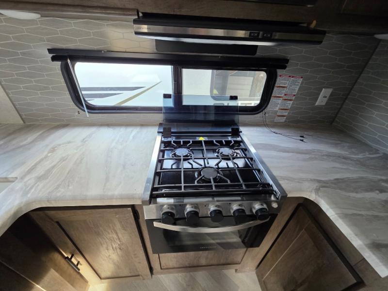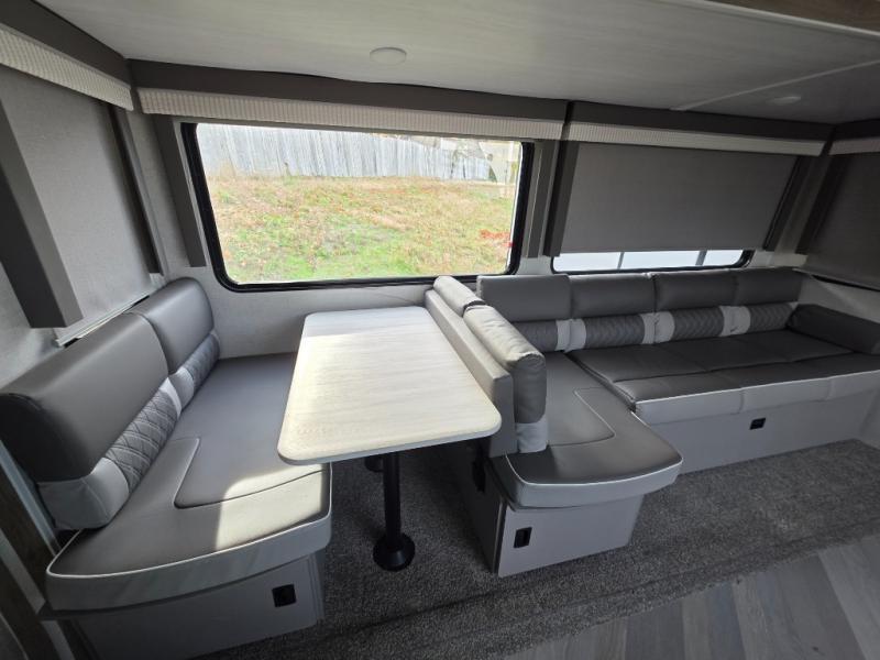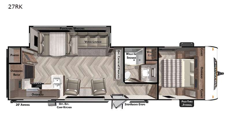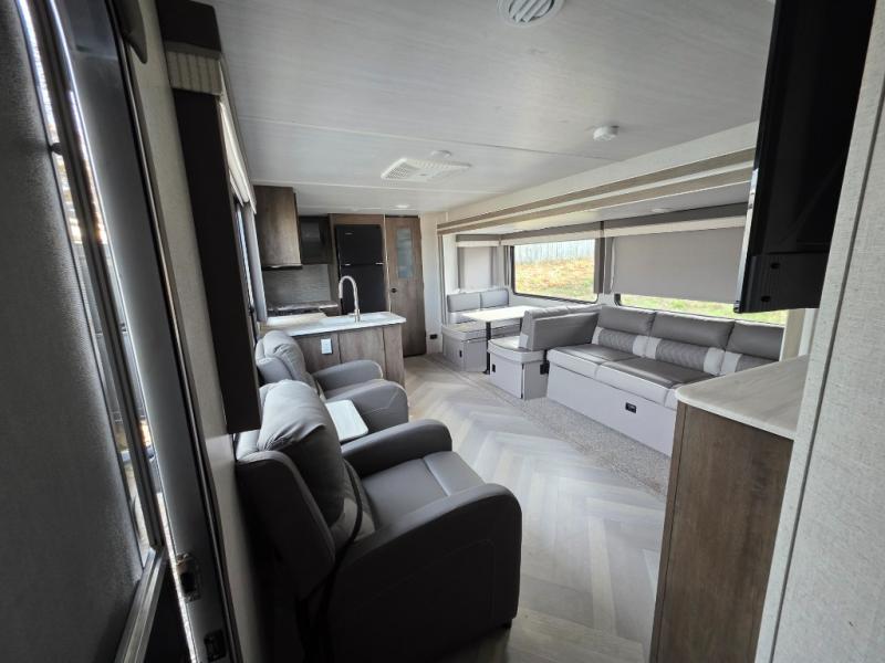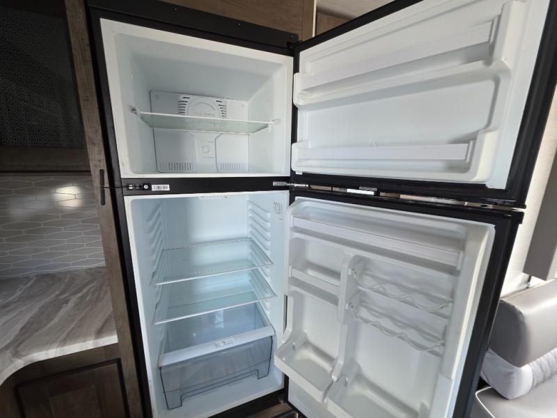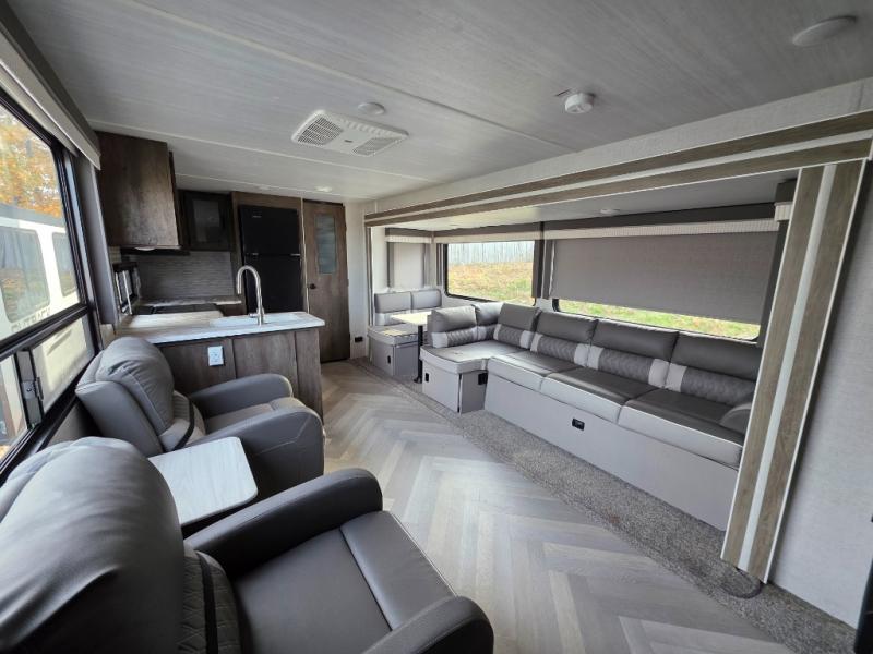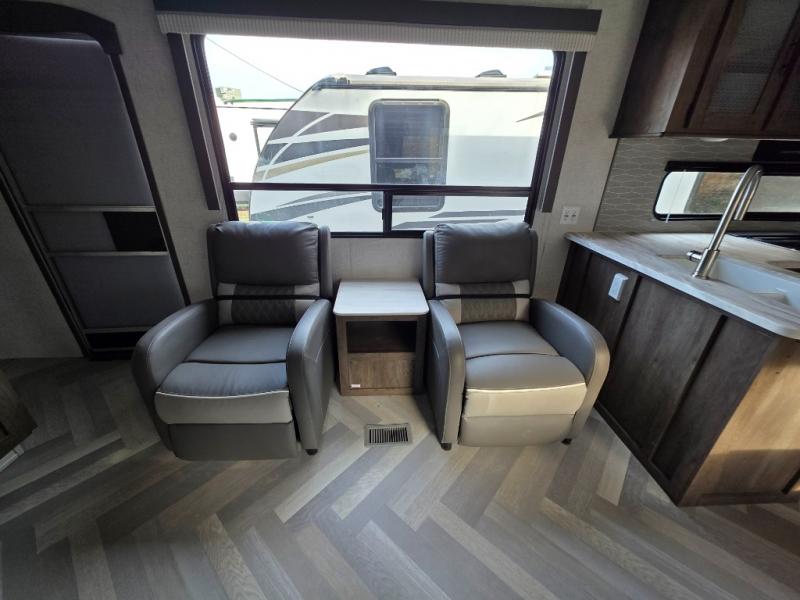 This Wildwood travel trailer is perfect for your family of five looking for a new adventure. You will enjoy the rear kitchen that includes an oversized refrigerator and a three-burner cooktop. The booth dinette within the slide out is perfect for enjoying meals, and when you're through, you can relax on the sofa. Both of these pieces of furniture are a part of the Versa Lounge which allows you to customize their function by moving the middle section to create a larger sofa or a larger dinette. This unit also includes two lounge chairs, so you'll feel right at home! You'll love the full bath in this unit, and the queen bed in the private bedroom is perfect for a good night's rest.