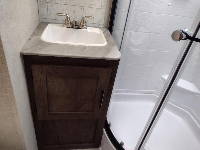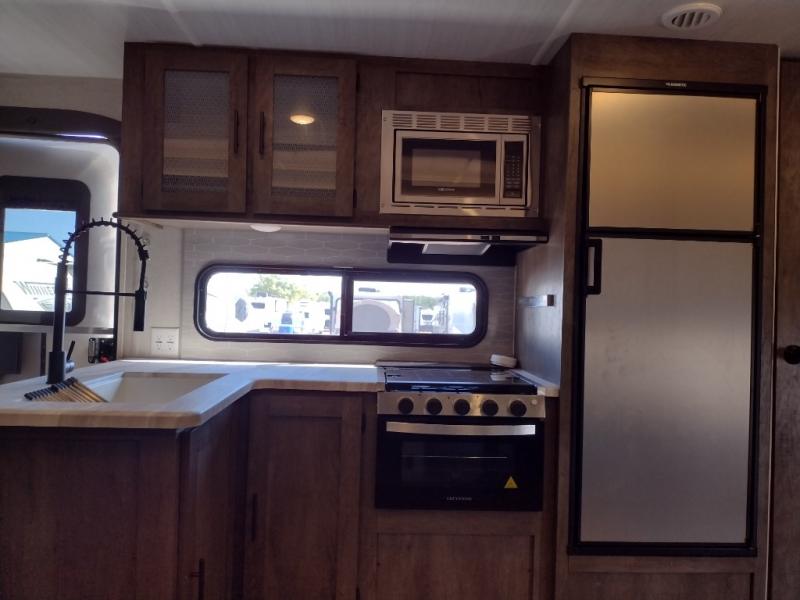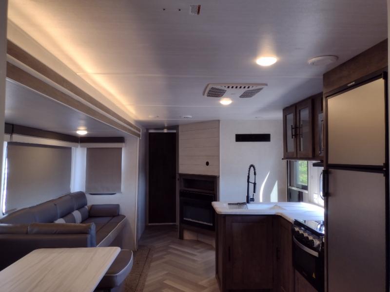 Forest River offers you the highest quality and the best components in its Wildwood travel trailer! The fully walkable one-piece roof is ultra reliable, and the rest of the construction is just as dependable with the powder-coated I-beam frame, cambered chassis, R-7 fiberglass insulation, nitrogen-filled tires, and triple-seal slide-out system. The Wildwood is not only full of quality, but it is also full of style with its herringbone luxury vinyl flooring, shiplap wall board, upgraded designer furniture, high-gloss exterior metal, and seamless countertops. The Wildwood also comes with some extra features that will make your life more comfortable, like the exterior speakers with blue LED light, the tablet-compatible USB ports, the residential vanity with shower caddy, and true stabilizer jacks with JT's Strong Arm.