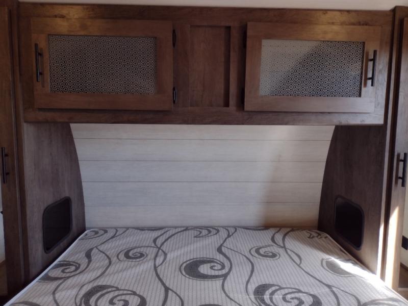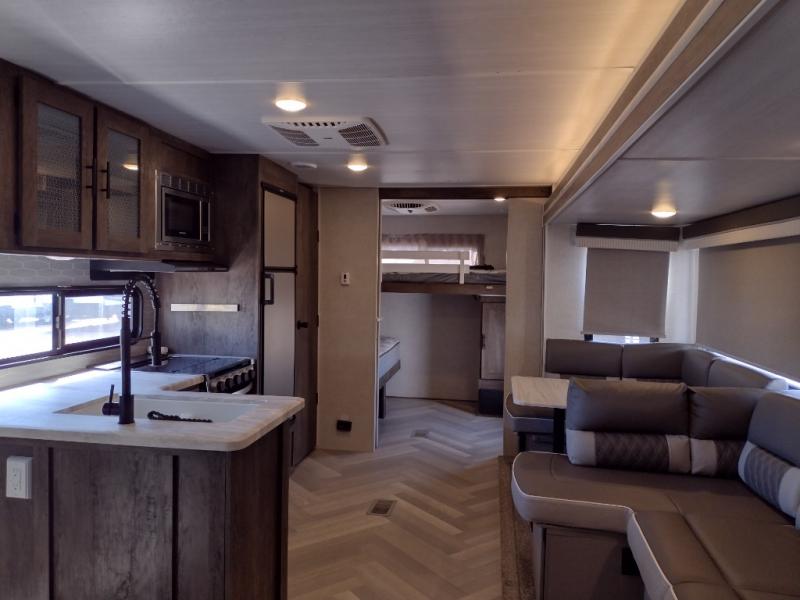 When you're ready to upgrade your RV to a unit with more sleeping space and comfort, choose this Wildwood travel trailer, and you'll never look back. After setting up camp, put out the large slide and prepare lunch indoors or outside at the exterior camp kitchen, and the 18' power awning will shade you from the sun. The kids will find all their snacks in the walk-in pantry, and they can grab a cold drink from the 11-cubic foot refrigerator. The U-shaped dinette is a part of the Versa Lounge, and it will provide comfortable seating space. This model features a rear private bunkhouse with a Versa queen bed and two Versa bunks, and you will love the front private bedroom that includes dual bedside closets.