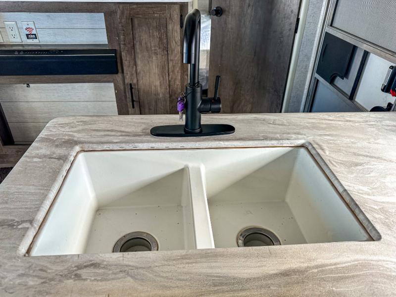 Get ready for your next weekend getaway to your local state park with this double-slide Wildwood travel trailer. The private bunkhouse is perfect for the kids, and you can enjoy the front private bedroom with a queen bed. This unit also includes a U-shaped dinette and sofa which create the Versa Lounge, and the kitchen features an L-shaped countertop which allows you to have more space to cut and prepare a meal. The double-bowl sink is perfect for cleaning up afterward, and you'll love how convenient the full bath is with its own exterior entry door.