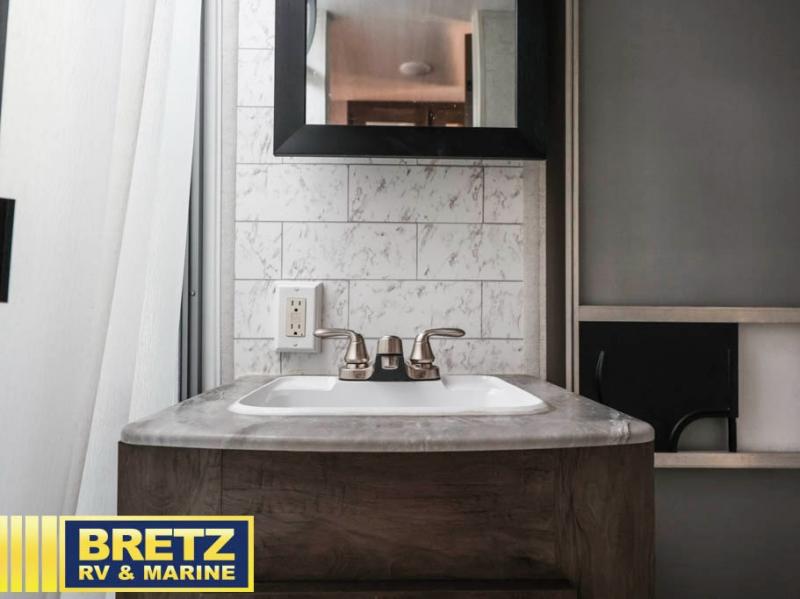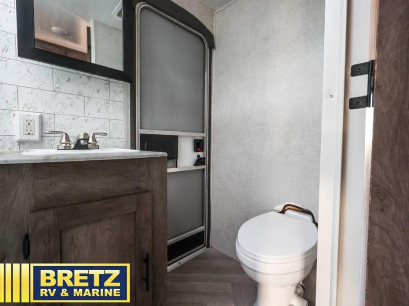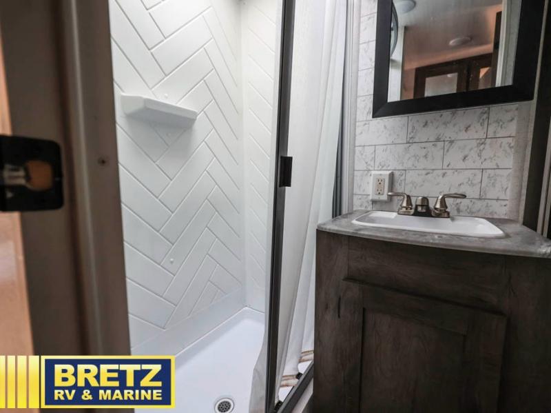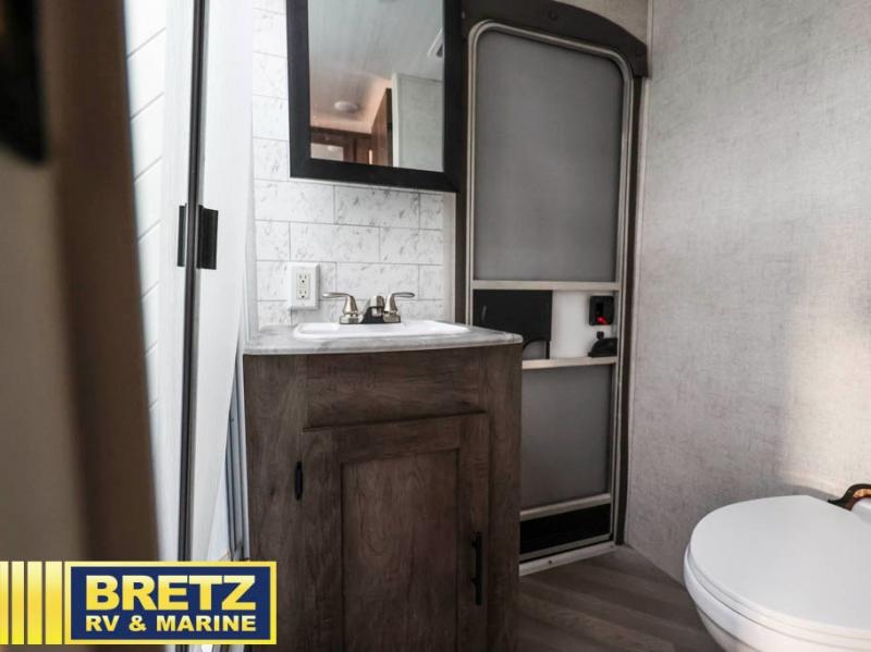 Forest River offers you the highest quality and the best components in its Wildwood travel trailer! The fully walkable one-piece roof is ultra reliable, and the rest of the construction is just as dependable with the powder-coated I-beam frame, cambered chassis, R-7 fiberglass insulation, nitrogen-filled tires, and triple-seal slide-out system. The Wildwood is not only full of quality, but it is also full of style with its herringbone luxury vinyl flooring, shiplap wall board, upgraded designer furniture, high-gloss exterior metal, and seamless countertops. The Wildwood also comes with some extra features that will make your life more comfortable, like the exterior speakers with blue LED light, the tablet-compatible USB ports, the residential vanity with shower caddy, and true stabilizer jacks with JT's Strong Arm.