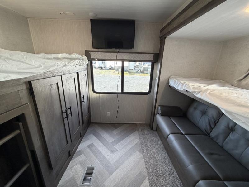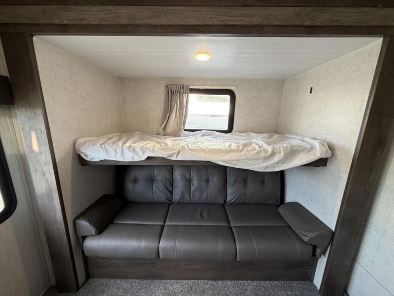 Have you been searching for the perfect travel trailer for your family? This Wildwood might just be the RV you have been looking for. Just imagine hiking, biking and playing horse shoes at your favorite campground to return to plenty of space for everything thanks to the triple slides, one in each room. The kiddos will surely head to the rear private bunkhouse to claim a bunk bed while you take a nap on the custom king bed in the front bedroom. You might even put a load of clothes in the washer and dryer if you chose to add that option. You can then make dinner on the outside kitchen or in the full kitchen inside. Everyone can play games or relax on the Versa Lounge before heading outside to see the stars. Check it out!