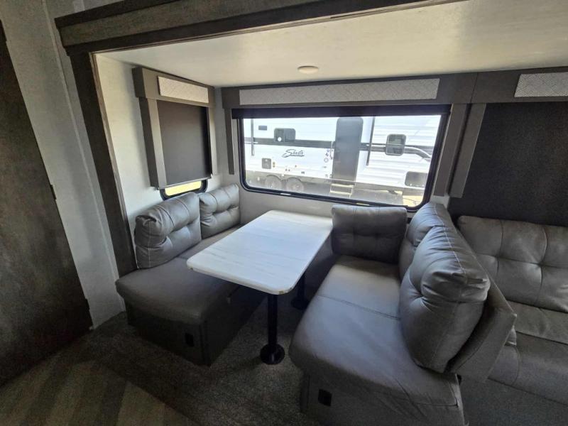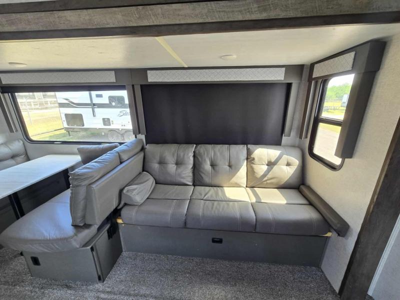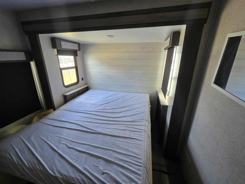 You're going to love this Wildwood travel trailer and its unique layout. The private bunkhouse is up front, and the private bedroom is at the rear of the unit. You will love the walk-through bath that leads into the bedroom, and the queen bed slide out provides more interior space. Enjoy breakfast at the booth dinette, and the Versa Lounge will provide a comfortable place to take an afternoon nap before heading back out to explore. The kids will love the front private bunkhouse with its Versa queen bed and Versa bunk beds. This model also includes an 18' power awning that will shade you during the day and create an outdoor living space you are sure to love.