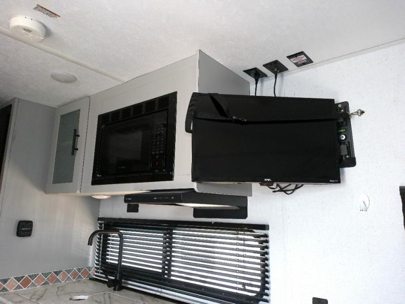 Let all of your adventures be full of fun and excitement with this Wildwood FSX travel trailer! Keep lots of gear stored away in the exterior pass-through storage compartment so that you can keep the interior free from clutter. The bathroom linen closet will hold onto your towels so that they are readily available when you shower, and the 11-cubic foot refrigerator will keep your perishable items cold throughout your trip so that they are ready to be used for meals. You'll enjoy the functionality of the Murphy bed up front because it can fold away to reveal a sofa with end tables that you can use to lounge on during the day.