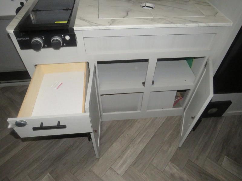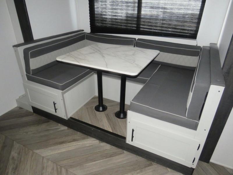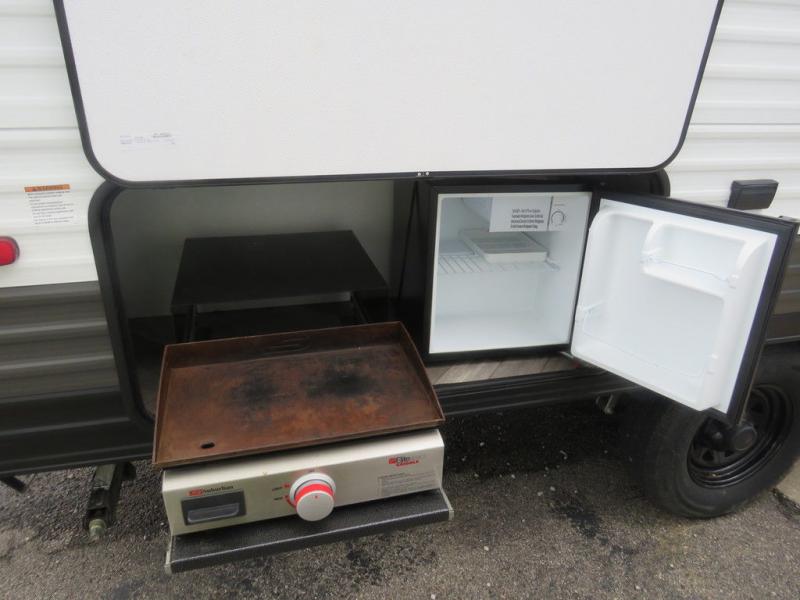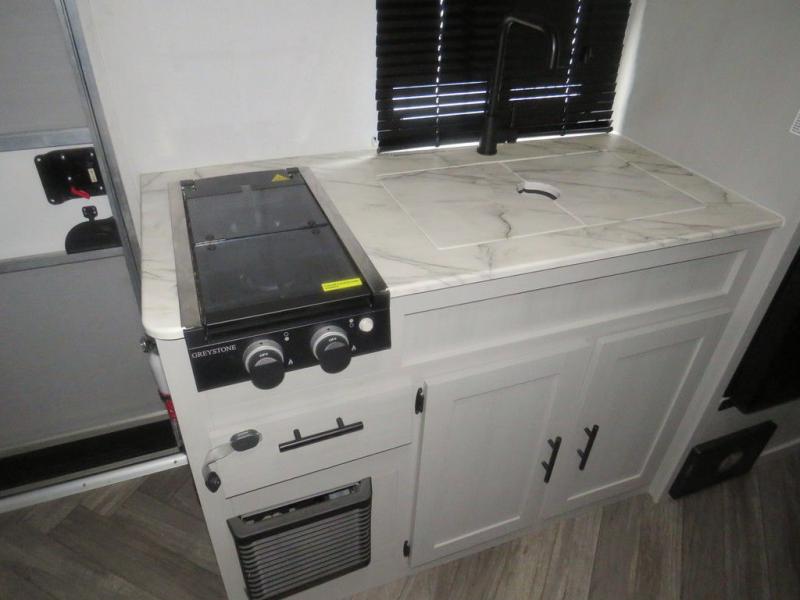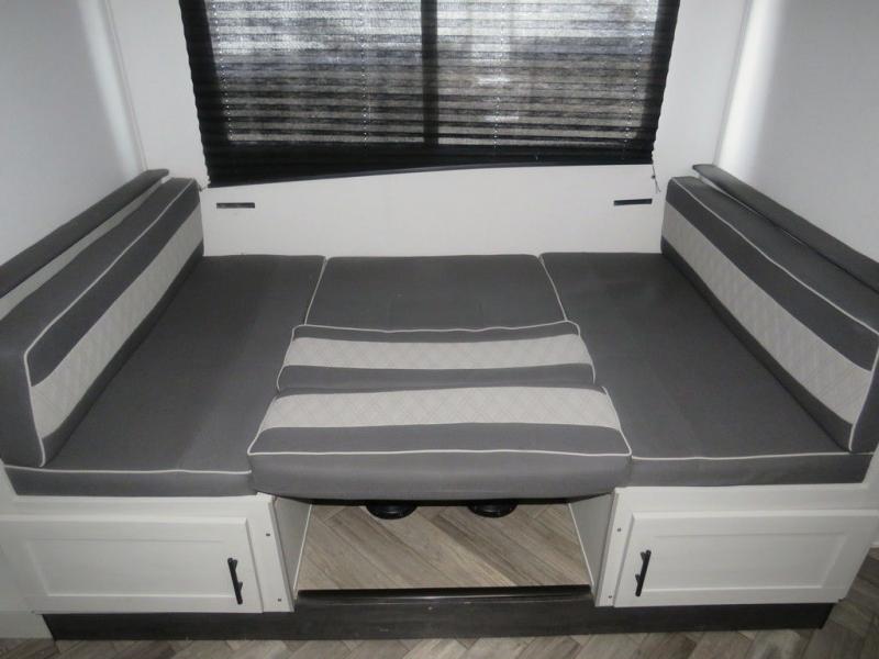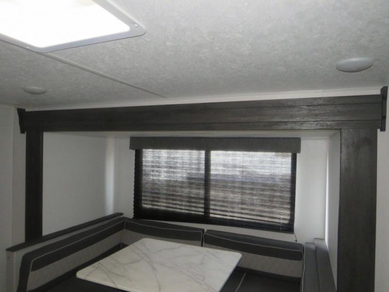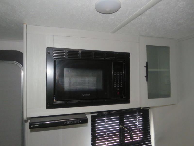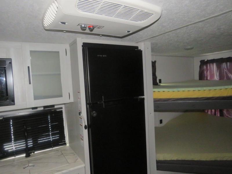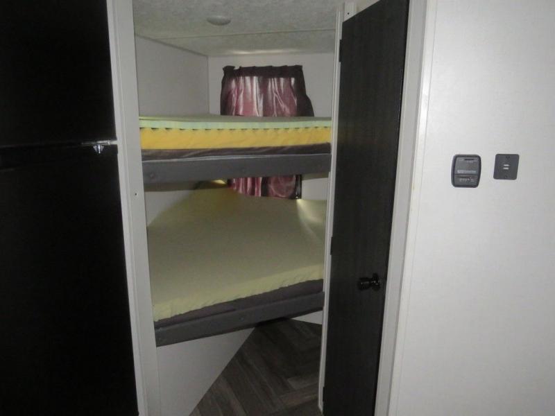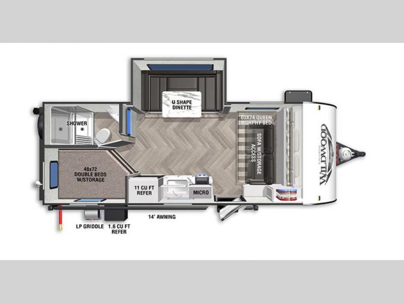 Let all of your adventures be wild with this Wildwood FSX travel trailer! The U-shaped dinette rests upon a single slide so that it can move out of the way and allow you to cook freely in the kitchen. You'll appreciate having an additional lounge spot on the sofa when the Murphy bed is folded away during the day, and for fun meal prep in the great outdoors, simply walk outside to the outdoor griddle and refrigerator where you can grill up some chicken and veggies for dinner. You can also travel confidently knowing that everyone will have a comfortable place to sleep because of the double-size bunks that have been included.