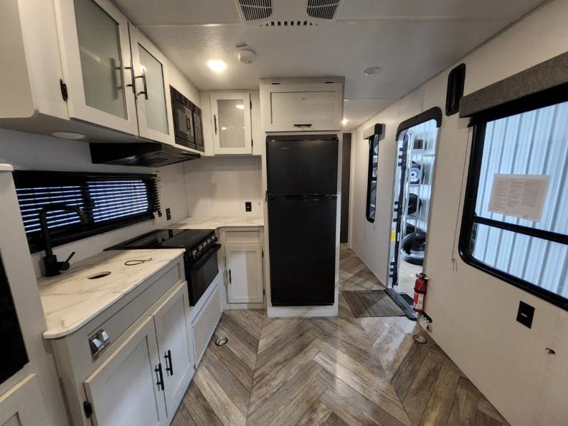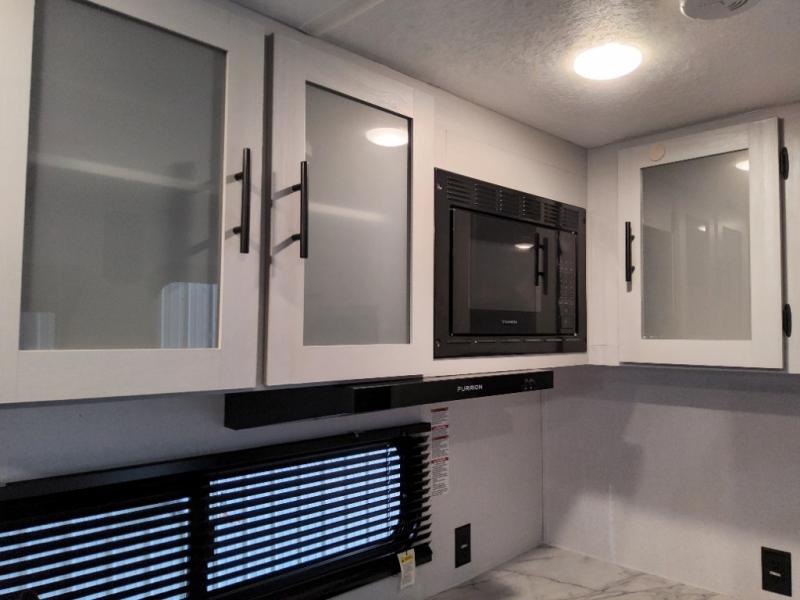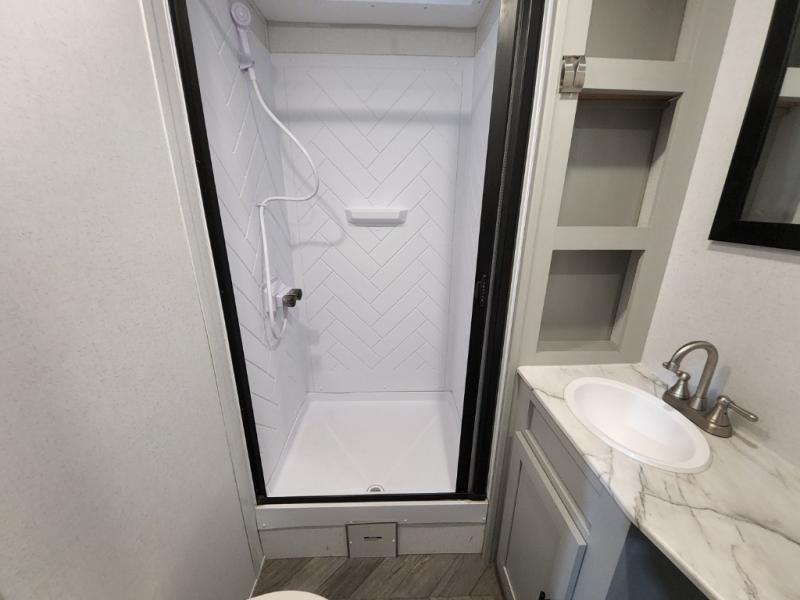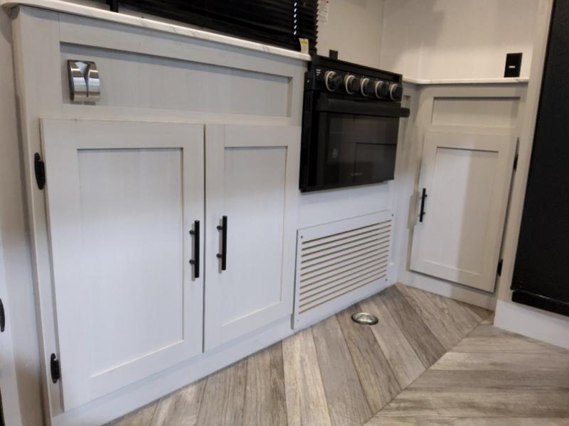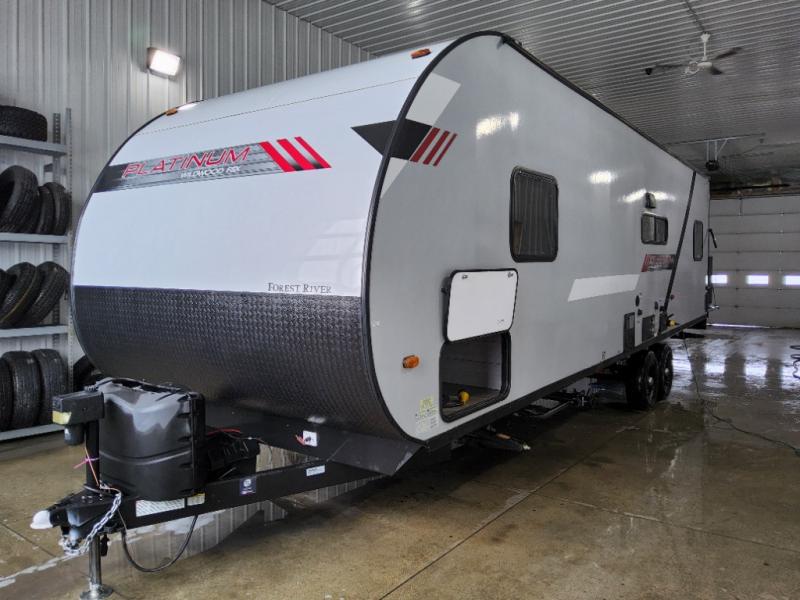 The Forest River Wildwood FSX travel trailer and toy hauler comes with a Best-In-Class Package that truly is the best! Some of the features you'll find in this package are the enclosed Accessibelly, the large-capacity 11-cubic foot refrigerator, the seamless countertops, the outside hot/cold shower, the power awning with adjustable legs and LED lights, and the preparation for Wi-Fi. You'll also notice that the Wildwood FSX provides you with exceptional views of your surroundings with its largest-in-class opening panoramic windows, and the herringbone pattern luxury extra-thick vinyl flooring is an excellent base that will be easy to keep clean. Some other notable features are the TUFFCOAT scratch-resistant exterior paint, the tablet-compatible USB ports, and the residential high-rise kitchen faucet. These Platinum Edition trailers also come with smooth fiberglass exterior walls, a .040 smooth front metal plate, a Platinum graphics package, and upgraded steel wheels.