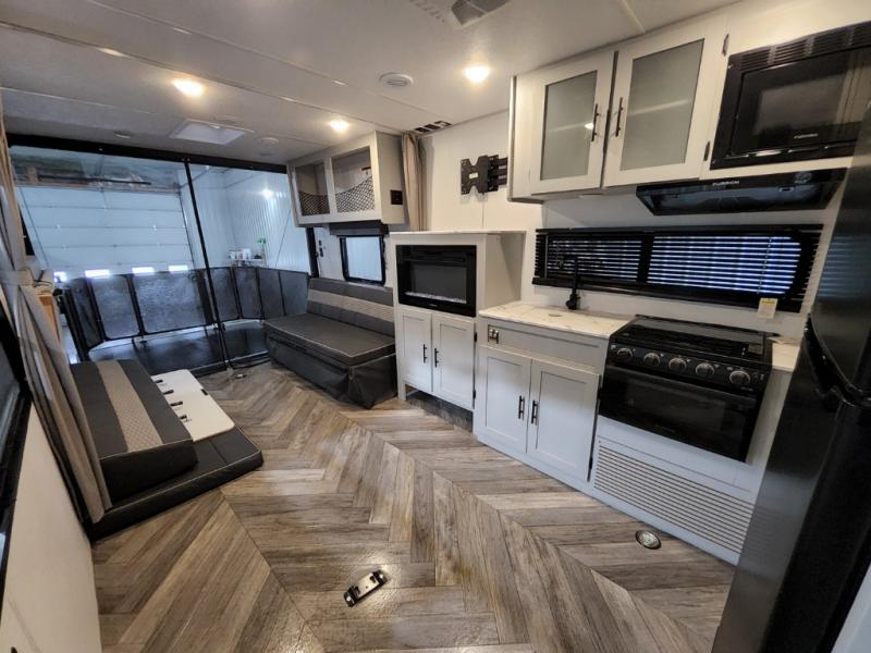Spend your weekends taking your excursions up a notch with this Wildwood FSX MAX Platinum Edition toy hauler! This trailer takes everything to the max with its extended power package that has a roof-mounted 190W solar panel, a 30 amp controller, and single battery, and you also have the maximum loading convenience with the easy-open patio kit for full ramp usage when loading toys. Some other features that make this MAX toy hauler special are the six Stow N Go storage containers under the sofas, the Morryde stable step, the 5,000-LB stabilizer jacks, and the built-in electric fireplace. The private bedroom will be a great place to wind down your evenings, and you can always prepare any meal that you're craving with the upgraded appliance package in the kitchen.