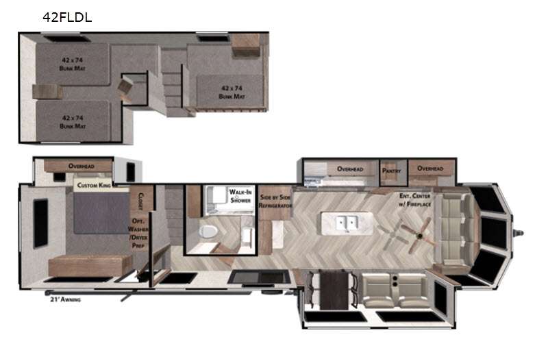 Keep your family happy by providing them with plenty of space and accommodations in this Wildwood Grand Lodge destination trailer! The living area is such a gorgeous feature in this unit because of the panoramic front windows that allow you to feel as if you're right in the heart of your surroundings, and as you sit on the sofa next to the fireplace, you'll appreciate the ambiance it brings to this space. If you've decided to stay up late outside underneath the 21' awning, you can rest assured that you'll be able to get back inside quietly without waking anyone up because the second entry door leads directly into the rear private bedroom for your convenience so you can quickly fall asleep on your own custom king bed. And the kids will love the double loft with three bunk mats and extra floor space to play.