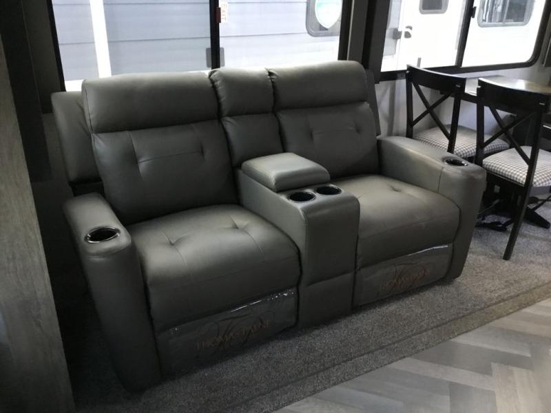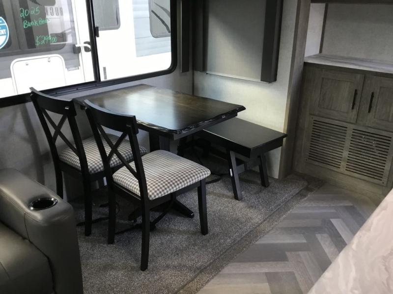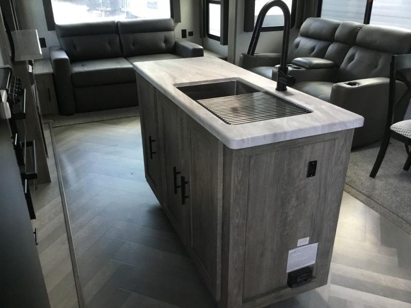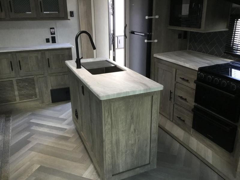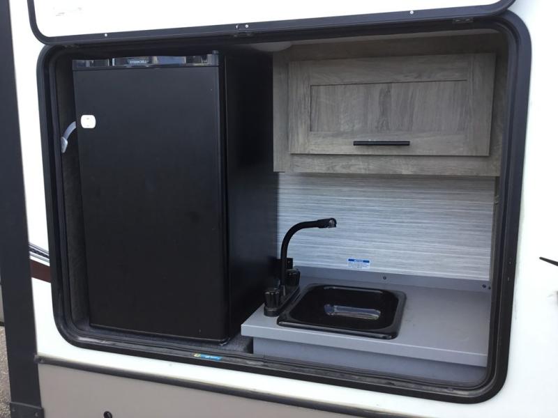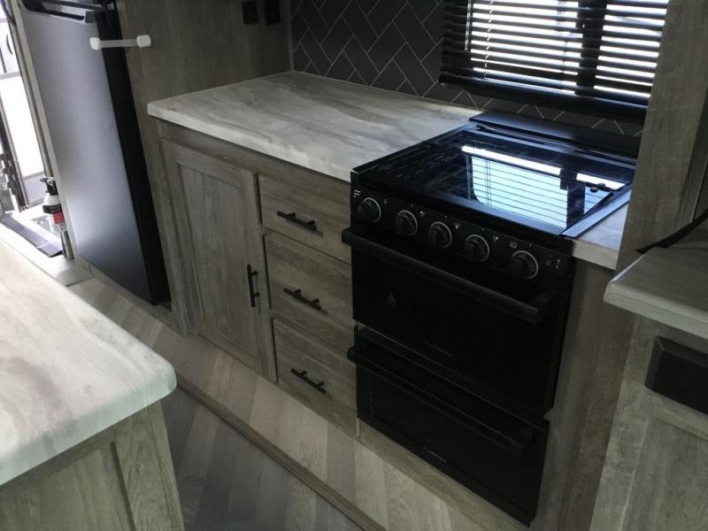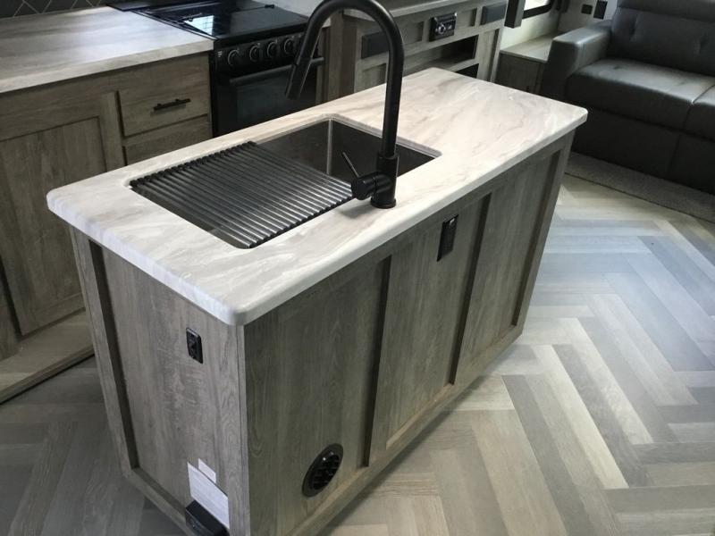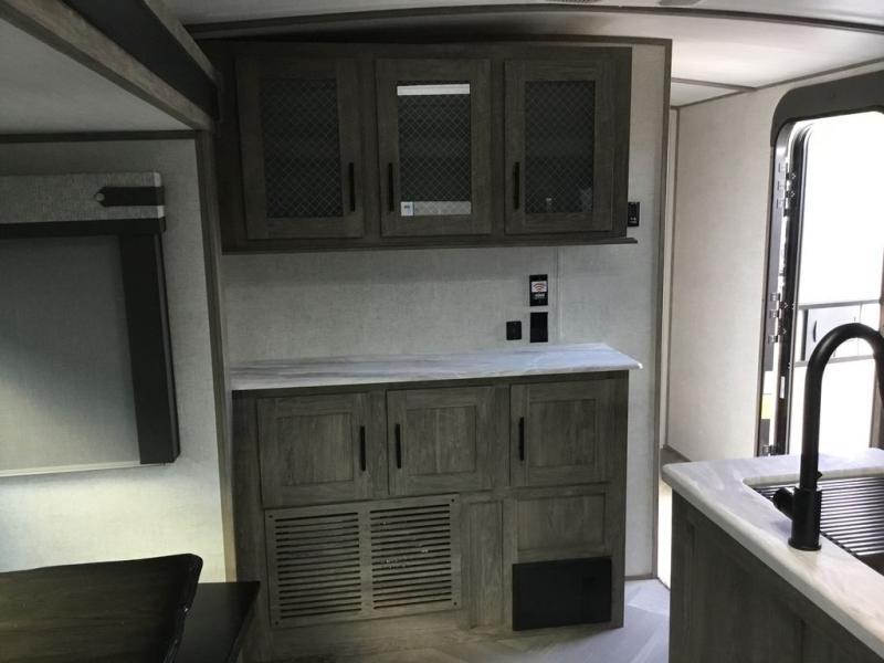 It's time to head to your destination with this Wildwood Heritage Glen travel trailer, whether it be a state park, RV resort, or your own land. Once you arrive, you can easily open up the two slide outs for more interior space and start planning your day. You might like to cook a meal, wash dishes using the kitchen island, and dine at the booth dinette, or you can choose the free-standing table option instead. One thing is for sure, you will love looking out the panoramic window. Your spouse may choose to relax in the theatre seats or the tri-fold sofa while watching TV, and the outside kitchen with bar will surely be a useful area when wanting to be outside. Don't worry about storage because the Texas-size pass-through compartment is available for your camping chairs, tables, fishing rods, and such.