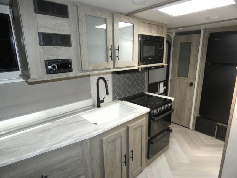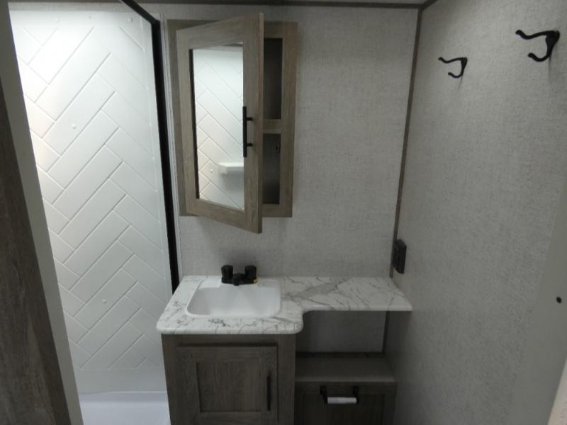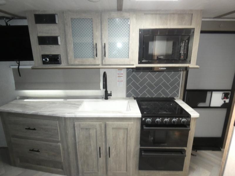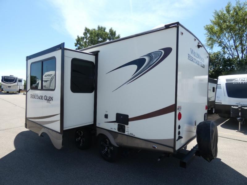 The Wildwood Heritage Glen Hyper-Lyte travel trailer by Forest River offers stability with a wide stance axle system, easy setup with a power tongue jack with LED docking light, and safe entry with the Step Above aluminum entry steps plus the XL Lend-a-Hand entry grab handle to the main entrance. The XL Max-Tint panoramic window(s) in the main slide bring the outside inside, plus the kitchen offers a recessed glass stove top cover, a Midnight glass range hood and microwave, plus more. You will also find a back-up camera and roof-mounted solar panel prep. There is so much more to love about these travel trailers, choose your favorite today!