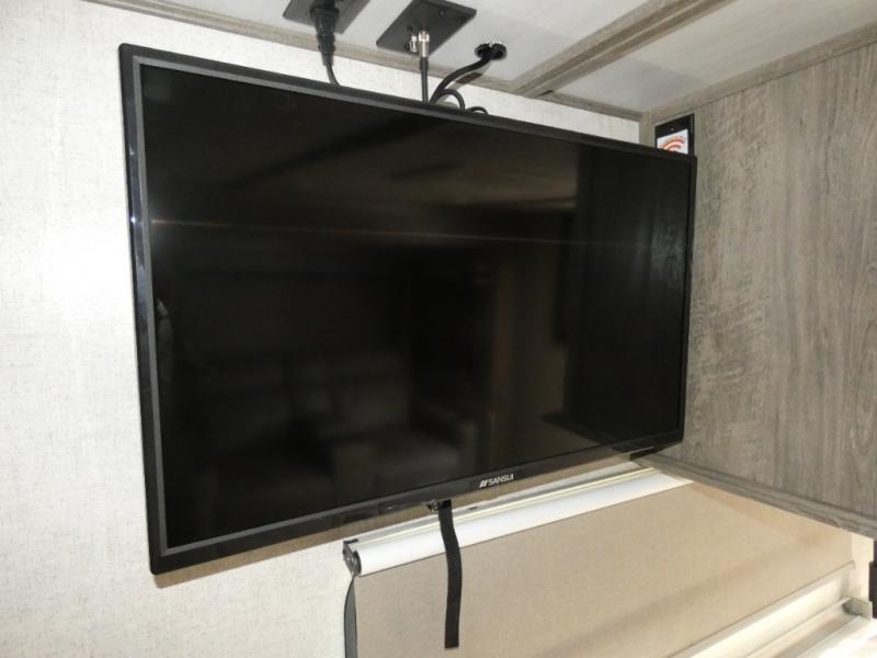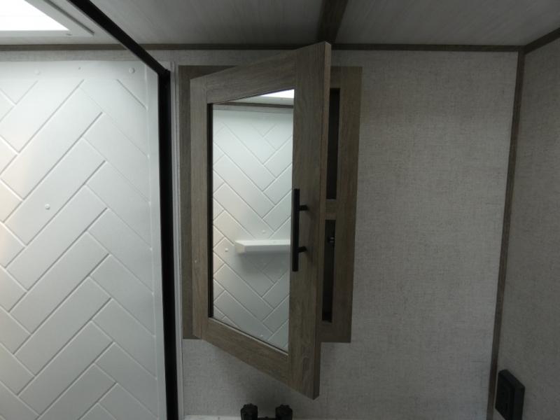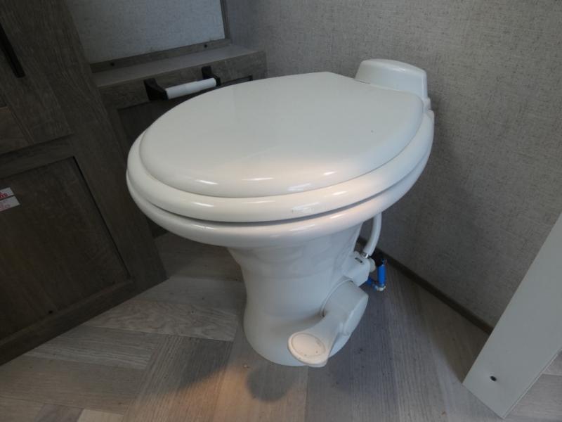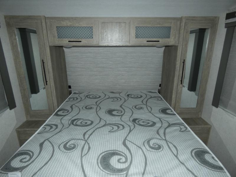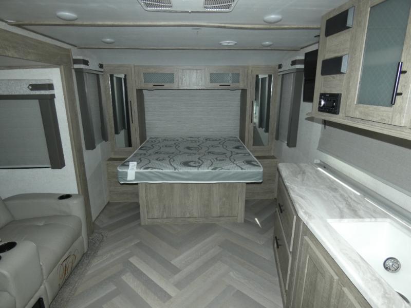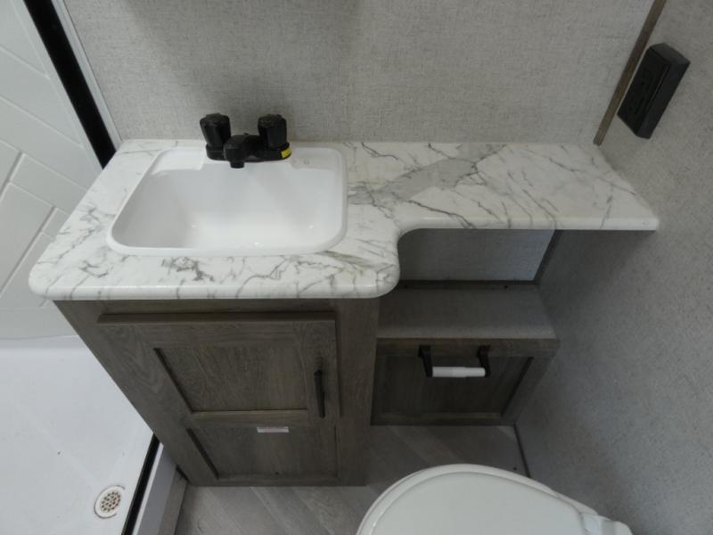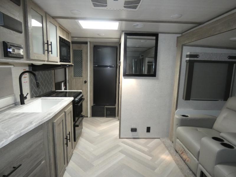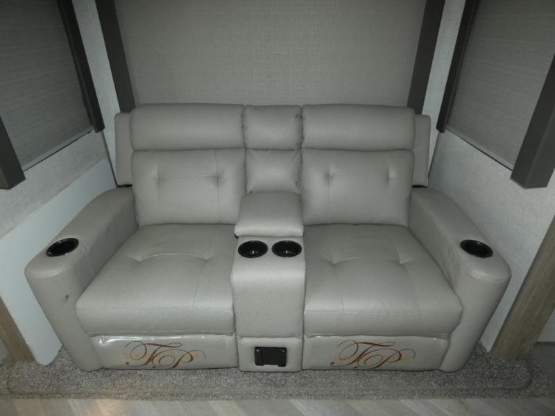 You and your favorite person can enjoy a spacious kitchen and living area thanks to the slide out, plus outside a living area is created with the 18' awning with LED lights. You will also find a coax/TV hookup and a LP quick connect, plus a Texas-sized pass-through storage to grab your camp chairs and games from. Back inside you can take a potty break in the full bathroom which also includes a walk-in shower and linen storage. The cook will appreciate having solid surface countertops, a pantry and residential refrigerator a few steps away from the microwave and stovetop when whipping up a meal. When it is time to relax the theater seats will be calling your name unless the front queen bed does first.