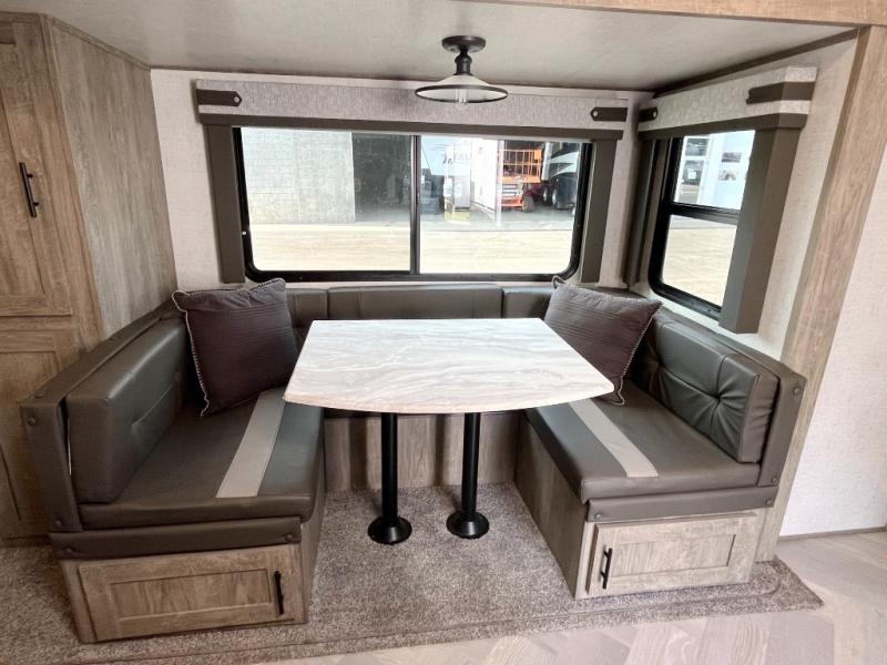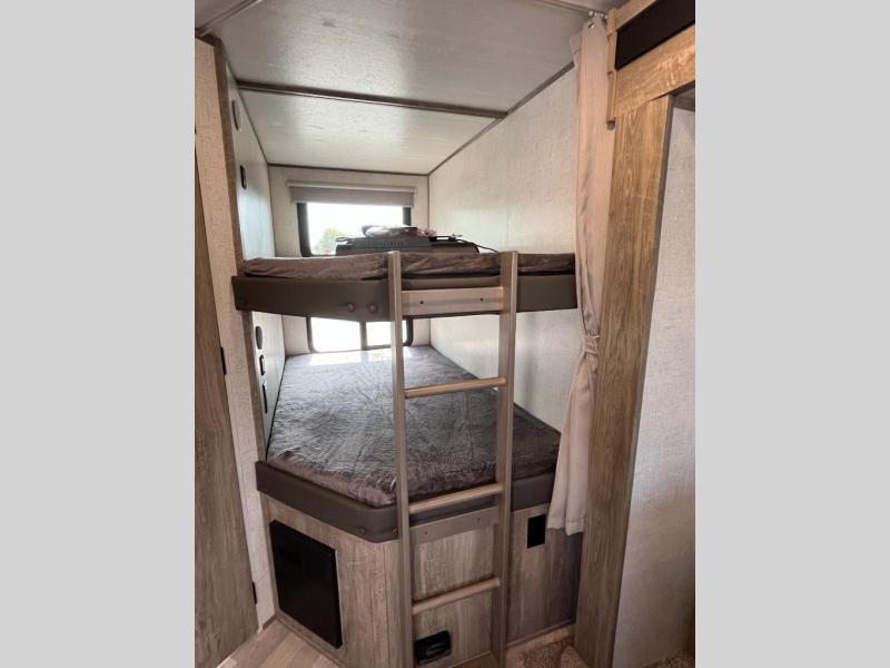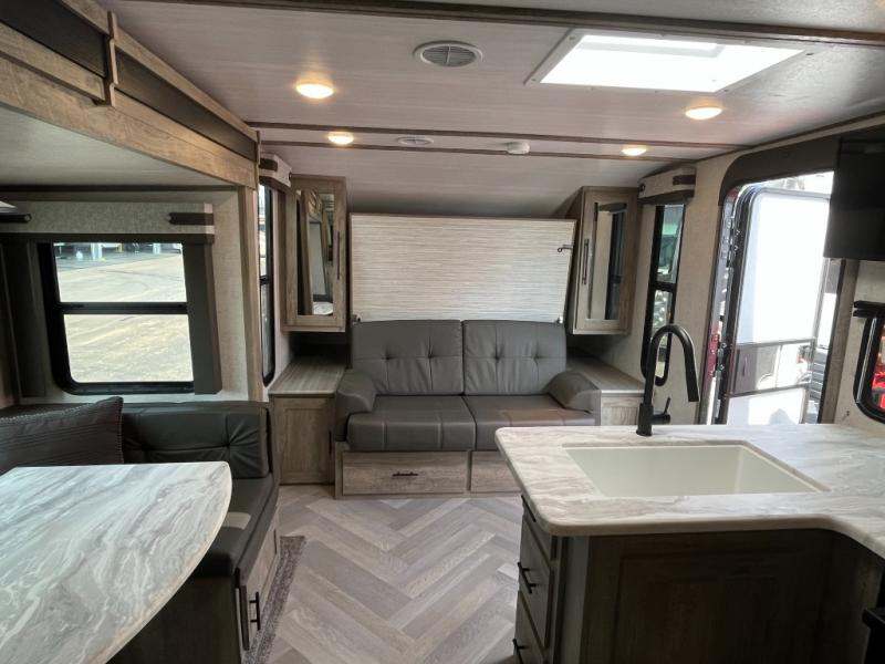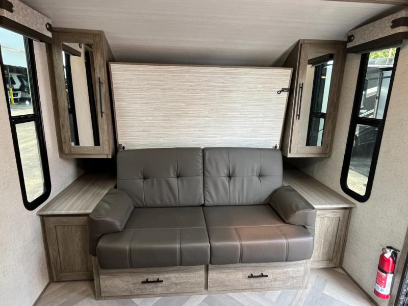 Load up your clothing, food and camping gear to enjoy a weekend with your family or friends in the great outdoors! Once at your destination easily set up the slide out and the 18' awning with LED lights and start getting all your gear from the Texas-sized pass-through storage. You can then relax on the jiffy sofa or family-sized U-dinette before making a meal in the kitchen which offers an L-shaped counter, a residential refrigerator, and more! You can also enjoy the 32" LED TV. Someone might like to cook using the outside kitchen/bar, and the spray port will come in handy when cleaning the family pet. You will have a full bathroom to get cleaned up in, and the kids or your guests will love having bunks beds to sleep on at night, and you will have a versatile Murphy bed up front.