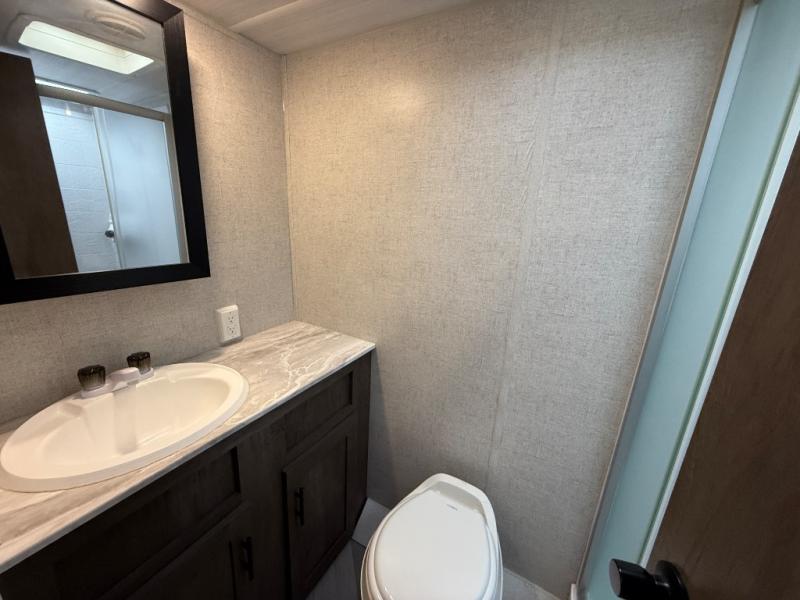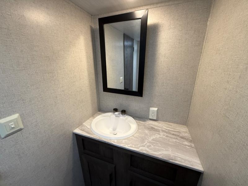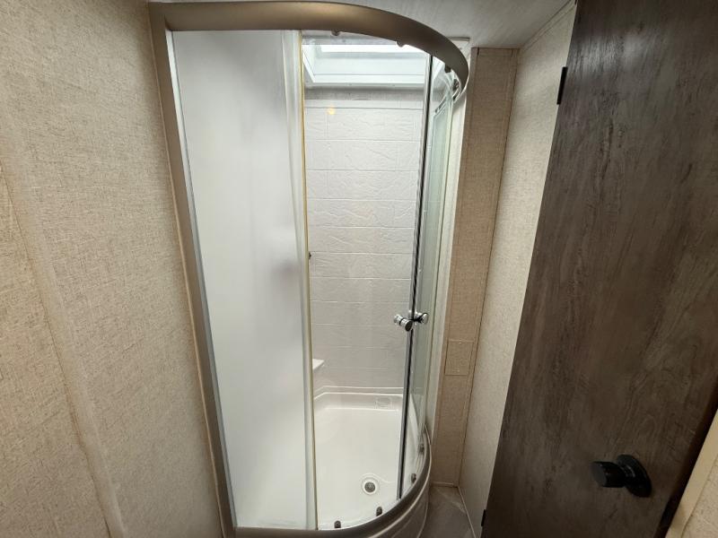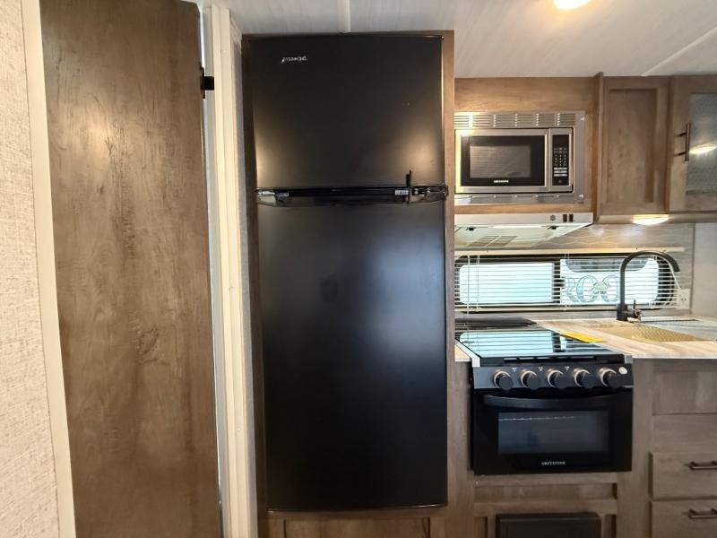 This Wildwood X-Lite travel trailer has a huge campsite window that will allow you to enjoy the spectacular outside landscape from the comfort of your trailer! You can also enjoy a comfortable area to get cleaned up in with the spacious rear bathroom that has a residential vanity with shower caddy. The front walk-around bed can be sectioned off into a semi-private bedroom by drawing the privacy curtain, and you will find the countertop extension in the kitchen to be useful as you prep dinner or do the dishes.