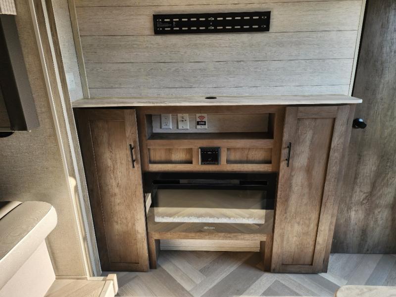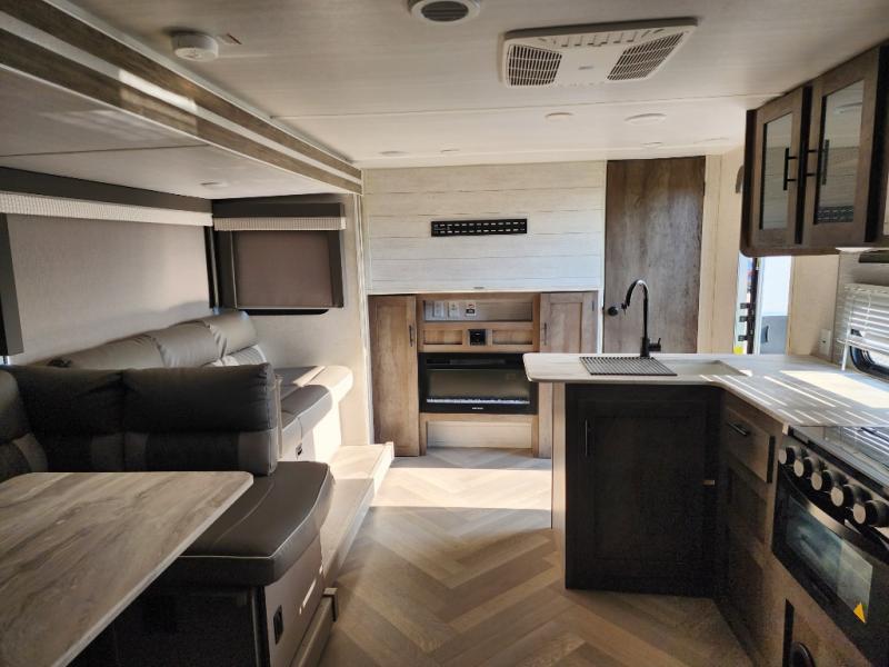 If you need a trailer that will enhance your family getaways, this Wildwood X-Lite travel trailer is it! Because of the double-size bunks in the back and the walk-around bed in the front private bedroom, your family can stretch out and sleep comfortably, and the Versa Lounge, which is made up of a U-shaped dinette and sofa, can also transform into extra sleeping space if needed. The whole family will enjoy how accessible the full bathroom is because it contains both an interior and exterior entry door, and the entertainment center with fireplace is certainly going to enrich your time spent indoors. This trailer also gives you the ability to add an optional outdoor kitchen if you wish.