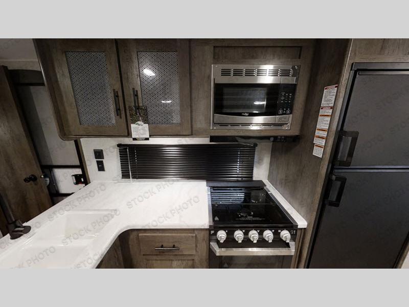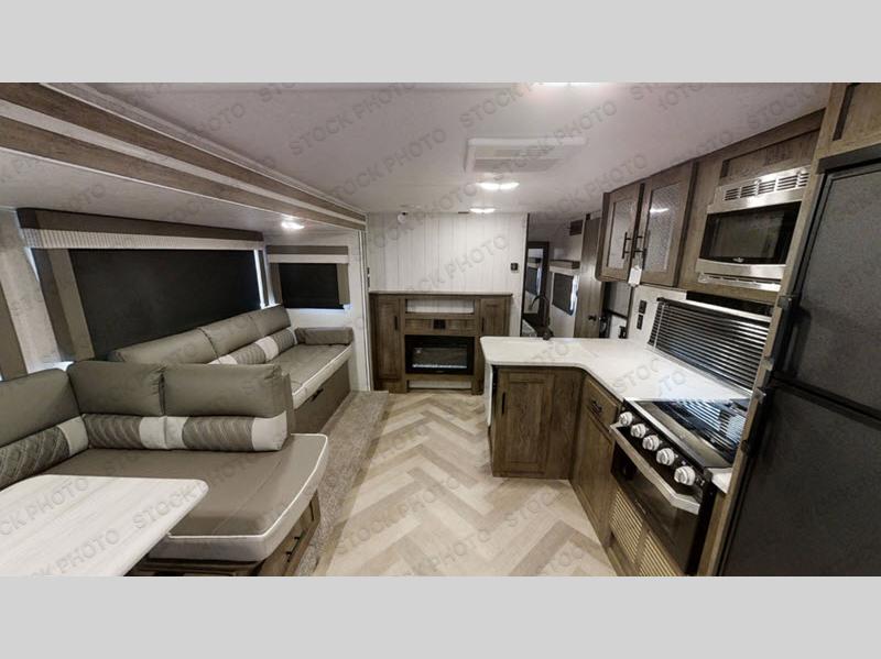 If you need a trailer that will enhance your family getaways, this Wildwood X-Lite travel trailer is it! Because of the double-size bunks in the back and the queen-size bed in the front private bedroom, your family can stretch out and sleep comfortably, and the U-shaped dinette and sofa can also transform into extra sleeping space if needed. The whole family will enjoy how accessible the full bathroom is because it contains both an interior and exterior entry door, and the entertainment center with fireplace is certainly going to enrich your time spent indoors. This trailer also gives you the ability to add an optional outdoor kitchen if you wish.
