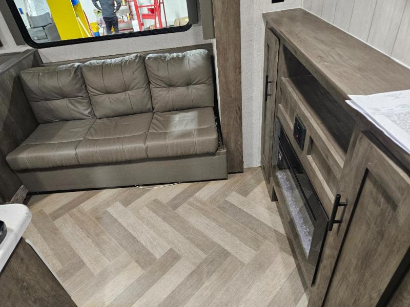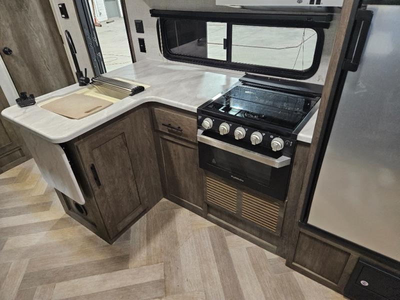 If you need a trailer that will enhance your family getaways, this Wildwood X-Lite travel trailer is it! Because of the double-size bunks in the back and the walk-around bed in the front private bedroom, your family can stretch out and sleep comfortably, and the Versa Lounge, which is made up of a U-shaped dinette and sofa, can also transform into extra sleeping space if needed. The whole family will enjoy how accessible the full bathroom is because it contains both an interior and exterior entry door, and the entertainment center with fireplace is certainly going to enrich your time spent indoors. This trailer also gives you the ability to add an optional outdoor kitchen if you wish.