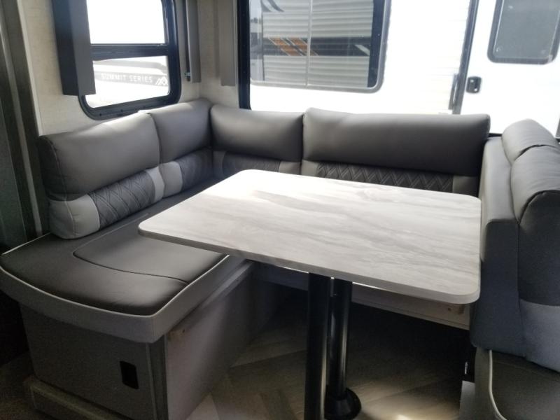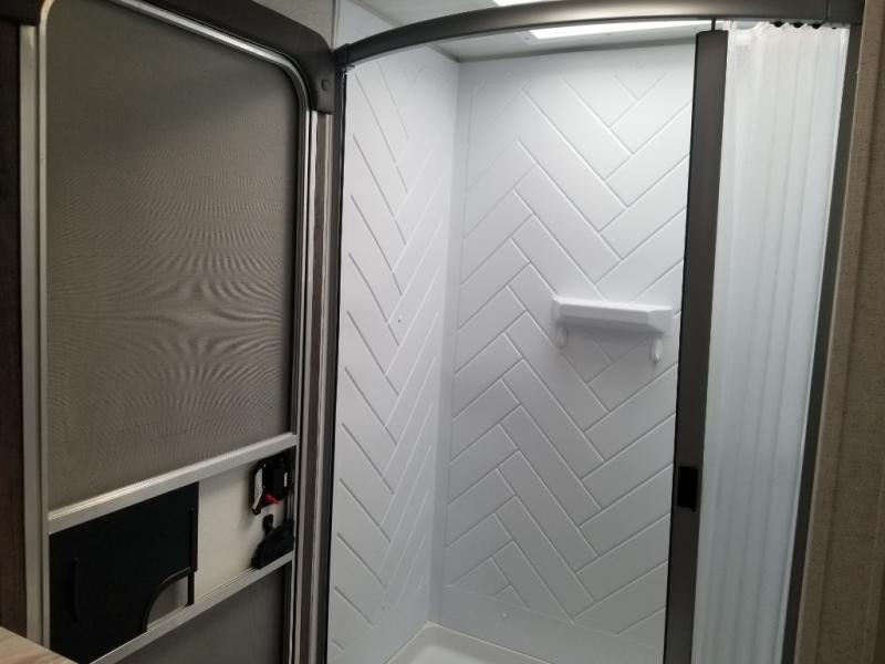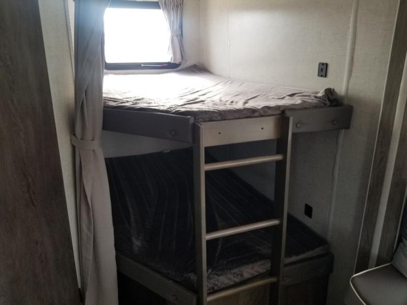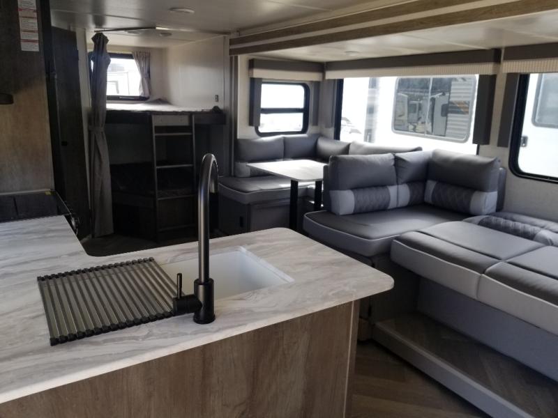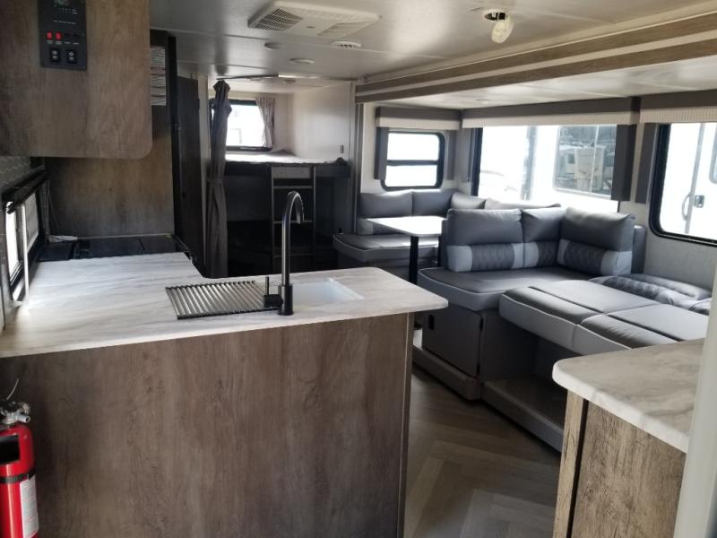 If you need a trailer that will enhance your family getaways, this Wildwood X-Lite travel trailer is it! Because of the double-size bunks in the back and the walk-around bed in the front private bedroom, your family can stretch out and sleep comfortably, and the Versa Lounge, which is made up of a U-shaped dinette and sofa, can also transform into extra sleeping space if needed. The whole family will enjoy how accessible the full bathroom is because it contains both an interior and exterior entry door, and the entertainment center with fireplace is certainly going to enrich your time spent indoors. This trailer also gives you the ability to add an optional outdoor kitchen if you wish.
