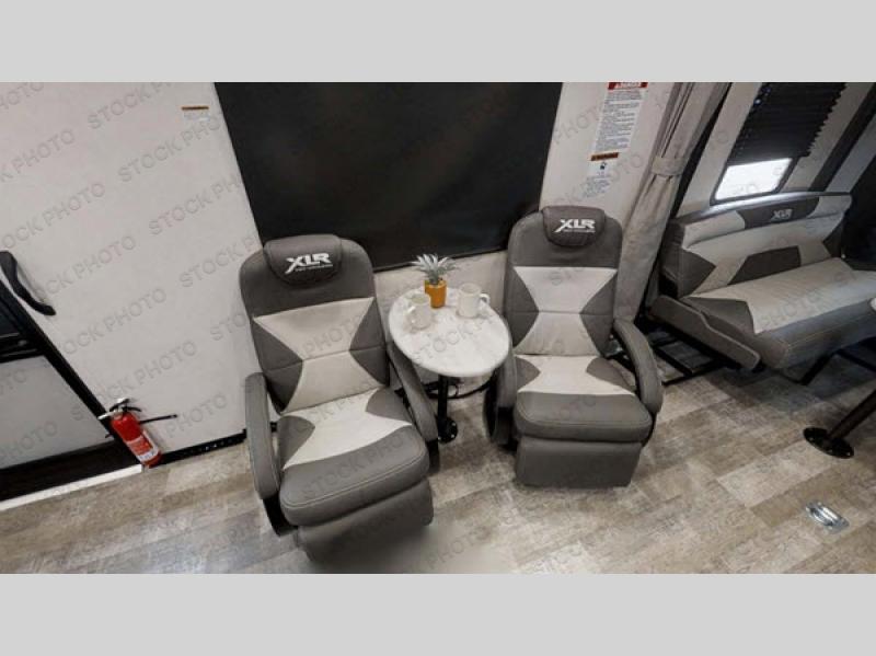 Make your weekends extraordinary with this XLR Hyper Lite toy hauler! A set of lounge chairs will provide relaxation after you have come back from hiking the trails and scaling the mountains, and you will be able to clean up from those muddy adventures with the radius shower in the dual-entry bath. The single slide in the kitchen will give you more space to enjoy yourself while you create delicious meals for the family in the 17" oven or on the cast-iron three-burner cooktop, and once you are ready to rejuvenate yourself for tomorrow, you can head to the electric bunk, opposing sofas, or queen-size bed.