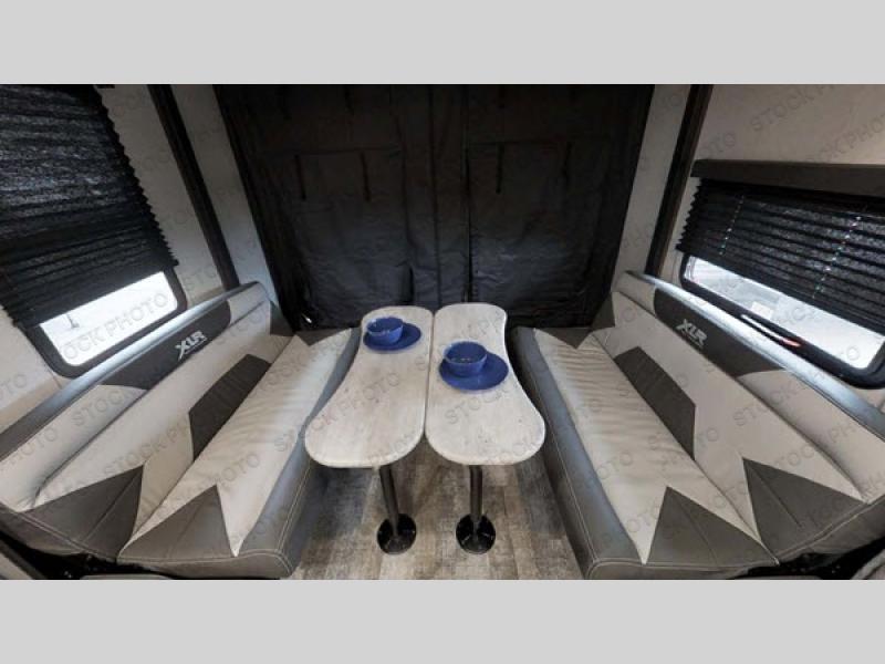 Forest River's XLR Hyper Lite toy hauler is affordable, half-ton and three-quarter-ton towable, lightweight, and very functional! These units are the epitome of action camping, and they are ready for the adventurer who wants to get out and live life to its fullest. The XLR Hyper Lite has been XTRA BUILT which means that you will have a unit that is simply built right to last you through all of your toughest excursions. You will be thrilled to find some of the latest technology included, like the Winegard Air 360 antenna with prep for WiFi & 4G LTE, the dual-zone sound bar with built-in subwoofer, the exterior speakers, the USB charging stations, and the 39" TV in the living area. The garage is completely primed and ready to go with its 20-gallon fuel station, 5,000-LB cargo tie-downs, insulated floor, black rear privacy screen, insulated weatherproof ramp door, and ramp patio cable kit. Plus, you also have an excellent list of options that you can add to your unit, like the optional VIP party deck and solar package.