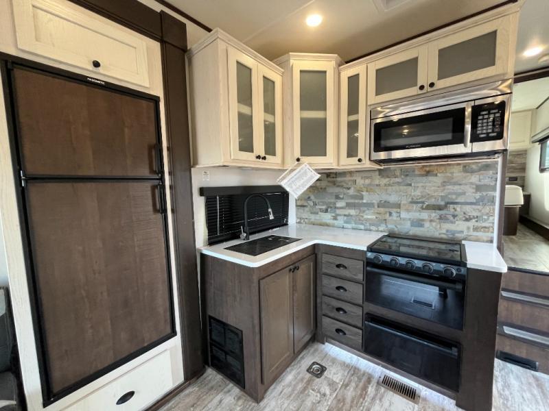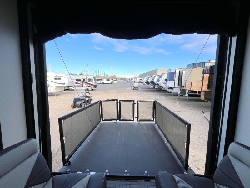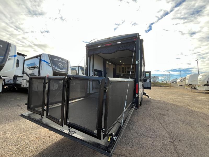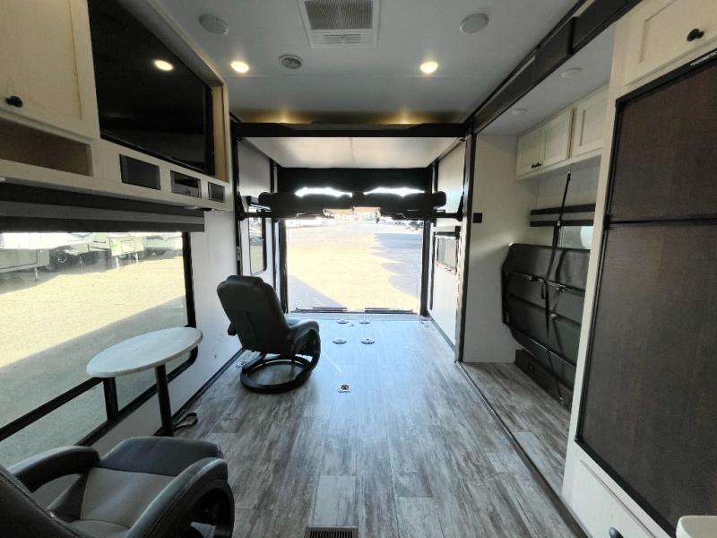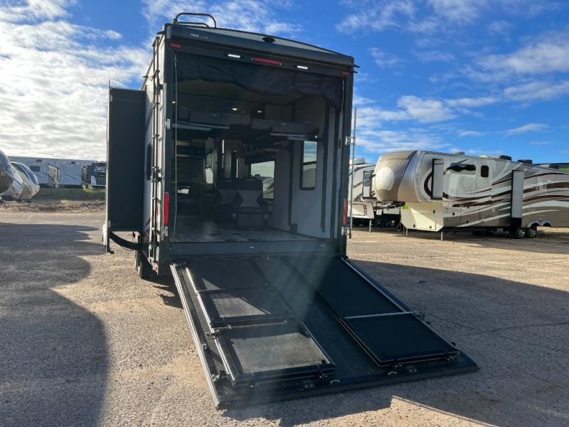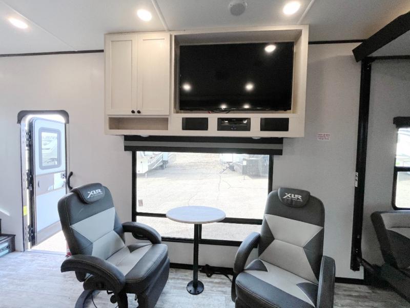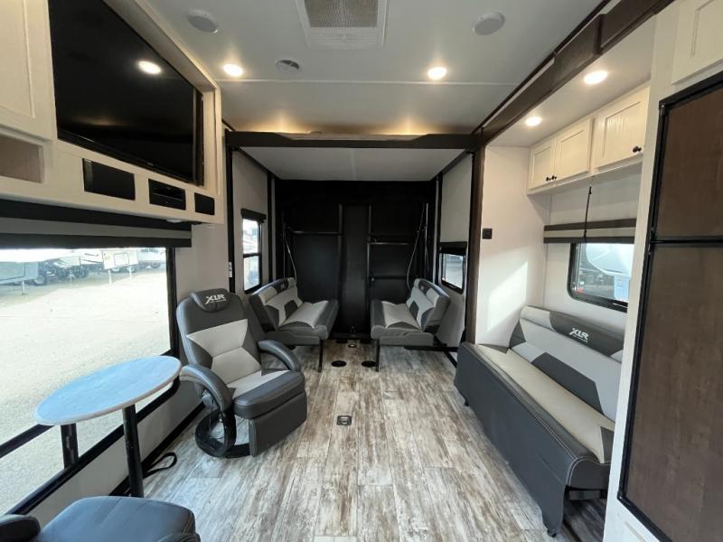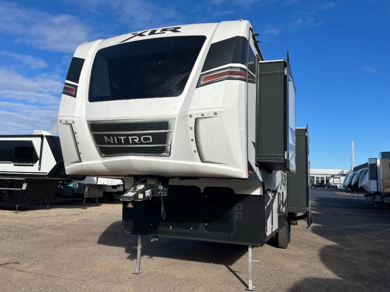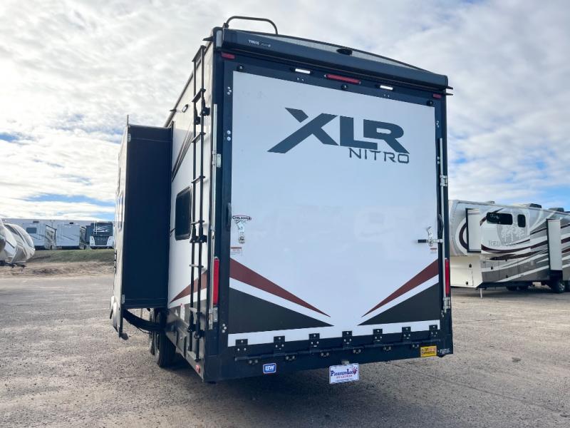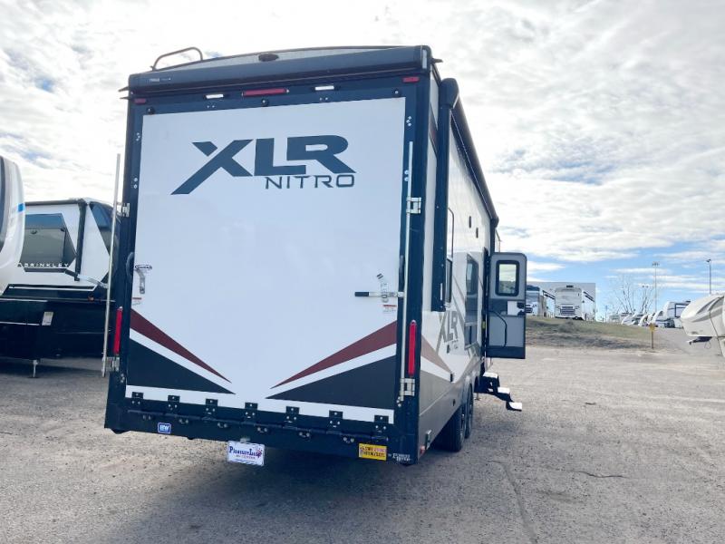 With any XLR Nitro toy hauler fifth wheel by Forest River, you can load your toys up the weatherproof insulated ramp door onto an insulated garage floor with 5,000 lb. cargo tie downs to secure your toys while traveling. The retractable panoramic screen will allow fresh air to flow inside and the 30 gallon fuel station will keep the fun going! Each is built with Xtra engineering which means a stronger platform to handle the adverse conditions of Mother Nature on extreme terrain, a radius roof for more interior space, vacuum-boned aluminum framed sidewalls, laminated and insulated slide room walls, plus a fiberglass front cap with an automotive windshield for a sleek exterior and great views from the interior. There are hardwood cabinet doors, black cabinet hardware, solid surface kitchen countertops, and living area dimmable lighting to mention a few more highlights. Start exploring your active side, choose a XLR Nitro today!
